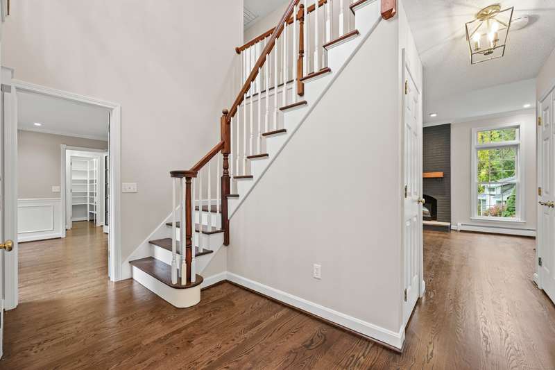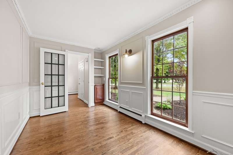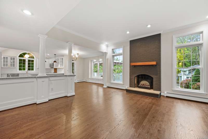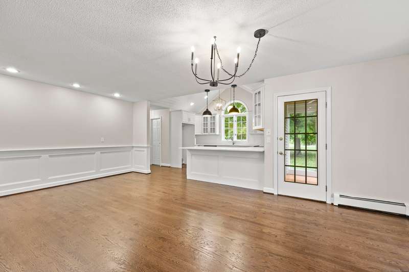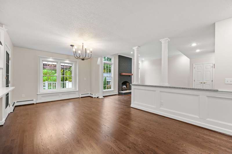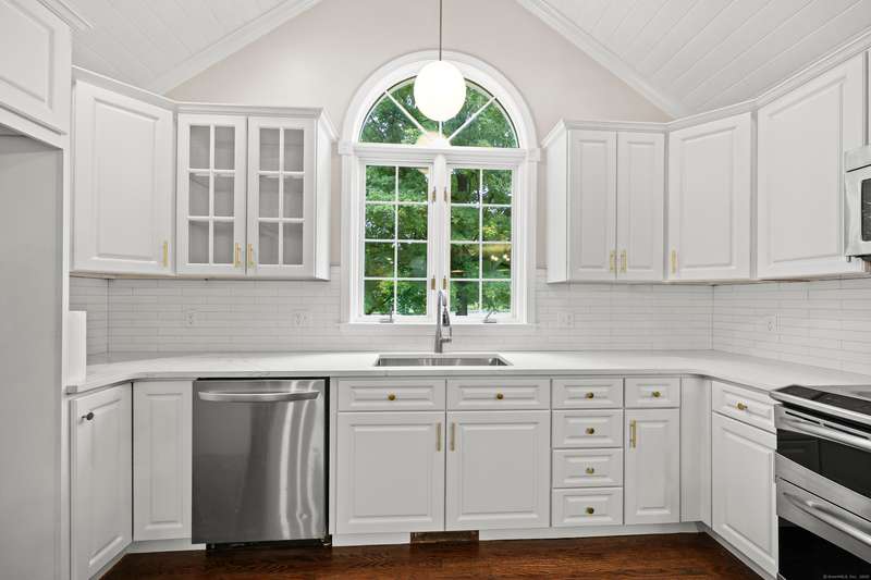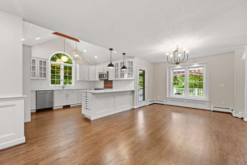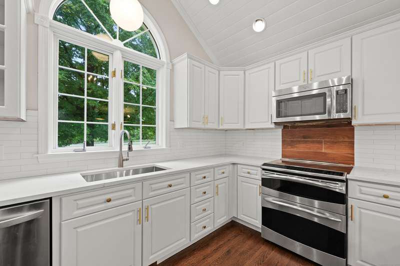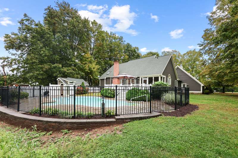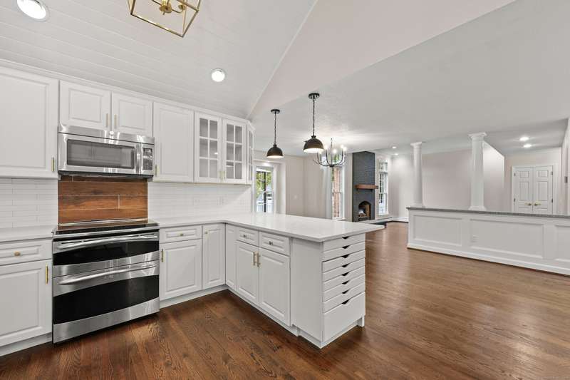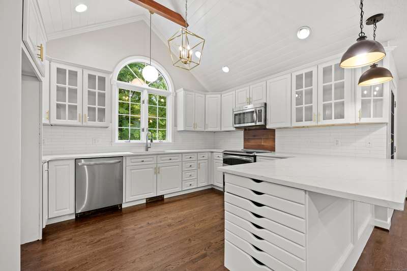 Dreaming of a home that feels like a private retreat - yet close to everything? Welcome home to this beautifully designed custom home just steps from the South Windsor line - where timeless New England architecture meets relaxed modern living. Curb Appeal is off the charts!! Stunning. Set on a private, park-like lot surrounded by mature trees, this home invites you to live, gather, and entertain in style. Inside, an open and airy layout showcases freshly refinished hardwood floors, crisp white millwork, and abundant natural light. The showstopper kitchen is a dream - soaring vaulted ceilings with shiplap detail and a striking wood beam, quartz countertops, stainless appliances, and a generous island for everyday living or weekend entertaining. The open flow extends to a gracious dining and living area with elegant lighting and a cozy fireplace, ideal for holidays and heartfelt gatherings. Step into the three-season room or out onto the expansive deck overlooking your own backyard oasis