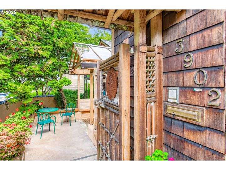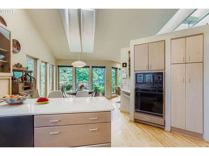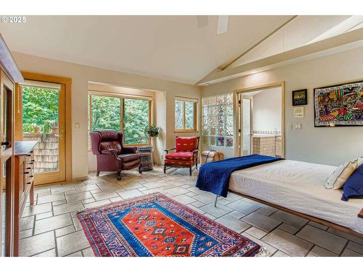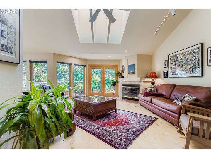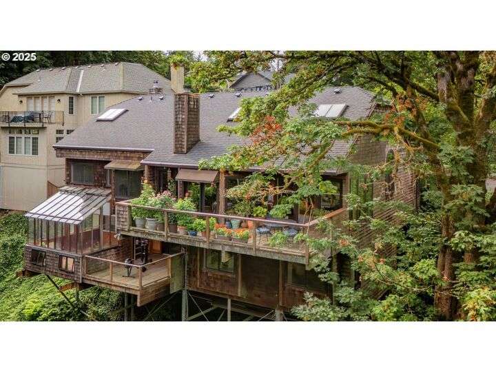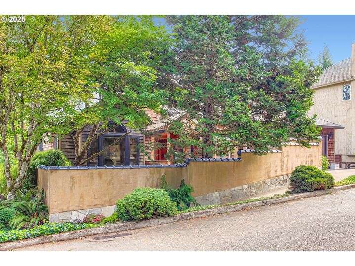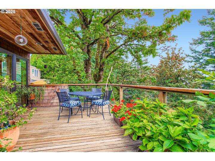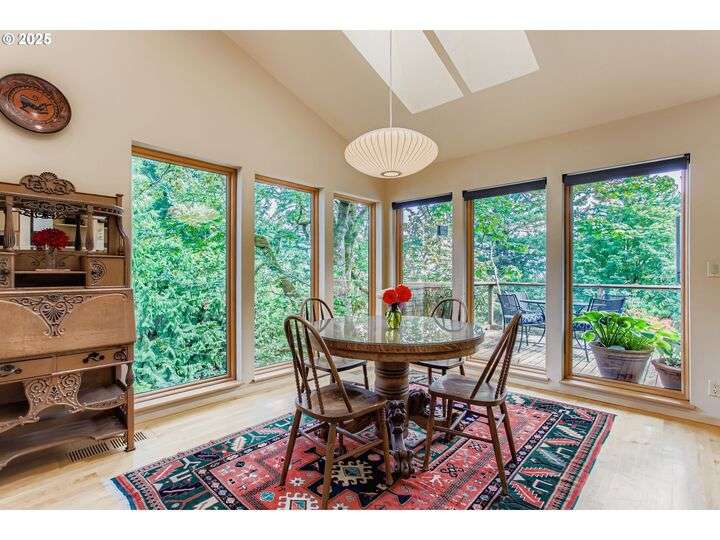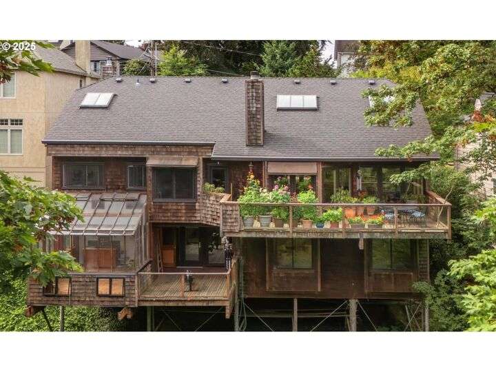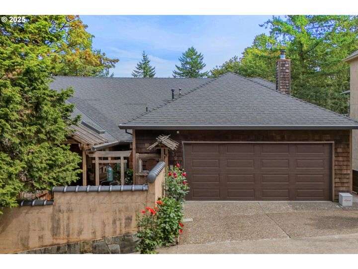 Designed by award-winning Alan Mascord, this light and airy contemporary takes full advantage of its Council Crest setting with vaulted ceilings, skylights, and forest backdrop. A Japanese garden-style entrance and all-season porch open to a spacious foyer. Formal dining with barrel wood ceiling and built-ins, seats 10 with garden views. Sunny kitchen with new gas cooktop, Corian counters, built-ins, and eat-in-bar flows to a nook with deck access and forest views. The living room with gas fireplace completes the open layout. The main floor primary suite opens to the deck and features a reimagined design with a Japanese-style soaking tub, a walk-in shower, and walk-in-closet. A half bath, laundry, and attached two-car garage complete this level. The lower-level family room is a cozy hangout for movie nights with custom bookshelves, an eat-in bar, and a newer Jøtul wood stove. Sellers added a Sturdi-Built cedar and redwood greenhouse that supports year-round gardening, provides passive solar heat, and offers a space for winter exercise. Two additional bedrooms and a bathroom complete the lower level. A private sauna enhances comfort. Anderson double-paned wood windows and sliders in most of the home. Upgraded systems over the years. Wired for 220 car charger. Newer garage door. Outdoor living includes covered front and back decks, gardens visited by many bird species, and peekaboo Mt. Adams views. The shade garden, anchored by Hinoki Cypress and Japanese Snowbell, inspired the entry’s transformation with a hand-built Japanese-style wall, custom gate, “black rock river,” and fountain, creating an ever-evolving garden retreat. Enjoy nearby Healy Heights and Council Crest Park or the 3.5-mile Fairmount Loop. Forest trails connect to Marquam, Washington Park, and Downtown via the 4T and Council Crest loops. Five minutes to OHSU with quick access to downtown, Hillsdale, Raleigh Hills, and Sunset Highway. After 29 cherished years, this home is ready for its next chapter.