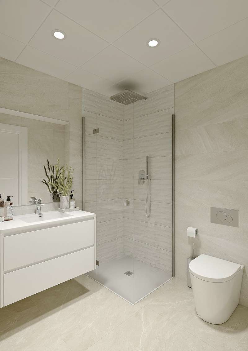 The apartment for sale in Torrevieja, Alicante features a spacious open-plan layout, maximizing natural light and enhancing the connection between indoor and outdoor living. The residences offer two or three bedrooms, with the master bedroom benefiting from an en-suite bathroom. There are two stylish bathrooms in total, and the living room seamlessly opens up to a sunny balcony, offering beautiful views of the surroundings. Built with high-quality materials, the apartments feature glass shower screens, underfloor heating in the bathrooms, an energy-efficient aerothermal system for hot water, pre-installed ducted air conditioning, and generous built-in wardrobes.