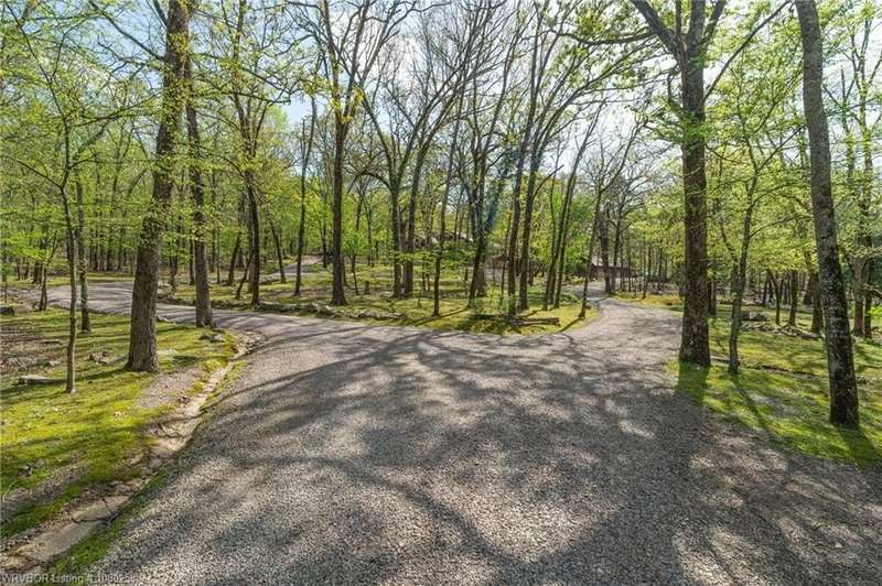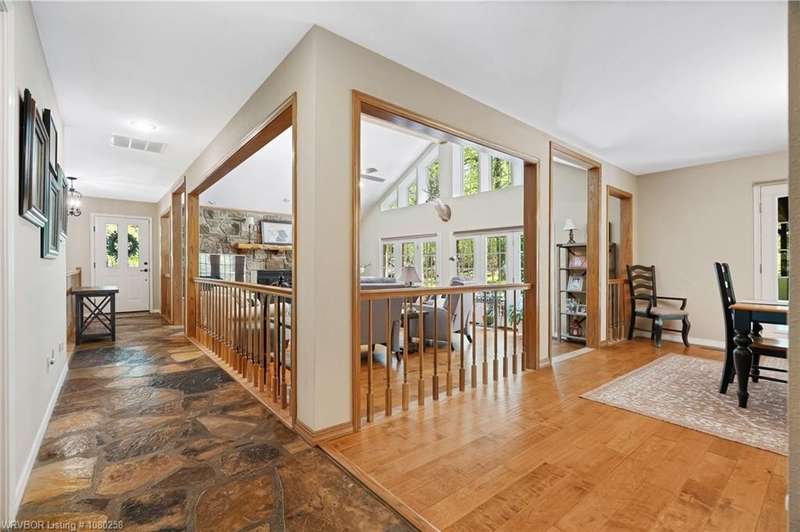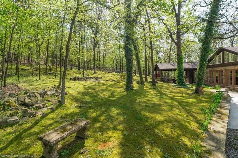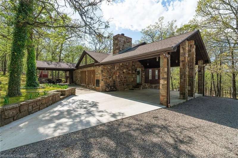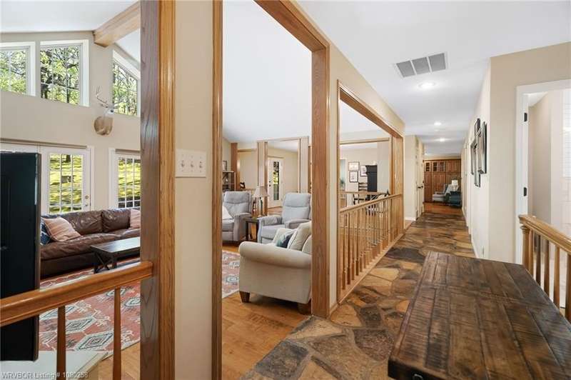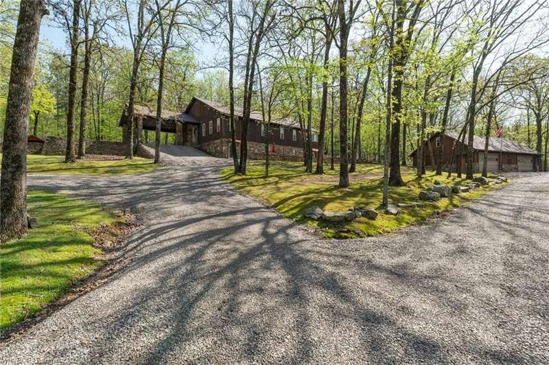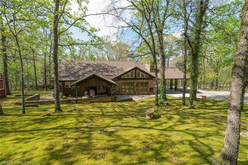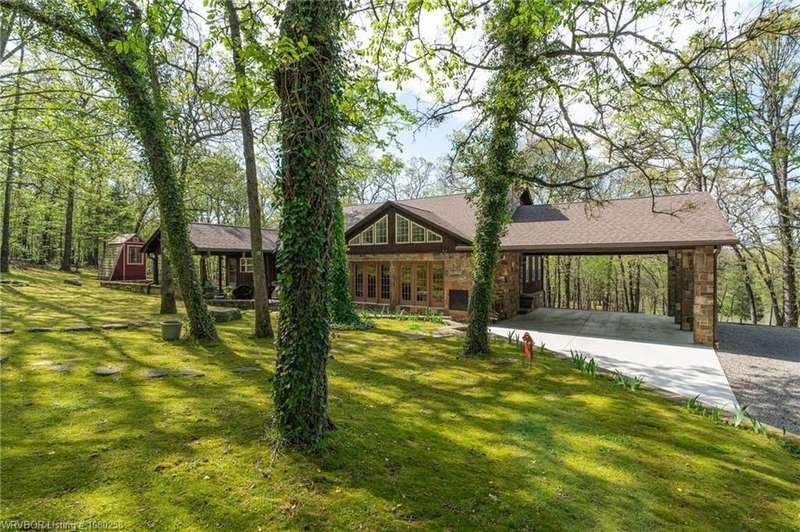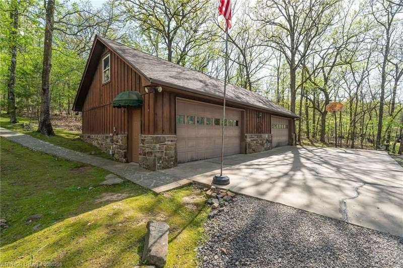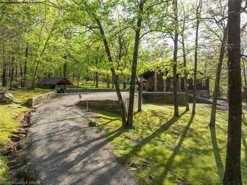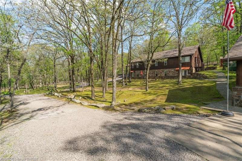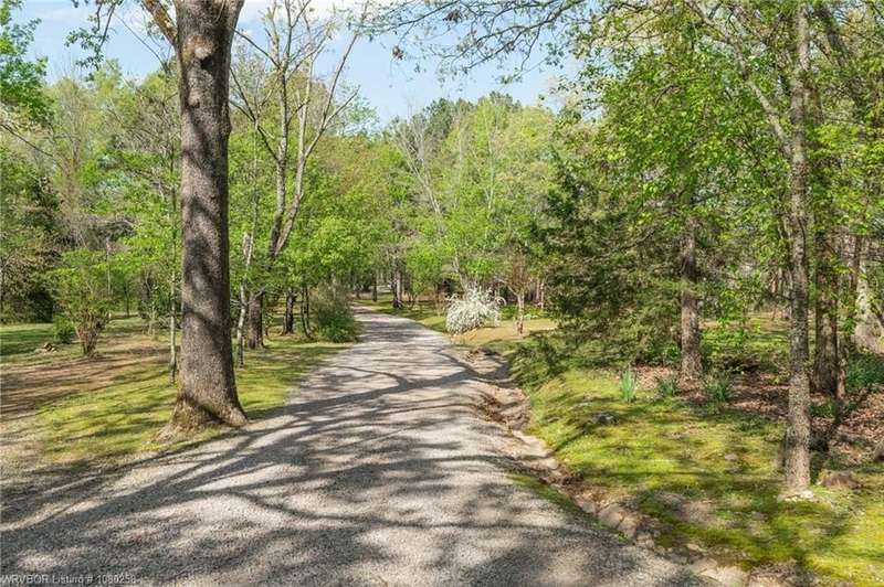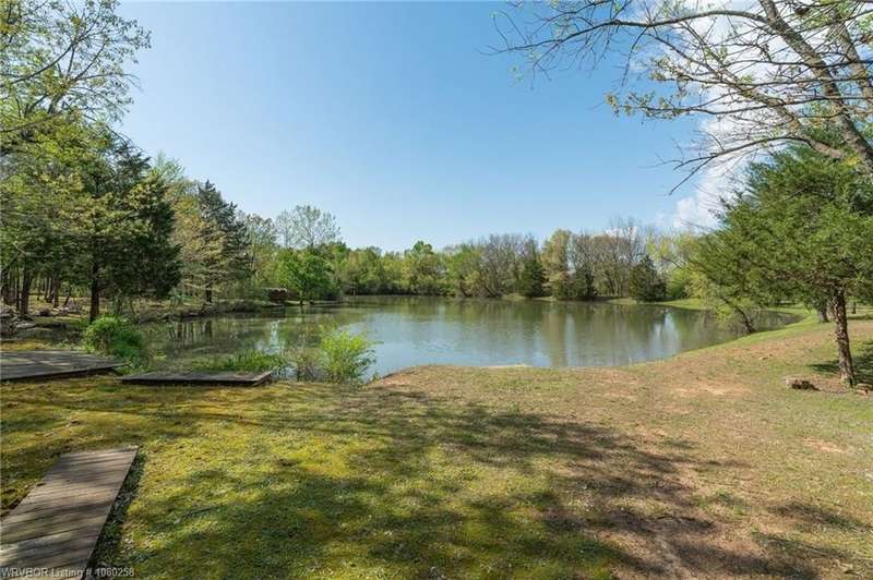 Experience the charm of a European farmhouse-style residence that effortlessly blends rustic elegance and modern comfort within its two-story rock and cedar structure, set on 20 acres of meticulously landscaped park-like grounds. An enchanting 1.7-acre stocked pond invites serene moments and wildlife observation, while a spacious carport and a detached 4-car shop/garage cater to enthusiasts and storage needs, with unique custom rock work throughout by the talented artisan Elmo Kimmons adding character to the exterior. Inside, the interior showcases flagstone and engineered hardwood floors. While vaulted ceilings adorned with transom windows fill the space with natural light. The cozy living area boasts a stunning wood-burning fireplace, complemented by a charming craft/hobby room that beckons creativity. Remodeled bathrooms exude stylish designer aesthetics, the primary features dual vanities, a jetted soaking tub, and an indulgent walk-in shower. The kitchen captivates with warm tones, natural granite & quartz countertops, sleek stainless steel appliances, and elegant solid oak cabinetry with built-in storage from floor to ceiling. This exceptional farmhouse is designed for comfort, offering a tranquil primary suite along with a guest bedroom upstairs, while the lower level encompasses two additional bedrooms, a full bathroom, a rec room/second living room with serving bar, and a versatile flex space that can also serve as a fifth bedroom. Outdoor living flourishes with a charming covered patio adjoining the dining area and a rock terrace the full length of the home just off the rec room, both providing enchanting vistas and a perfect setting for gatherings and entertaining. In addition there is over 600 square feet of unfinished acclimated storage, the possibilities are endless. Just off Highway 10 West, this remarkable property offers a rare opportunity to embrace idyllic country living while enjoying convenient access to the Greenwood School District.