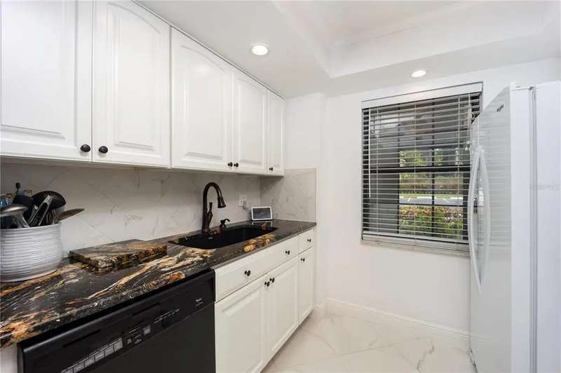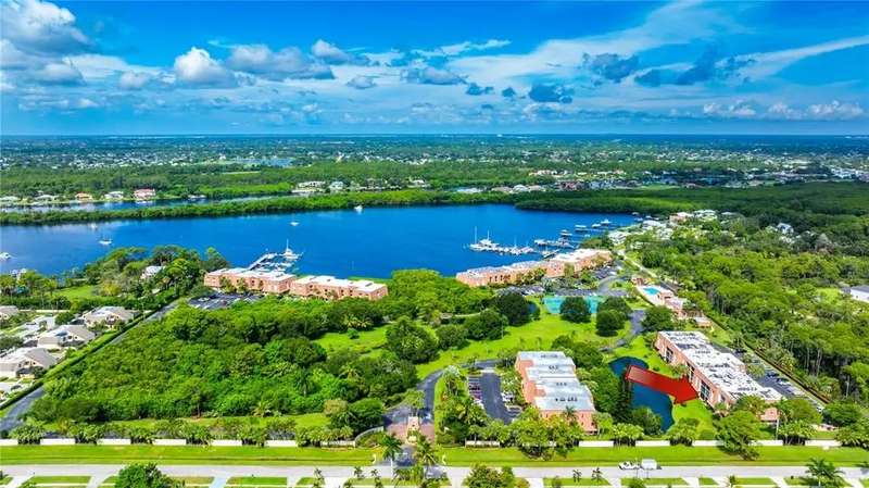 Boaters Paradise! All water enthusiasts come see this Beautiful home. You will love the very affordable Boat docks that rent annually. Boater or not you will love this friendly 55 plus community that offers a true resort style. Walk to the water edge of Kitching cove to enjoy the Beautiful Sunsets or walk thru the lush green park like complex that includes a private lush orchard with a variety of fruit trees all for you as a resident. You will enjoy the large pool, exciting pickleball, to watch or play, tennis courts, clubhouse with billiards and library, outside Grills and Picnic area, Storage, kitchen, Sauna, Street lights, Elevators, all for your enjoyment. You will love the DIY large workshop. Come see this lovely updated open concept home. You would enjoy the lanai with peaceful views of the pond and fountain. Inside the 1,314 sq. ft home you have 2 oversize bedrooms and 2 updated baths and lots of closet space. A nice laundry room with storage. The Air Conditioner is 2 years old, water heater is 1 year old. If you want low maintenance living, this is it. HOA includes internet and cable, water and sewer, Trash, landscaping, all exterior maintenances including roof and insurances. No flood insurance needed. Move in ready, Don't miss this fabulous home.