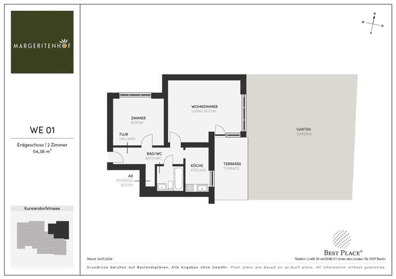 The practically designed 2-room flat with approx. 54 m² is located on the ground floor of the three-storey residential building. It has a south-east-facing terrace and a private garden, thanks to which the flat will also be easy to let in the future. The bathtub in the bathroom provides a wellness feeling and a storage room provides storage space and convenience. Our modern Margeritenhof investment project offers investors practically designed, rented condominiums. The three-storey corner building was built in 1976 and has nine flats with two to three rooms and approx. 52 to 83 m². The Margeritenhof also has a beautiful communal garden with a barbecue area, screened by hedges. An underground car park beneath the building offers seven parking spaces.