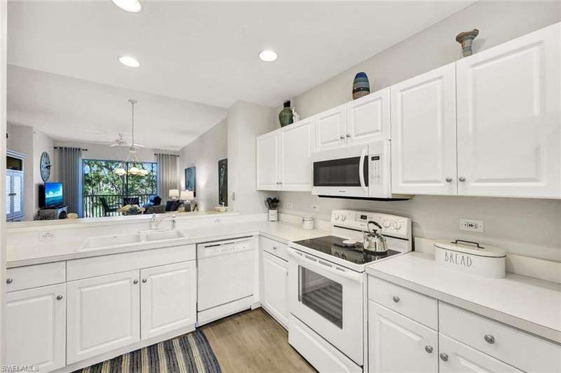 Enjoy long views of the 11th hole and two lakes from this third floor Hampton model. Just steps to one of the 3 satellite pools. Make this very well-maintained condo your own. It has higher ceilings and vinyl plank flooring in the kitchen, living areas and bathrooms. You will appreciate the many community amenities offered including bundled golf, with no waiting list to play, 3 satellite pools, a state-of-the-art fitness center with optional classes, massage services and physical therapy, and Har-Tru tennis courts where you can also play bocce and pickleball. Enjoy al fresco dining at the renovated Terrace Cafe as well as casual and fine dining, or a drink with friends at the recently refreshed clubhouse. The main pool area/activities complex is currently under construction, with a new pool and bocce courts and is expected to be completed by the spring of 2025. There are no special assessments for residents currently. Vanderbilt Country Club is very social with many organized activities and golf groups.