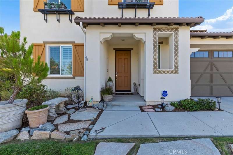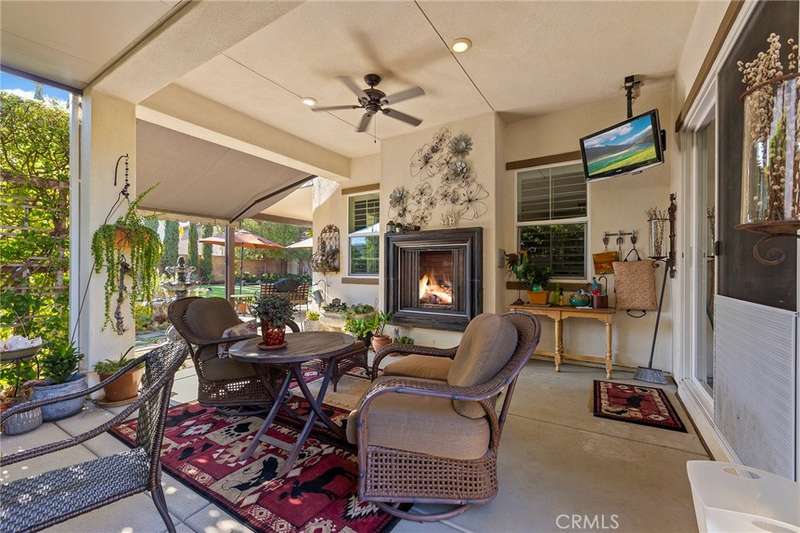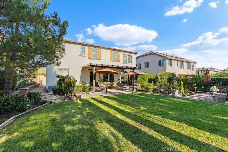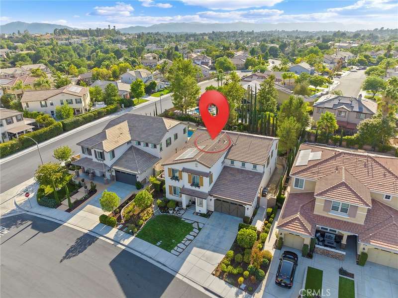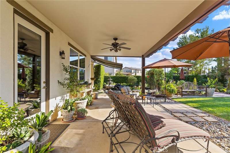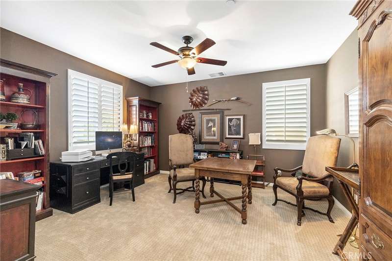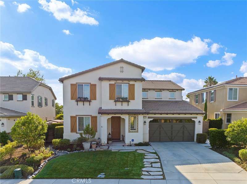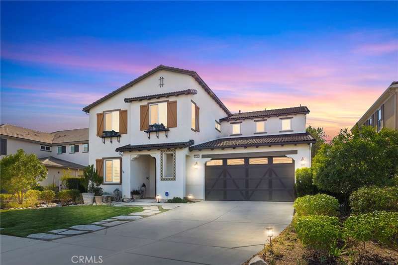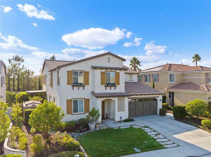 Absolutely the best in the beautiful Belle Maison community of Temecula! Located immediately adjacent to the Temecula Wine Country - this spectacular home boasts top quality upgrades and decorating in every corner, a spacious open floor plan with 5 bedrooms, 3 baths, plus office and loft, and a huge yard with two covered patios and an outdoor fireplace! The floor plan features one bedroom and full bath downstairs. There is a huge Formal Dining Room with large custom rustic chandelier, spacious open Great Room with a cozy fireplace, and Gourmet Kitchen with center island, built-in Breakfast Island attached, built-in stainless GE Monogram refrigerator and appliances, walk-in pantry, white cabinets, and more. Downstairs there is also a formal living room or office option. The stairs are lined with a wrought iron railing, and upstairs you will find a huge main suite with a large workout area/sitting room, a media room/loft at the top of the stairs, and three other bedrooms. One of the bedrooms is currently used as an office, and the office furniture is available to stay. Carpeting is absolutely the best, hardwood oak flooring and quality tile, all with a Neutral pallet, plantation shutters, custom draperies, custom lighting add to the ambiance. In the elegant backyard, you will find two covered patios, one with a fireplace, many fruit trees, flowering shrubs, cypress and pine trees, and walkways creating a private oasis. A 3-car garage with many overhead storage racks, immaculate epoxy flooring, Tesla Batteries are included, and the leased solar system provides discounted electric costs. All Televisions are included, and some of the furnishings such as the desk in the office could be available.