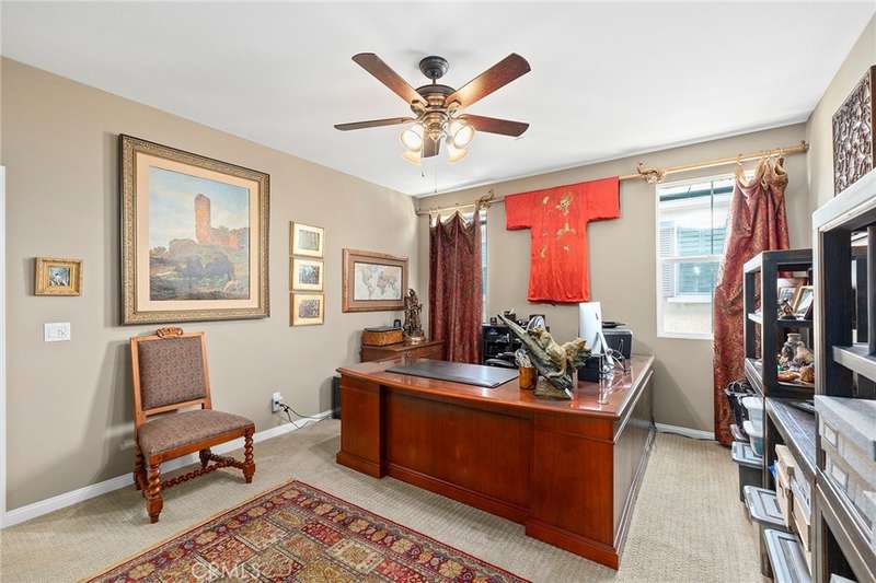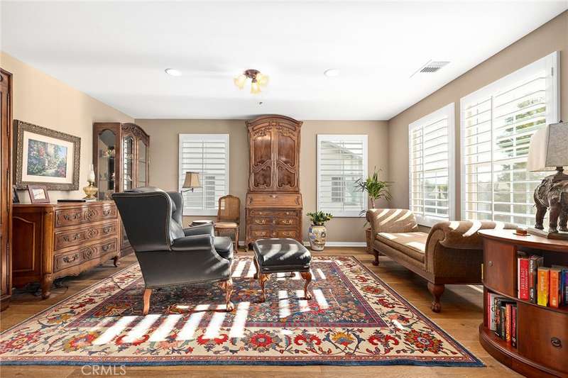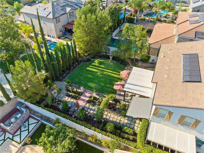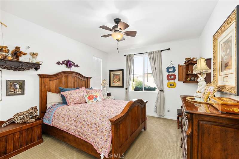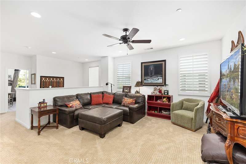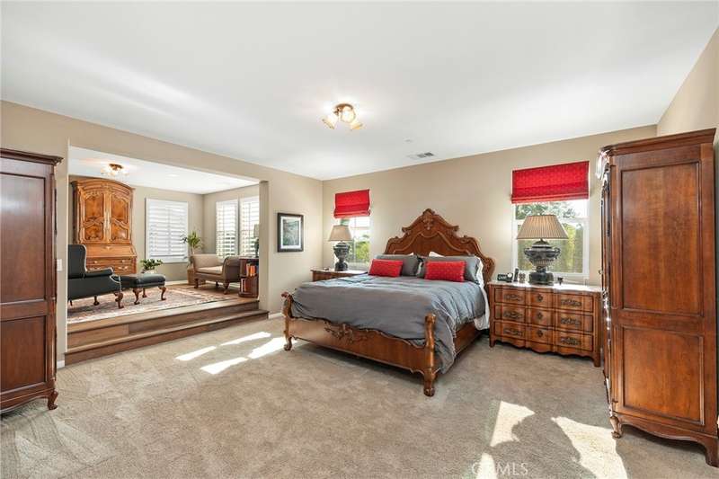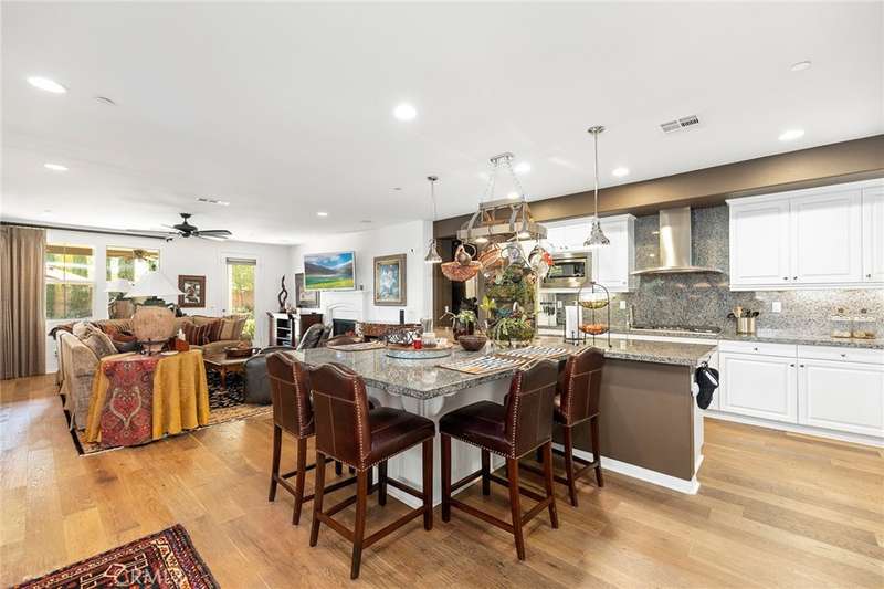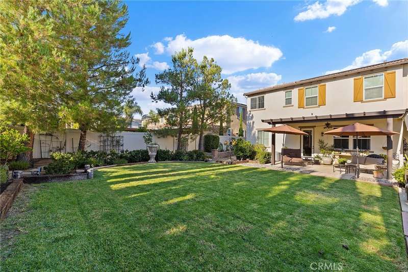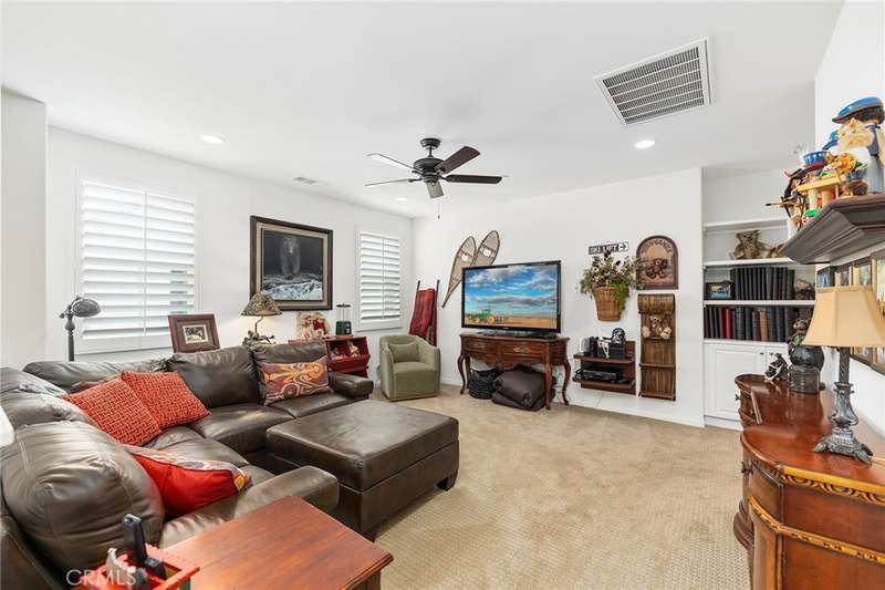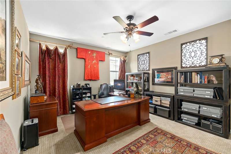 Absolutely the best in the beautiful Belle Maison community of Temecula! Located immediately adjacent to the Temecula Wine Country - this spectacular home boasts top quality upgrades and decorating in every corner, a spacious open floor plan with 5 bedrooms, 3 baths, plus office and loft, and a huge yard with two covered patios and an outdoor fireplace! The floor plan features one bedroom and full bath downstairs. There is a huge Formal Dining Room with large custom rustic chandelier, spacious open Great Room with a cozy fireplace, and Gourmet Kitchen with center island, built-in Breakfast Island attached, built-in stainless GE Monogram refrigerator and appliances, walk-in pantry, white cabinets, and more. Downstairs there is also a formal living room or office option. The stairs are lined with a wrought iron railing, and upstairs you will find a huge main suite with a large workout area/sitting room, a media room/loft at the top of the stairs, and three other bedrooms. One of the bedrooms is currently used as an office, and the office furniture is available to stay. Carpeting is absolutely the best, hardwood oak flooring and quality tile, all with a Neutral pallet, plantation shutters, custom draperies, custom lighting add to the ambiance. In the elegant backyard, you will find two covered patios, one with a fireplace, many fruit trees, flowering shrubs, cypress and pine trees, and walkways creating a private oasis. A 3-car garage with many overhead storage racks, immaculate epoxy flooring, Tesla Batteries are included, and the leased solar system provides discounted electric costs. All Televisions are included, and some of the furnishings such as the desk in the office could be available.