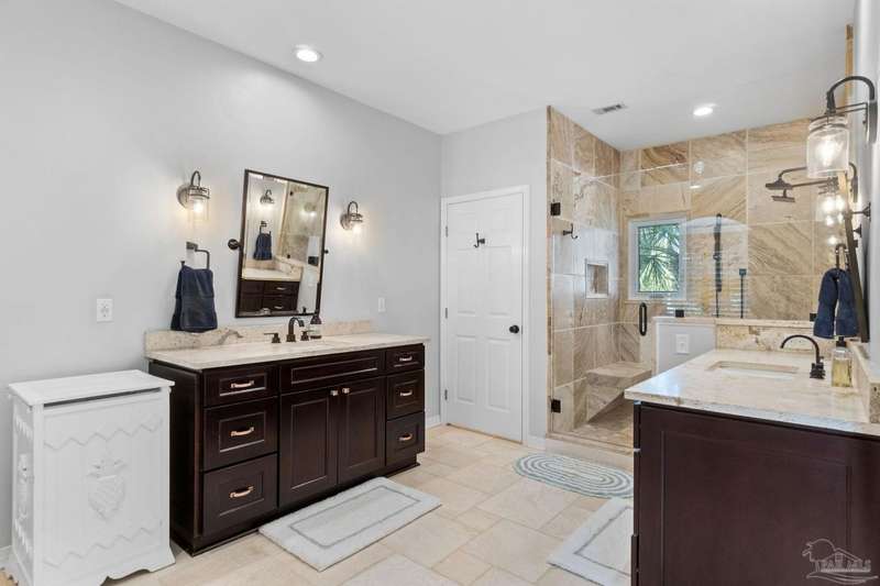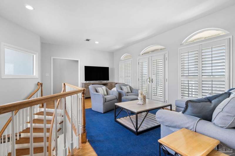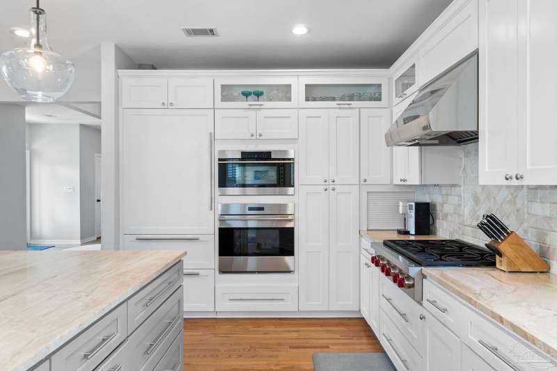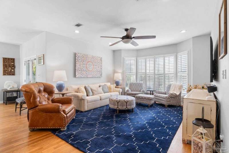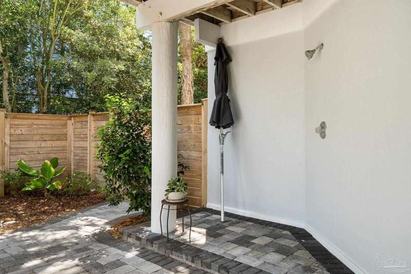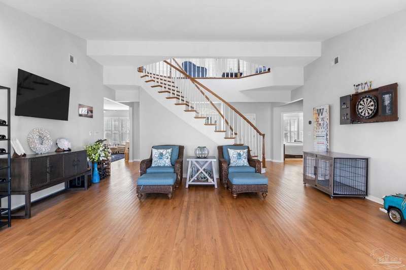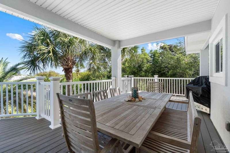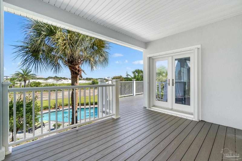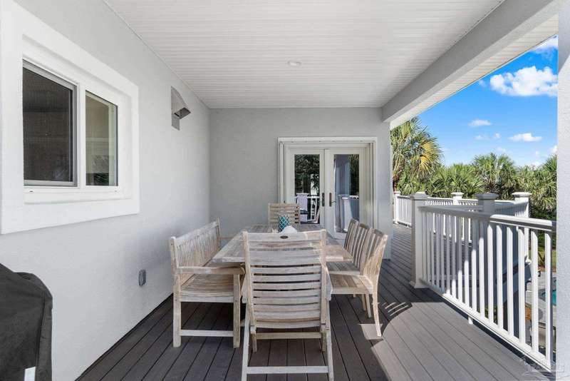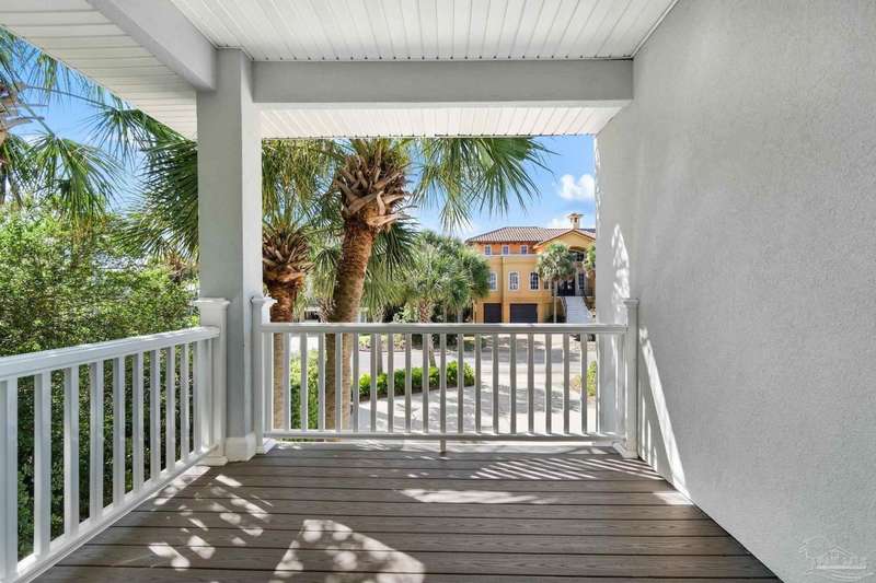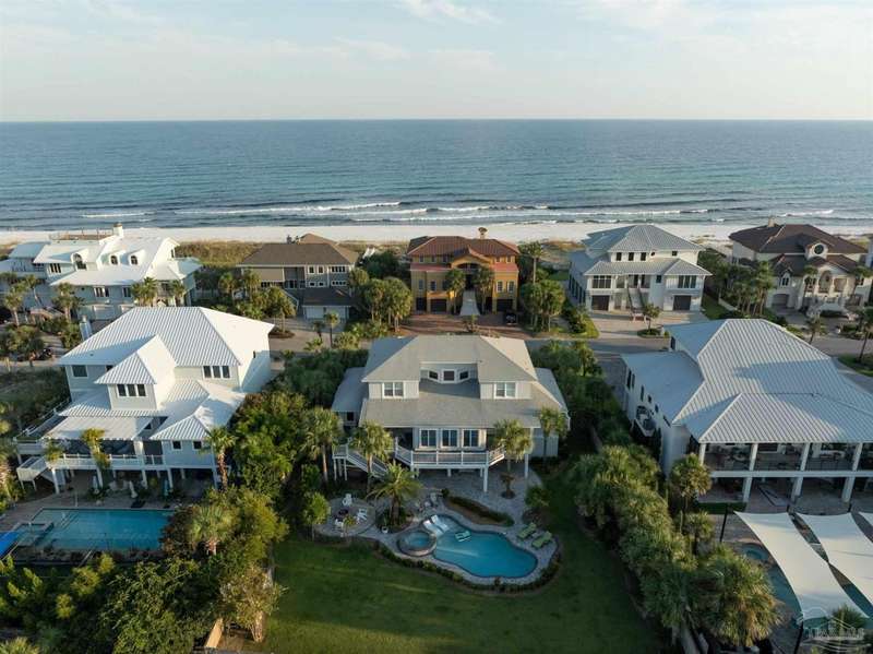 Experience the pinnacle of coastal living at 25 Calle Hermosa, a stunning stucco residence perfectly situated on Pensacola Beach. Inside, rich hardwood floors flow throughout the meticulously renovated interiors, creating a warm and sophisticated ambiance. The gourmet kitchen is a culinary masterpiece, featuring top-of-the-line Sub-Zero and Wolf appliances, custom-crafted cabinetry, and expansive countertops designed for both everyday meals and entertaining. The primary bedroom is a serene retreat, complete with a private balcony offering Gulf views, ideal for savoring morning sunrises or tranquil sunsets over the sparkling waters. The fully updated bathrooms exude spa-inspired elegance with contemporary fixtures and premium materials. A graceful winding staircase leads to an inviting upstairs sitting area with balcony, perfect for relaxation, and three additional well-appointed bedrooms. Outside, the backyard is a private paradise, centered around a shimmering gunite pool and spa, surrounded by pavers that guide you to a charming fire pit area-perfect for hosting gatherings or enjoying tranquil evenings under the stars. This exquisite home boasts an oversized garage, ideal for vehicles, beach gear, or a workshop for seaside hobbies. With exclusive neighborhood Gulf access just steps away and the vibrant Pensacola Beach restaurants just minutes away, this home seamlessly blends modern luxury with coastal serenity, making it a rare gem for discerning buyers.