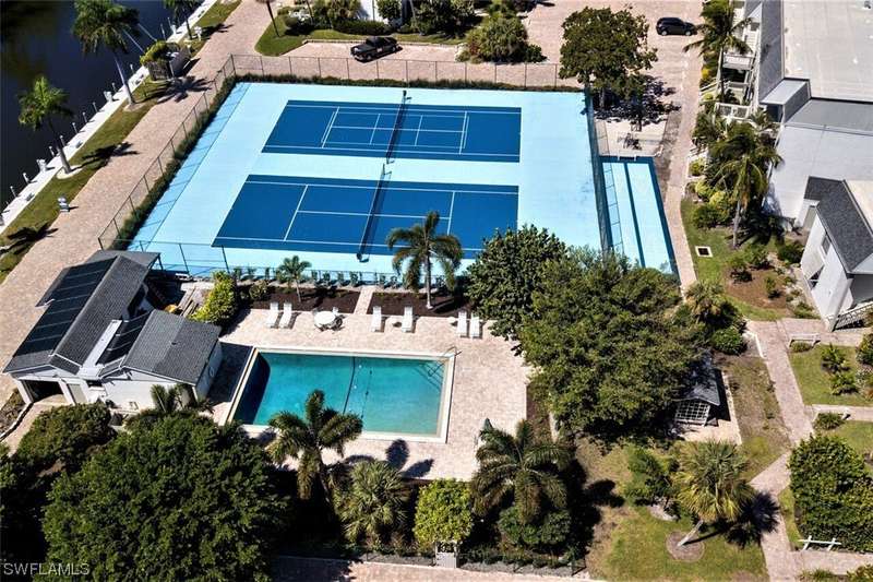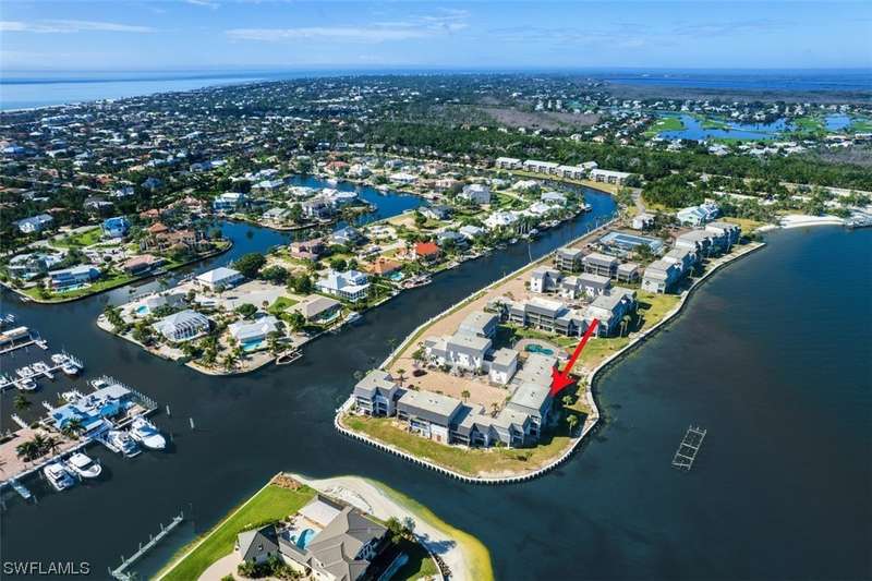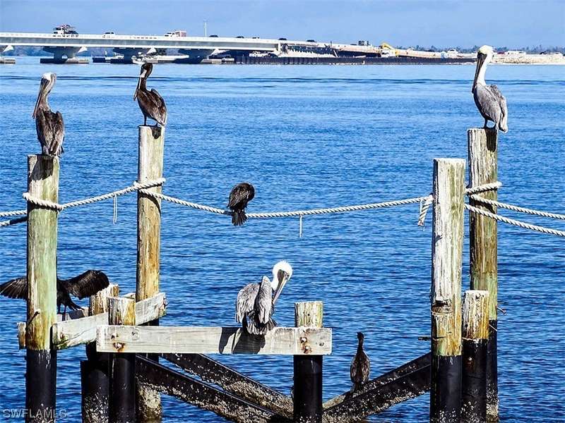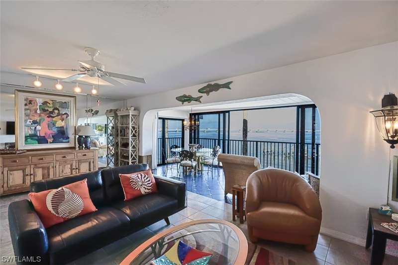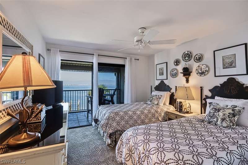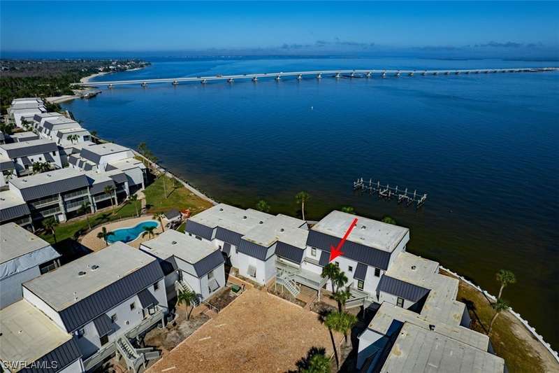 Rarely offered BAYFRONT 2nd floor townhouse offers stunning birds eye view of the Bay. Watch dolphins and manatees swim by or enjoy the sparkle of Ft. Myers lights along the shoreline at night. Stunning 2 bedroom, 2 1/2 baths townhome offers spectacular water views from every room! First floor has glassed enclosed porch for additional living/dining. Beautifully done, this condo offers a charming kitchen, high end furnishings, luxury living and unparalleled views. Second floor primary suite and guest bedroom offer spectacular water views to start and end your day. Screened porch/lanai to sit out and enjoy the activity on the bay below. Pack your toothbrush and you can move right in. Owners can occupy now!! Fully furnished and ready to entertain your first guests! Grounds and amenities being restored. Amenities include 2 pools, direct gulf access boat docs available for reasonable lease, private fishing pier - no license needed, tennis, pickleball and grilling areas. Easy on/off island. This condo has it all!