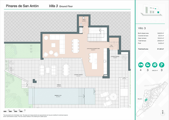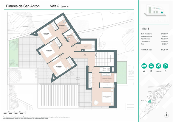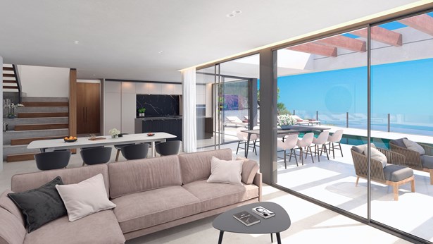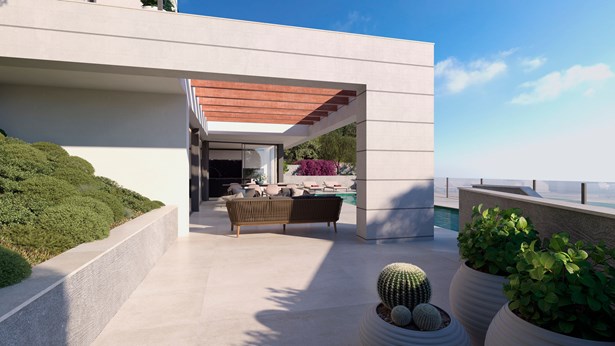Villa Haya is the 3rd villa located in the exclusive gated community Pinares Hills of Pinares de San Antón, north of Málaga City Centre. This contemporary home, part of a distinguished development, features a spacious total built area of 577 m². With floor-to-ceiling glass, the open-plan living spaces are bathed in natural light and provide stunning panoramic views. The minimalist kitchen, included in the price, can be customised to your taste and connects seamlessly to an elegant dining area, perfect for everyday living and entertaining.This villa includes 4 stylish bedrooms and 3 modern bathrooms, designed with both comfort and aesthetics in mind. The living room, featuring expansive sliding glass doors, opens to a spacious terrace with breathtaking views of the surrounding landscape. Outdoor living is enhanced by a private saltwater infinity pool, extensive south-facing terraces, and beautifully landscaped gardens. Villa Haya includes 3 dedicated parking spaces for the convenience