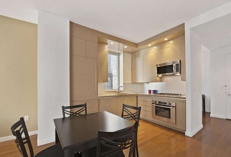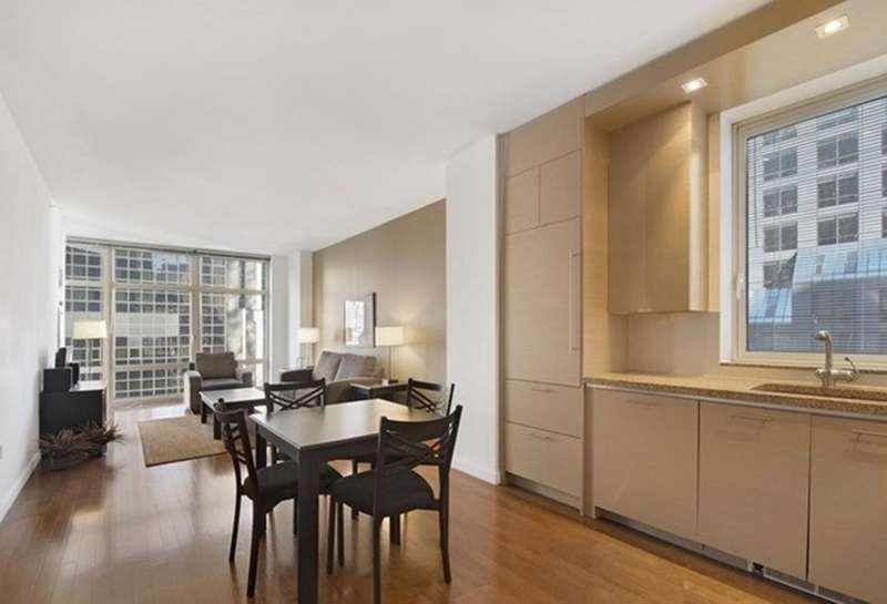 Located in a full service condominium building in the heart of New York City residents enjoy a full line of high end finishes that include an open kitchen with handsome cabinetry, warm granite countertops, full-height glass back splashes, and top-of-the-line Miele, Bosch and Sub-zero appliances, a bathroom outfitted with Kohler soaking tub, limestone countertop, and a matching vanity, as well as hardwood floors throughout, generous storage, and washer and dryer for your convenience. Floor to ceiling windows and high ceilings add to the openness of this unit.