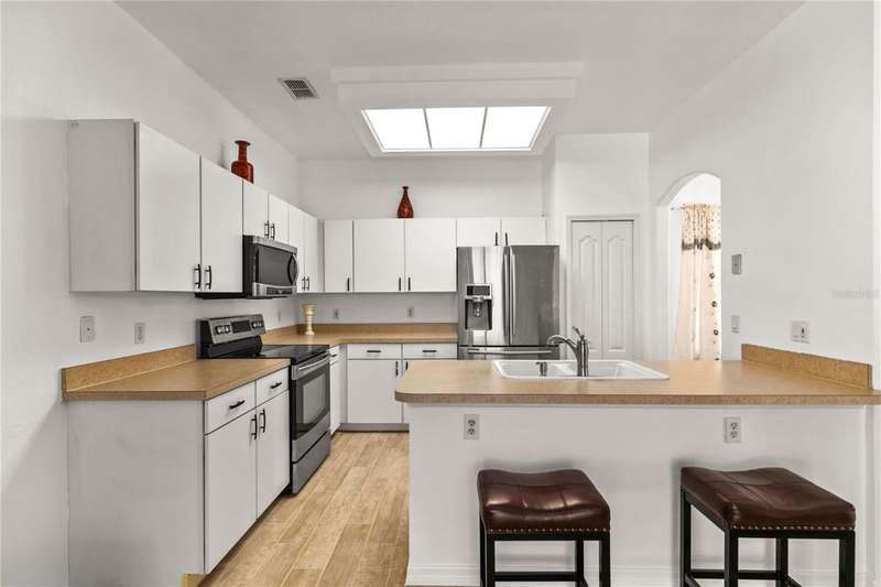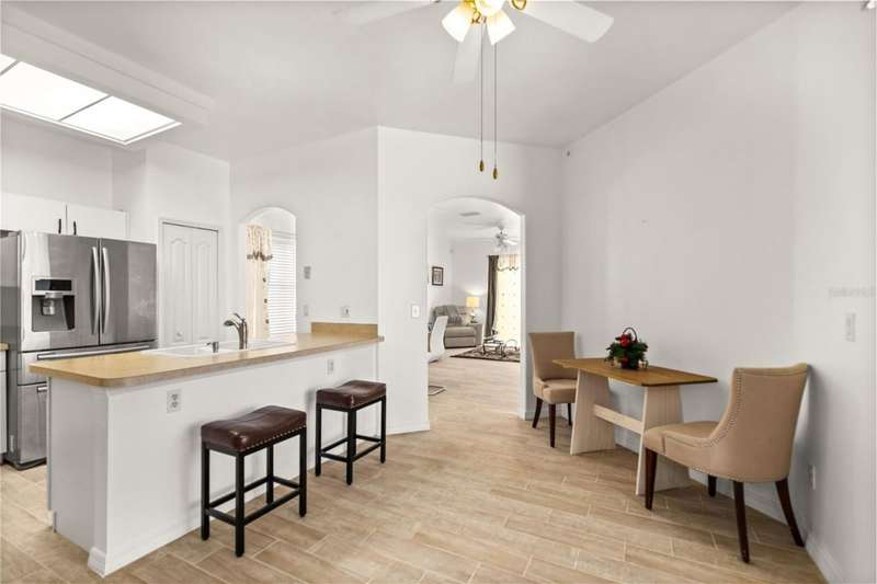 Welcome to Kings Ridge, a vibrant 55+ golf course community offering resort-style living with endless amenities! This community is centrally located with shopping, restaurants, and medical less than 15 minutes away; theme parks and downtown Orlando 30 minutes and Orlando Airport is 45 minute drive. This MOVE-IN-READY 2-bedroom, 2.5-bath St Ives model home includes a versatile office that could serve as a third bedroom. Enjoy a relaxing day/evening in your own private atrium - a perfect retreat for soaking up the sun or nurturing your favorite plants. Recent upgrades include new ceramic plank flooring, freshly painted interior and new appliances. The guest suite offers comfort and privacy with its own walk-in closet and bathroom, while the open living and dining area creates a bright, welcoming flow. The washer and dryer are included, and exterior painting is scheduled for 2026 (covered by the HOA). Kings Ridge features 3 pools, saunas, hot tubs, ice bath, 2 gyms, tennis, pickleball, bingo, 'mingo, billiards, game rooms, a library, ballroom, and so much more! Come make this beautiful home and active community your new lifestyle. HOA fees include free internet, telephone, cable tv, yard maintenance, irrigation and exterior painting.