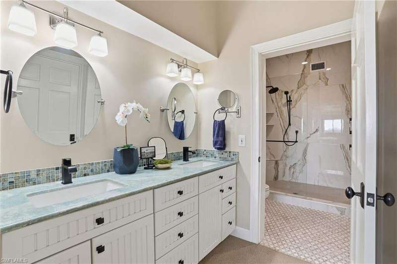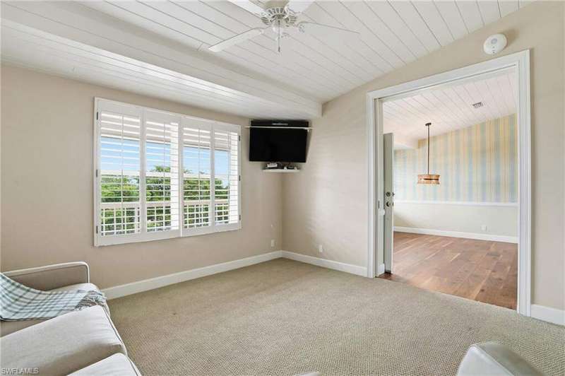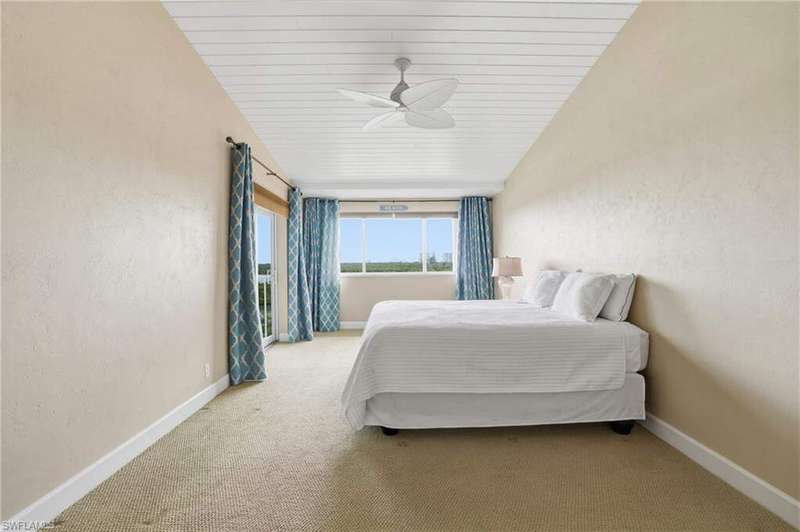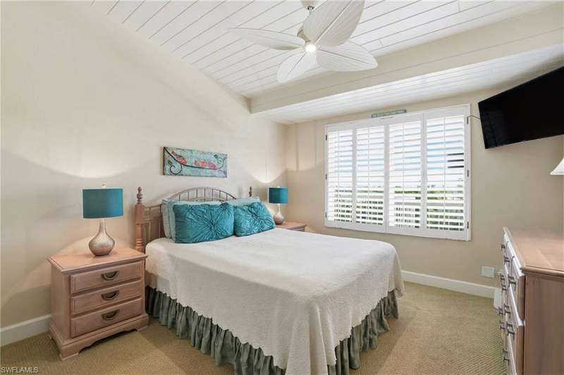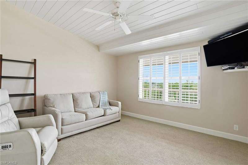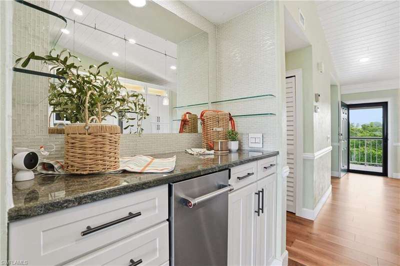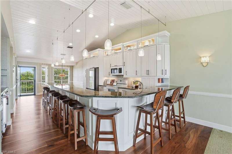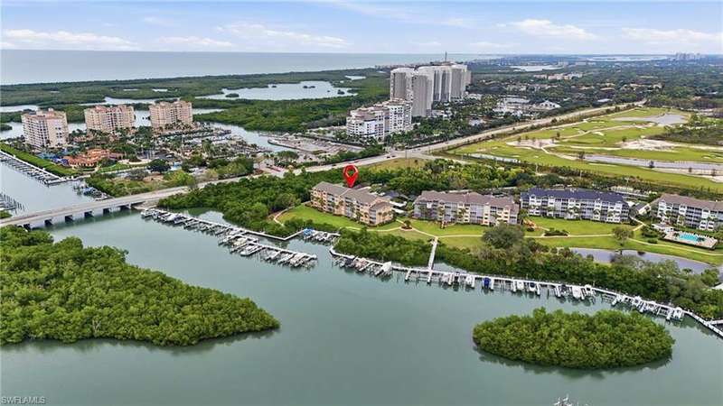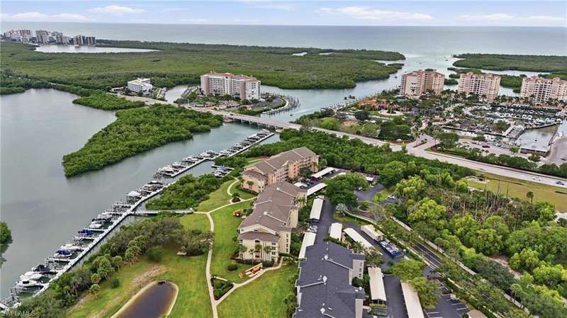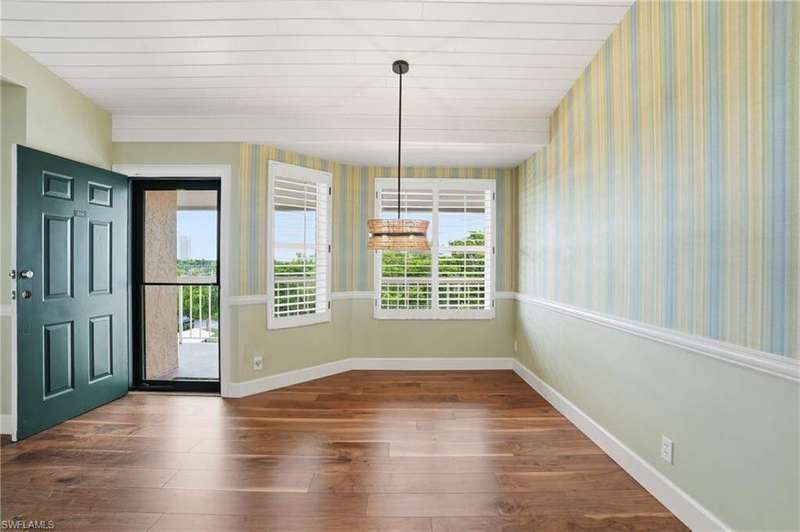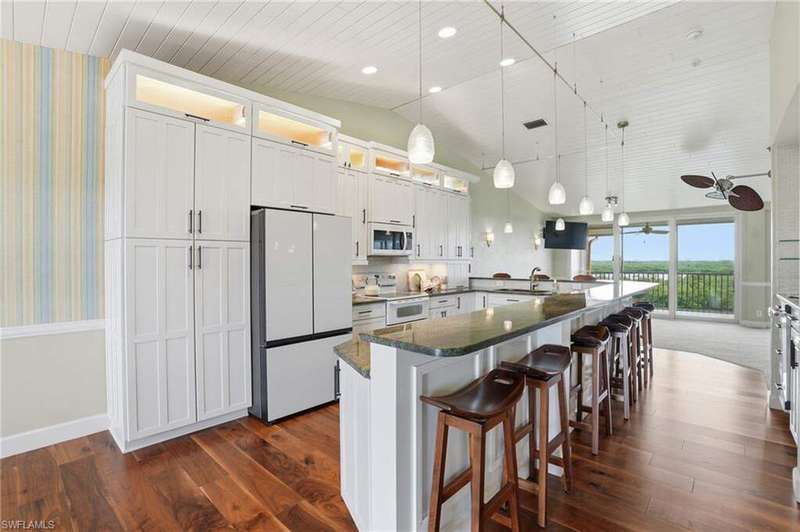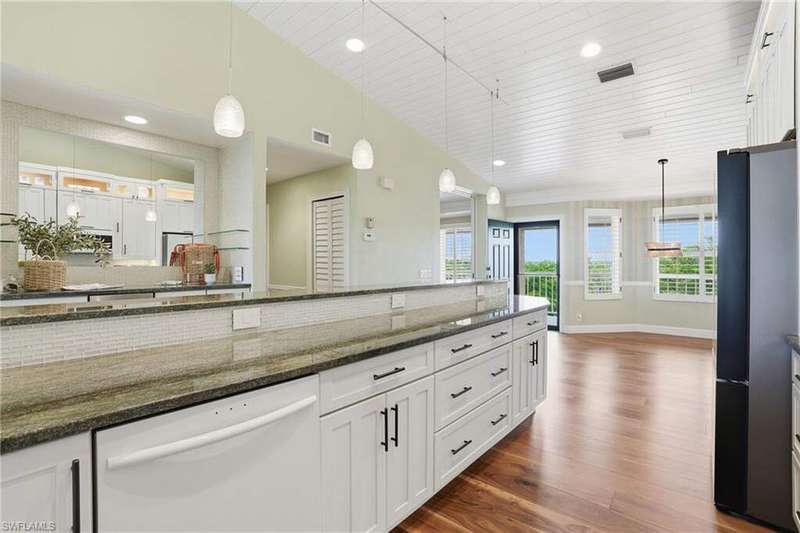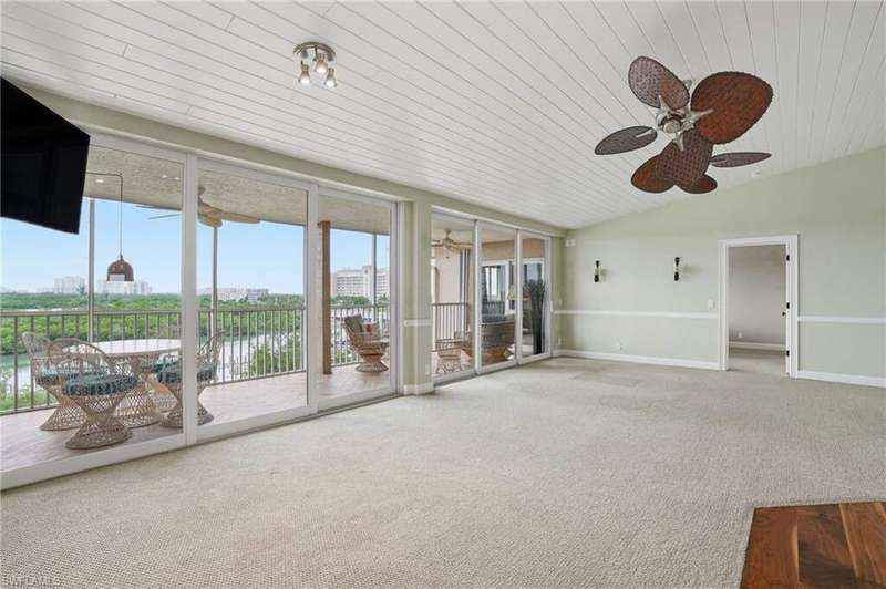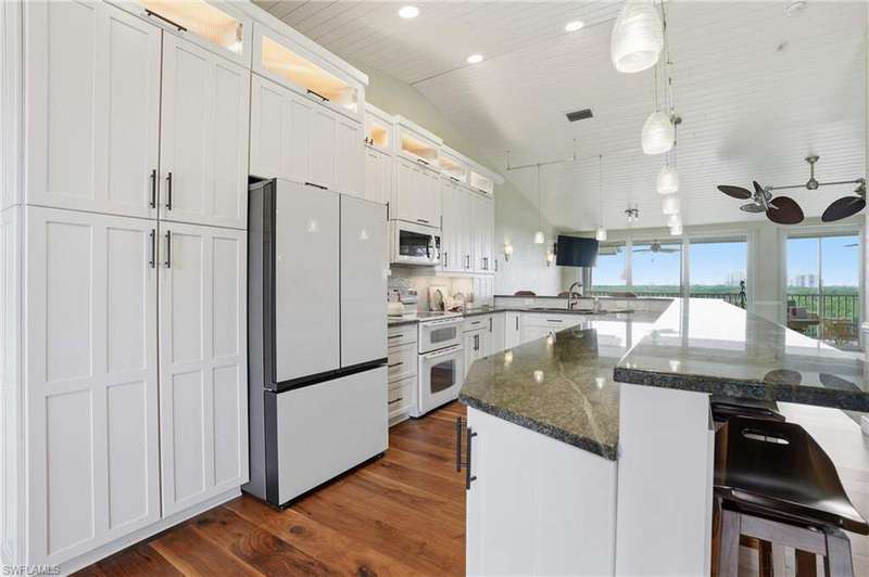 Welcome to one of North Naples' most seldom offered penthouse opportunities-an elevated waterfront back bay, gulf access residence reimagined with exceptional craftsmanship and coastal sophistication. This top-floor unit offers vaulted ceilings, finished with stunning white tongue-and-groove wood that draws the eye upward and highlights the scale of the space. The owner thoughtfully reconfigured nearly every non-load-bearing wall and fully opened the kitchen to create an expansive layout with modern flow. A major architectural upgrade replaced the smaller original 8-foot slider with a second 12-foot slider, inviting significantly more natural light while maximizing sightlines of the back bay and mangroves. Additional enhancements include fully remodeled bathrooms with walk-in showers (the primary featuring dual showerheads), solid-core interior doors throughout, and high-end white kitchen cabinetry contrasted with gorgeous walnut flooring, brand-new lanai screens and stunning herringbone porcelain tile that resembles natural wood. These large penthouse units seldom come available, this particular unit has only had two owners in its 33-year history while two neighboring penthouses still belong to their original owners. Princeton Place Building One offers the most unobstructed vantage point of all five buildings in the complex with easy access to the docks, providing exceptional ambience and further enhancing the coveted waterfront lifestyle. Boat docks are available for sale or lease just steps from your back door. Residents may also enjoy optional membership to the highly regarded Tarpon Cove Beach & Racquet Club, featuring Har-Tru tennis courts, sophisticated dining, a resort-style pool, fitness offerings, and a private boat shuttle to Delnor-Wiggins Pass State Park Beach.