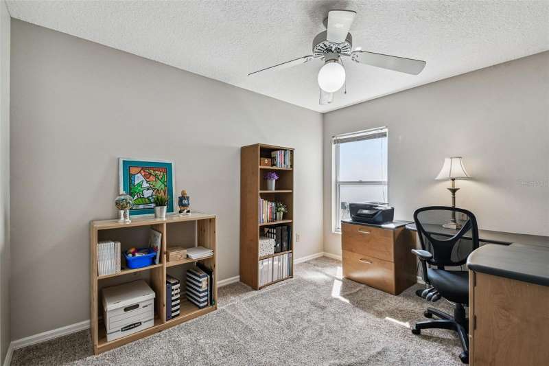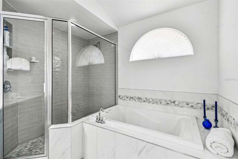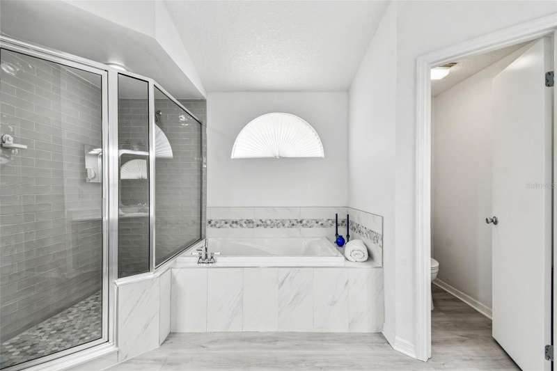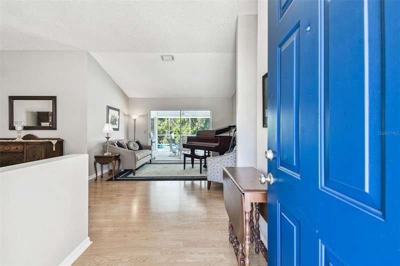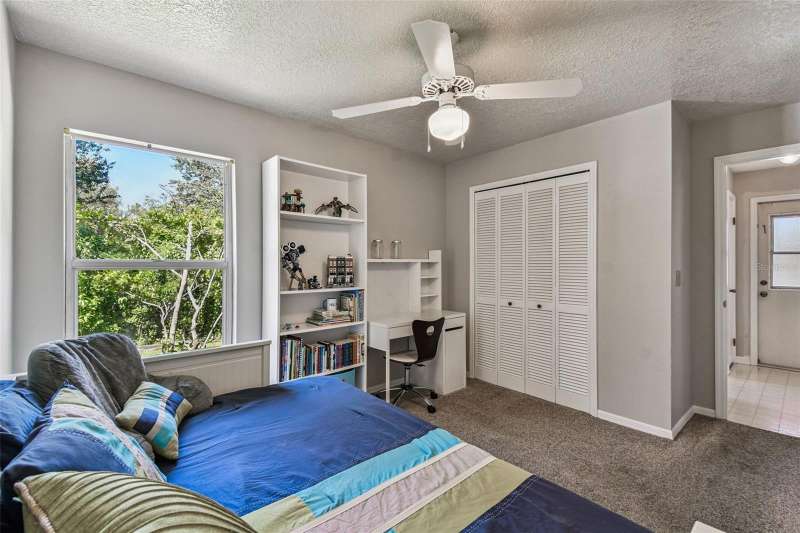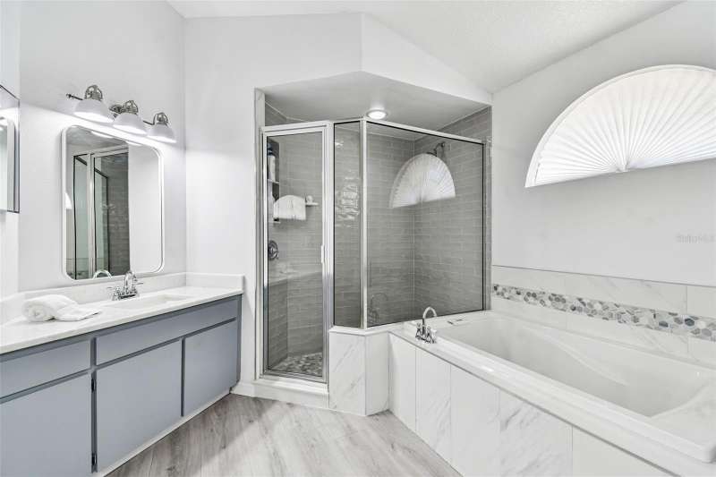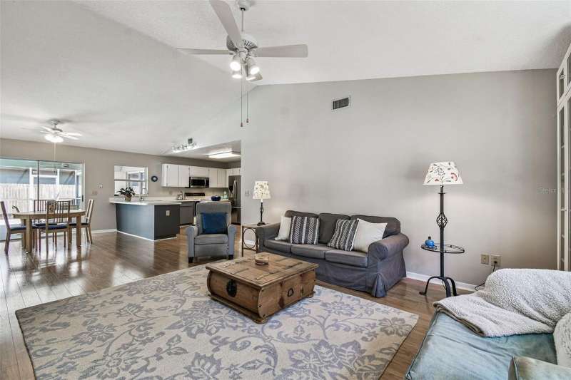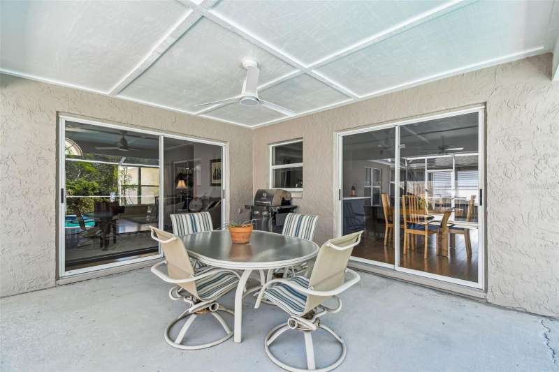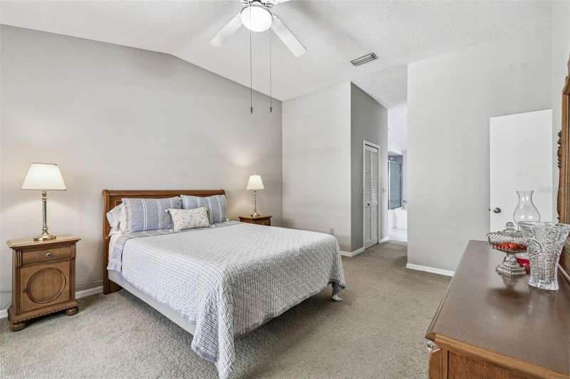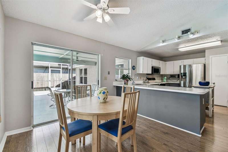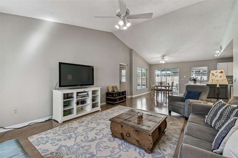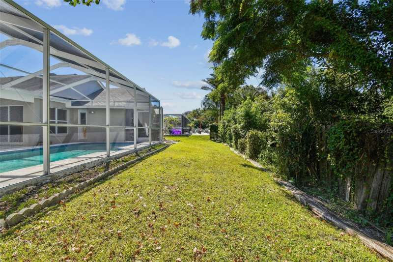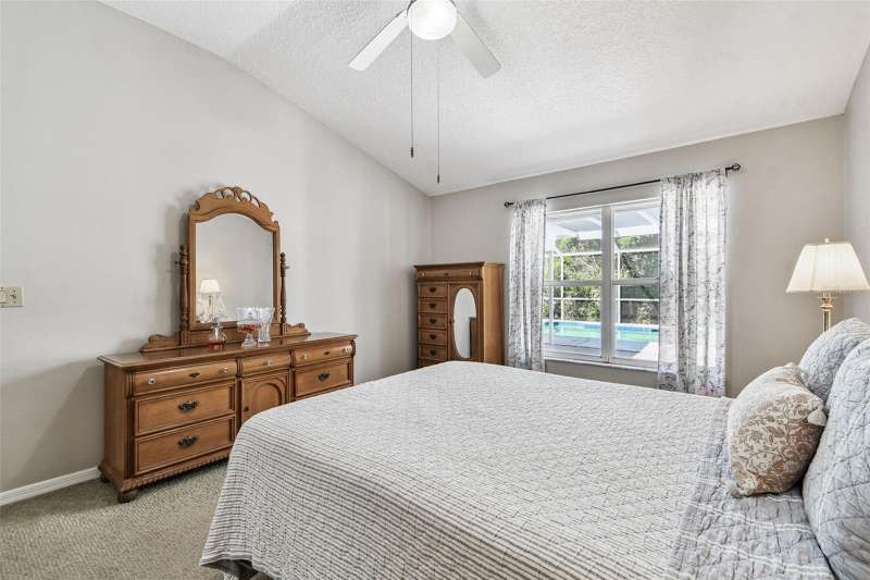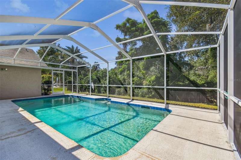 This beautiful four bedroom, three bathroom pool home overlooks serene woods, offering a peaceful retreat. The sparkling swimming pool is perfect for relaxation and entertaining. With over 2,300 square feet of living space, the home is designed for comfort and style. Lots of windows throughout allow for abundant natural light and provide breathtaking views of the conservation area from the primary bedroom, living room, and kitchen. Upgraded laminate floors run through main areas, with carpeted bedrooms. The kitchen is at the focal point in the home and features a handy breakfast bar overlooking the family room and swimming pool. It also features a center island, generous pantry and plenty of counter and cabinet space. The primary bathroom has been recently renovated and includes two separate vanities with quartz counters and undermount sinks, an upgraded garden tub, walk-in shower, a private water closet, upgraded lighting, mirrors and fixtures, a linen closet, and two walk in closets. The owner has had the home freshly painted both inside and out. The pool filtration system is new. New AC in 2024. Three-car garage. Enjoy Florida living at its finest by relaxing on the lanai overlooking the pool and scenic surroundings. Located in popular Cross Creek with easy access to I-75, USF, the Moffitt Cancer Hospital, the VA Hospital, Busch Gardens, the Premium Outlet Mall, and a wide range of local dining options. Residents have access to community courts and a playground.