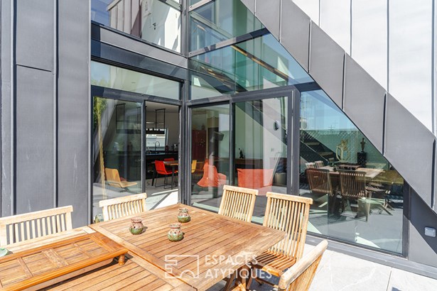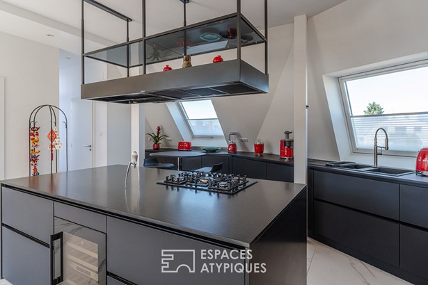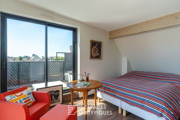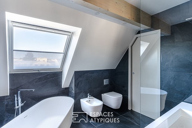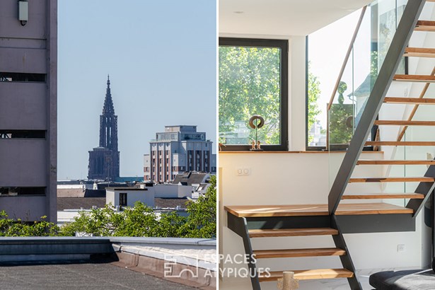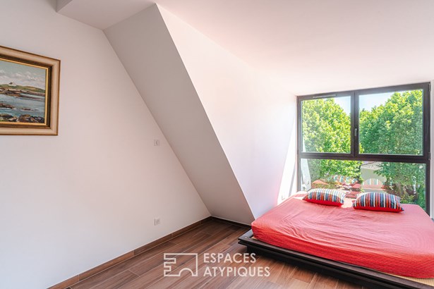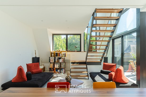 An airy staircase, with graphic lines combining raw steel and walnut wood, leads to the upper floor, where there are two bedrooms with custom-made storage units crafted by a Strasbourg cabinetmaker. A bathroom with a laundry area completes the layout. The underfloor heating and cooling system ensures optimal thermal comfort in both summer and winter.
