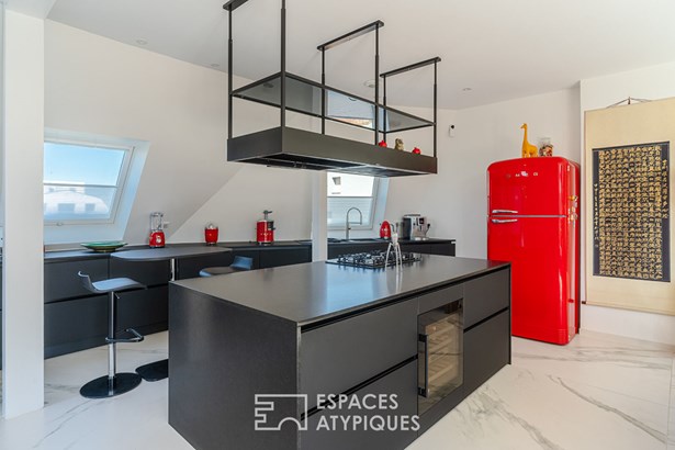 The entrance opens onto a spacious living room of over 50 m2, characterised by its refined design and high ceilings of 2.75 m. The large-format marble-effect porcelain stoneware flooring emphasises the elegant character of the space. The space consists of a living room and a dining room, both bathed in light thanks to their south-facing exposure. The fully equipped kitchen, designed by Schmidt, blends harmoniously with its central island in Zimbabwe granite, combining aesthetics and functionality. A shower room completes this level.