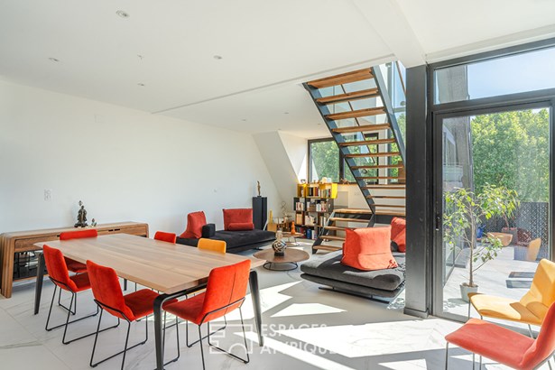 Two terraces extend the interior spaces. The first, facing south, offers 23 m2 to fully enjoy sunny days. The second, 8.5 m2, facing north, extends the kitchen and provides additional outdoor space. This property also includes a 27 m2 double garage in the basement, a shared bicycle storage room and a 3.7 m2 cellar.