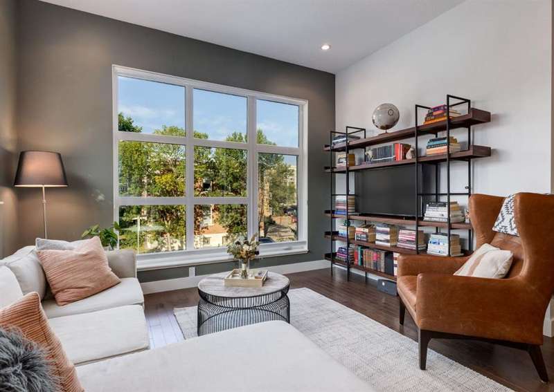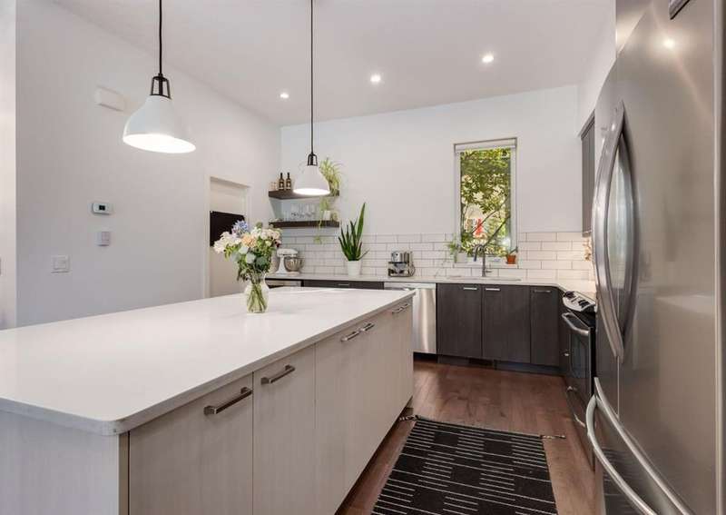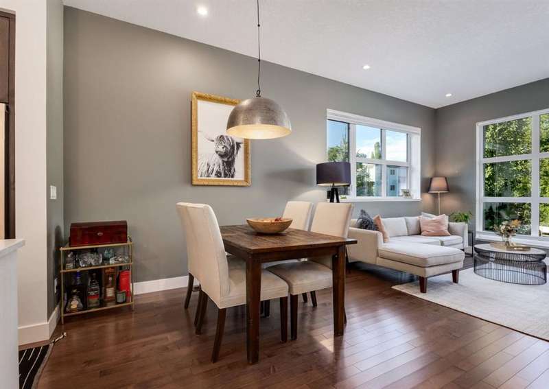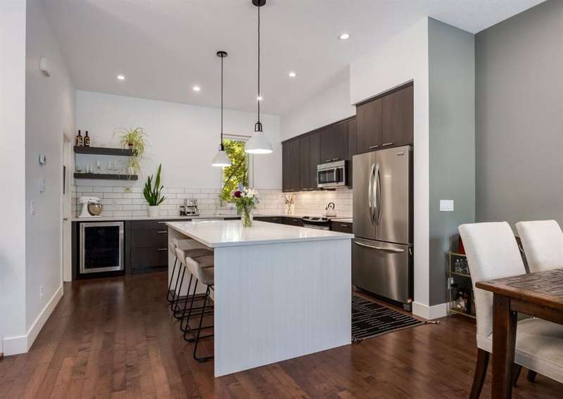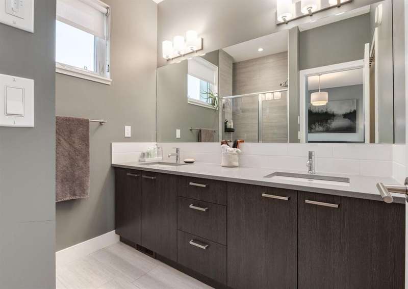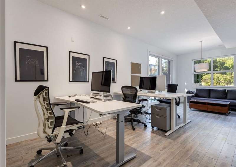 Stunning Corner Townhouse in the Heart of Mission with Versatile Main Floor Office Suite! Offering over 2,150 SF of developed living space across three levels, this corner townhouse combines thoughtful design, modern upgrades, and an unbeatable inner-city location. Large windows flood the home with natural light, creating a bright and welcoming atmosphere. The main level features a separate entry and is currently set up as an office suite with patio doors leading to an enclosed outdoor space—ideal for working from home, meeting clients, or enjoying a private retreat. Future owners will love the flexibility: this level can easily be converted back into part of the main residence, or serve as a guest suite, home gym, or private office away from the family quarters. Upstairs, the open-concept main floor is perfect for entertaining, with a stylish living room, dining area, and a beautifully designed kitchen at the back. The kitchen showcases a large island with seating, stainless steel appliances, timeless subway tile backsplash, designated pantry, under-cabinet lighting, and plenty of counter space. A discreetly tucked-away powder room completes this level. The top floor hosts two large bedrooms, each with its own ensuite. The spacious primary suite offers newly installed custom closet built-ins, a luxurious ensuite with dual vanities, water closet, and a custom shower. The junior suite also enjoys a walk-in closet, while laundry is conveniently located on this level. Notable upgrades include TRIPLE-PANE windows, high ceilings on all levels, Hunter Douglas blinds, and an energy-efficient AC/heat pump installed in 2024. All of this is set in the highly sought-after community of Mission—just steps to restaurants, cafes, shops, gyms, river pathways, and the downtown core. Floor plans and a 3D tour are readily available, providing a glimpse into this stylish townhome!