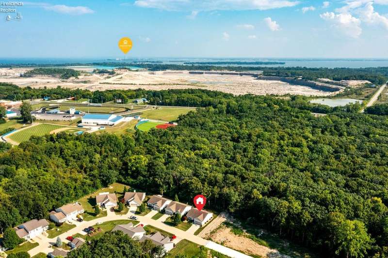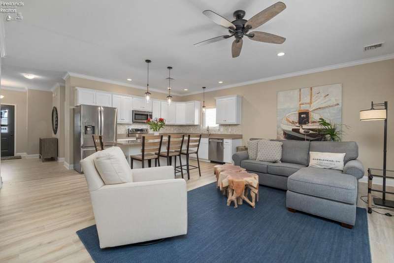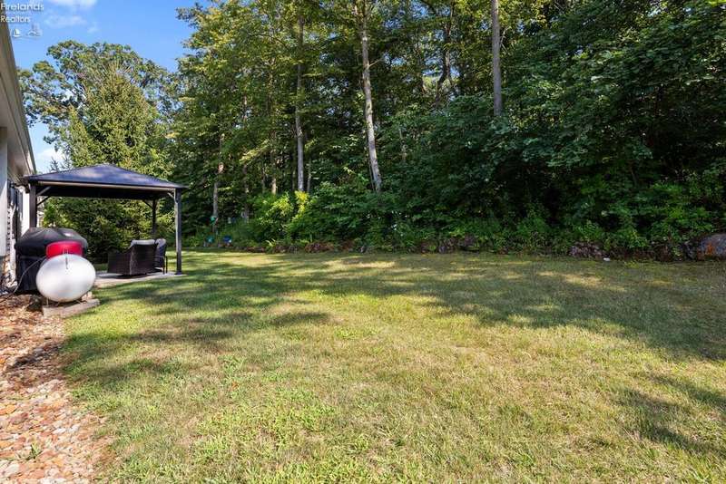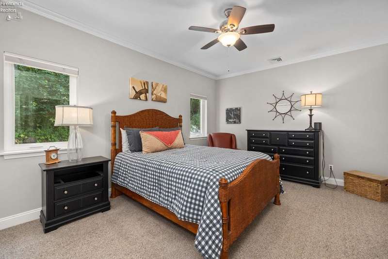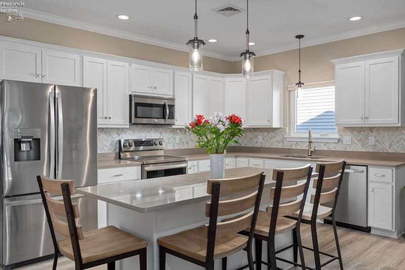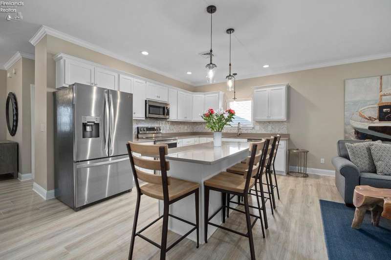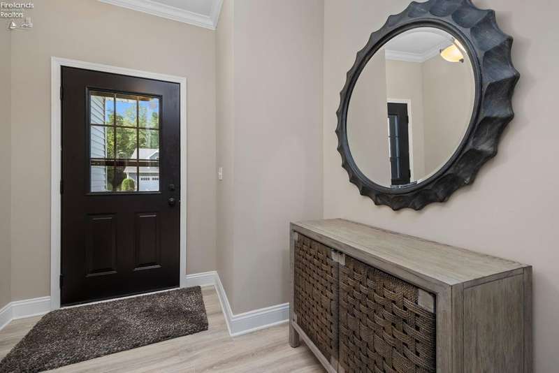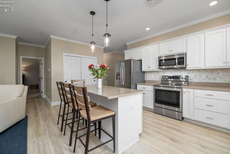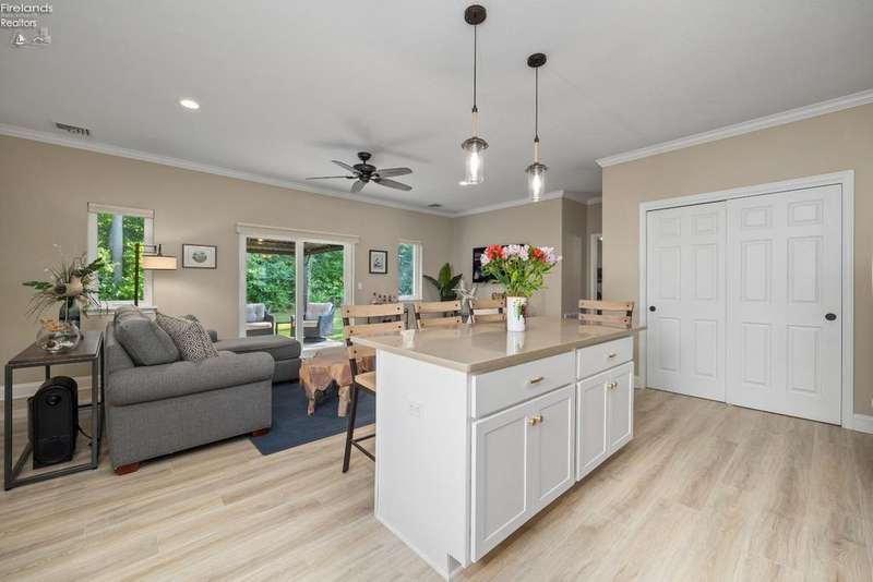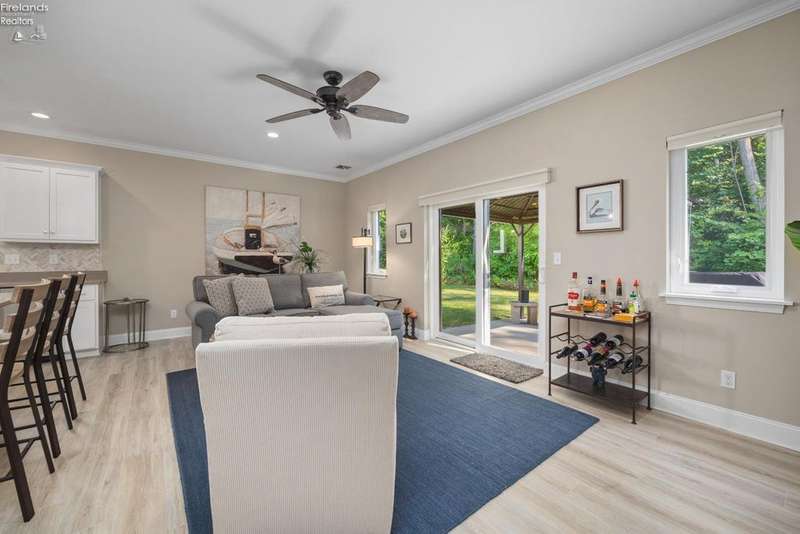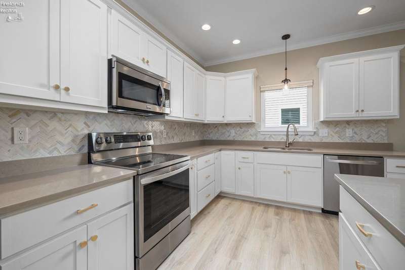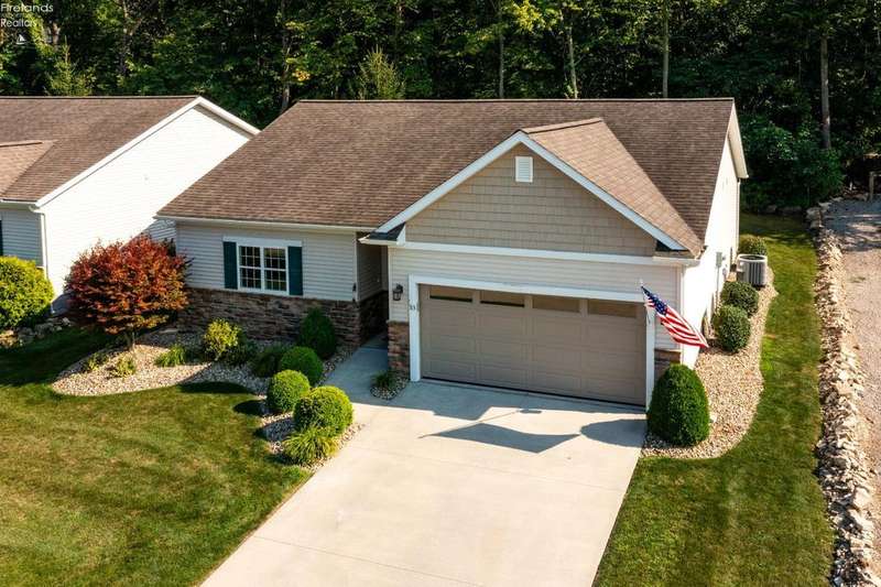 Straight Out of an Interior Design Magazine! Custom Finishes, Upscale Living & Prime Location! Welcome to this stunning ranch style home located in the highly desirable Lighthouse Bluffs community. Built in 2015 and upgraded beyond builder-grade, this better-than-new construction gem is full of luxurious, low-maintenance lifestyle features. Step into a bright, welcoming foyer and immediately notice the high-end finishes and open-concept layout enhanced by newer LVP flooring throughout the main living area. The gourmet kitchen is a showstopper with quartz countertops, new mosaic tile backsplash, updated LG appliance package, soft-close cabinetry, a large island with bar seating for four, and a sleek undermount stainless steel sink, all seamlessly flowing into the spacious living and dining area. The living room opens to a private concrete patio with pergola, perfect for relaxing or entertaining while enjoying views of mature trees and a tranquil backyard setting. The primary suite features dual closets- walk-in and a second with double doors and ensuite bath with a walk-in tile shower and updated vanity. Generous second bedroom overlooks the landscaped front yard and is conveniently located next to the hall bath. Closet space galore. Utility room off the hall and two car attached heated garage, ample parking - concrete driveway. Walk to the lake. Smoke and pet free home. Furnishings and decor available outside for sale. Enjoy this serene, year-round retreat and let the HOA take care of the yard just move in and relax! Hoa fee: $50.00/mo. 9ft ceilings throughout, crown molding, smart thermostat. Don't miss your chance to own this peaceful, move-in ready home in Vacationland!