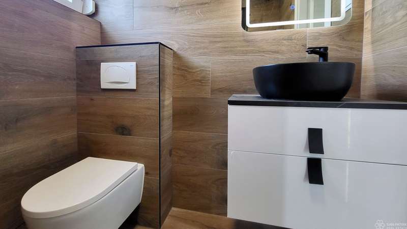 The villa is equipped with modern systems and a high level of comfort: underfloor heating in the bathrooms, Daikin air conditioning system, heat pump, solar water heater (260 L) and a 10.5 kW solar power plant (three-phase). Video surveillance, an alarm system and electric shutters are installed, and the living room also has a fireplace.