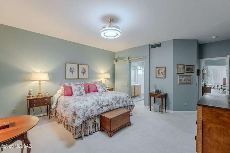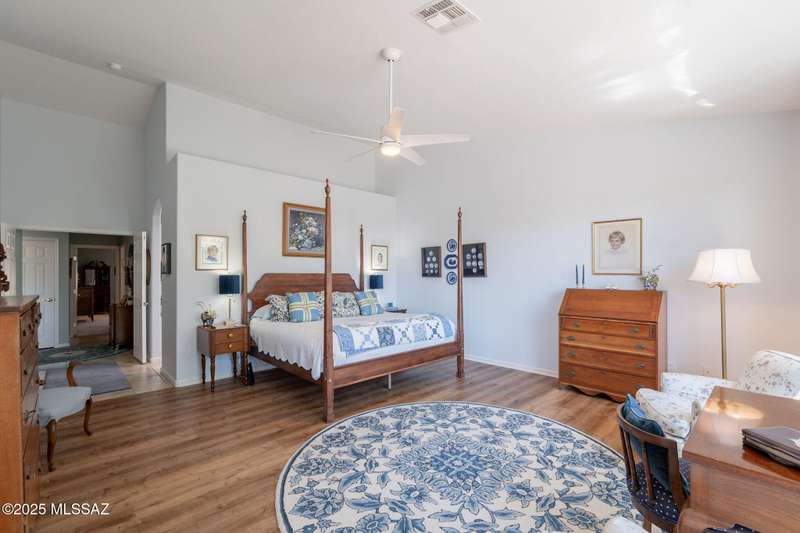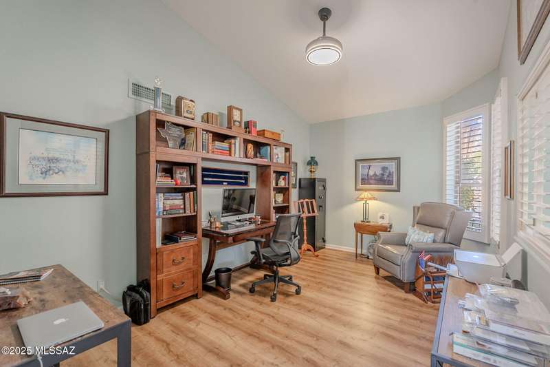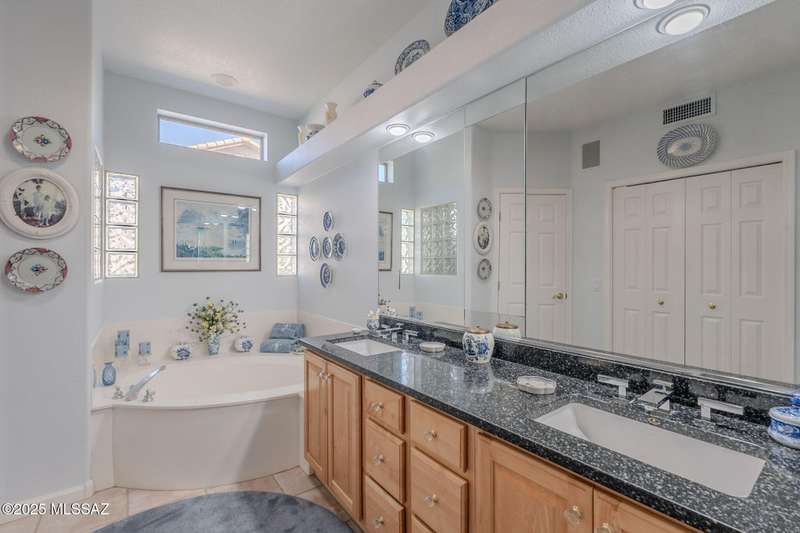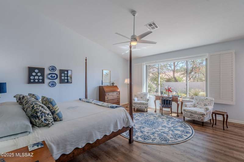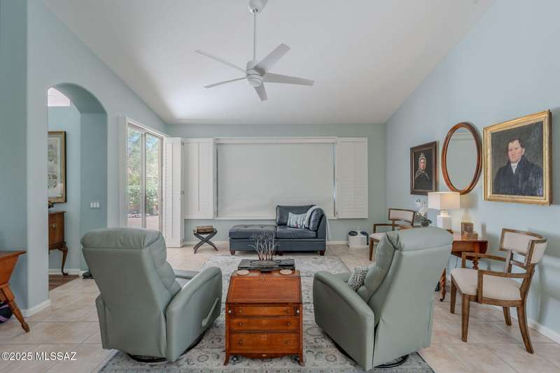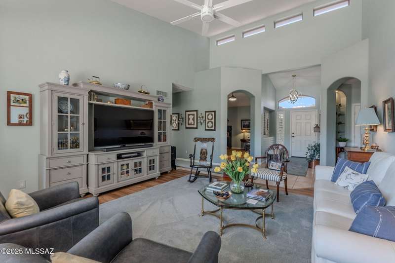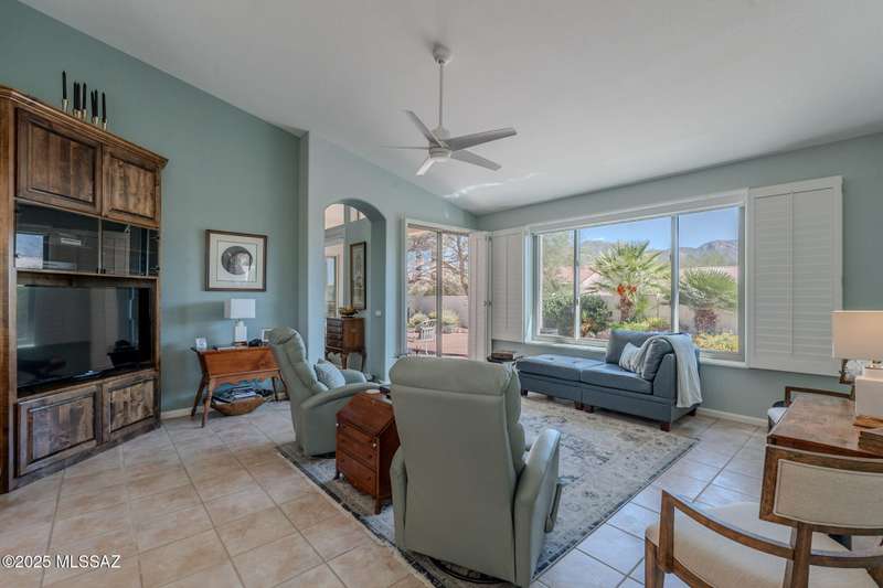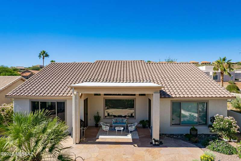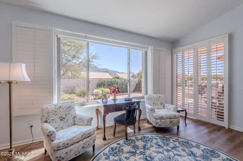 Extensively updated Estancia model w/mountain views & pride in ownership! Kitchen-new counters, island, maple cabinets, pantry w/pull-outs, plus butler's pantry/laundry. Hard-wired sound system w/ceiling speakers & stereo for room-to-room music. Primary suite - granite dual vanity, zero-grade shower, tub, walk-in closet, patio slider, & new windows w/shutters. Guest suite - barn door bath w/dual vanity, walk-in closet, Jack & Jill water closet/powder room. Spacious den/office. Updates: roof underlayment 2025, ceiling fans & light fixtures, several windows & shades. Interior/exterior painted 2021, irrigation 2021, HVAC 2017, tile cleaned 2025. Private enclosed flagstone patio, new gates. Extended garage w/cabinets, sink, attic stair, epoxy floor, plus whole-house NuvoH2O filtration.
