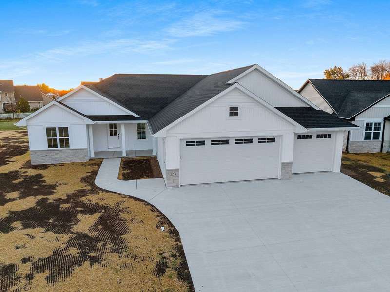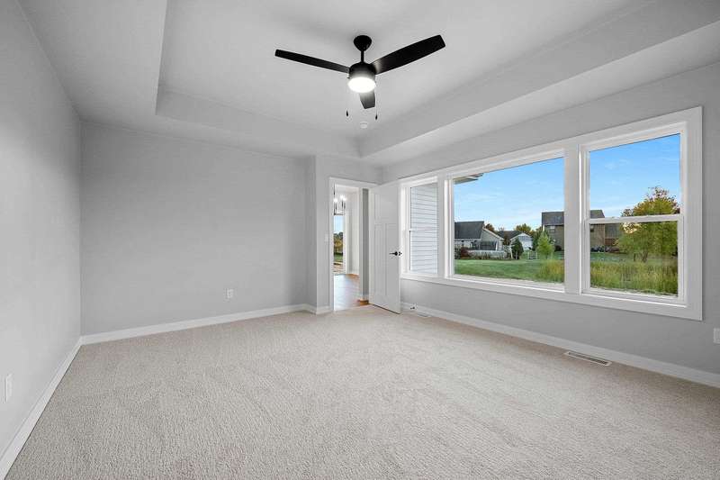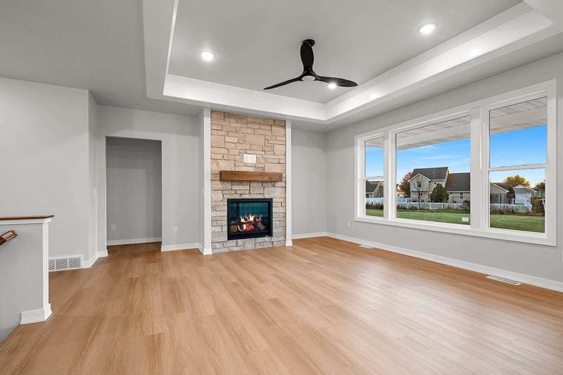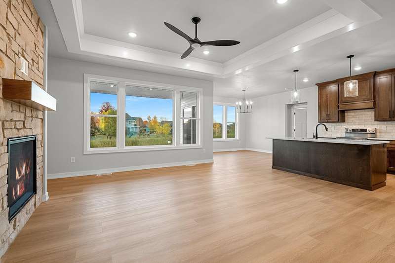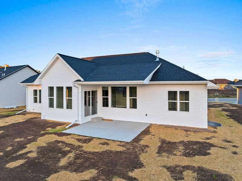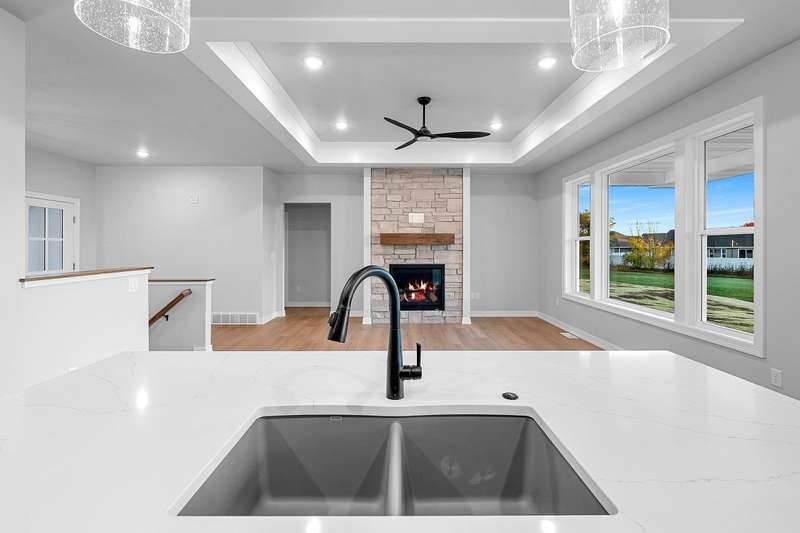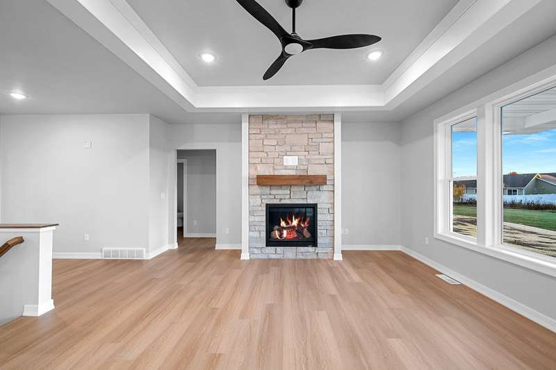 Welcome to your dream home nestled in a quiet setting. The heart of this home is the impressive Great Room adorned with a stylish tray ceiling & inviting FP perfect for cozy gatherings during chilly evenings. Enjoy a beautifully designed kitchen featuring quartz countertops, a sleek tile backsplash, generous pantry & a center island that is a natural gathering spot. Retreat to the primary bedroom w/ inviting tray ceiling, amazing WI closet, ensuite bathroom w/ dual sinks & a tile WI shower. This space is designed for comfort & relaxation. Step outside to a private covered patio, an ideal setting for dining, morning coffee or simply enjoying the peaceful surroundings. The LL is a blank canvas, already stubbed for a bathroom, waiting for your personal touch. Lawn is seeded. Move in & enjoy!