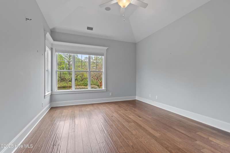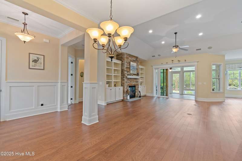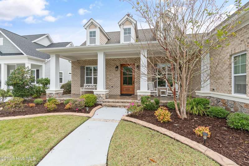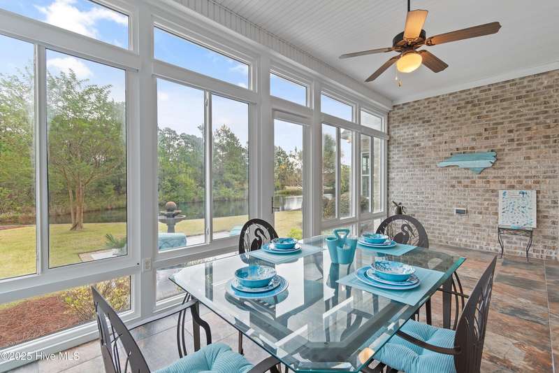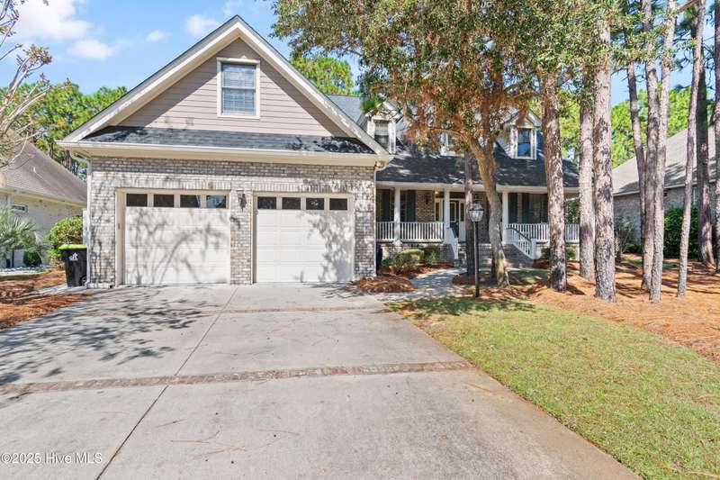 Welcome to 4135 Skeffington Court, a completely customized Shackleford Banks floor plan, nestled in the heart of the gated St. James Plantation community. This exquisite 4-bedroom, 3-bathroom residence offers 2,737 square feet of thoughtfully designed living space and enjoys pristine water and nature views. Ideally located close to Players Clubhouse, pool, workout facility, and community garden, with easy access to the Regency Gate, this home combines luxury, convenience, and tranquility. The charming brick exterior, sideload garage, and oversized front porch exude timeless elegance. The beveled glass Mahogany front door offers an inviting entryway. Inside, custom wainscoting and crown molding welcome you into the foyer and formal dining room, where divider columns and rich Hickory wood floors create a seamless flow through the main living areas. The spacious great room features a sophisticated cove ceiling and a striking gas fireplace with stacked stone surround, flanked by built-ins designed for flexible TV placement. Ten-foot bi-directional sliding glass doors open to a serene sunroom with calming pond and nature views, while the backyard offers a spacious patio for grilling and outdoor dining, enhanced by a beautifully landscaped yard and stone retaining wall. The professionally maintained pond has a backdrop of protected green space, ensuring privacy and stunning vistas. The kitchen is a dream, featuring custom cafe wood cabinetry, stainless steel appliances including a dual fuel range with convection and grilling features, granite countertops, a large island with counter-height seating, and a walk-in pantry. A cozy breakfast nook completes the space. The private owner's suite offers peaceful pond views, rich wood flooring, and a spa-like en-suite bath with granite-topped dual-sink vanity, tiled walk-in shower with frosted glass, multiple shower heads, built-in seating, and a custom-organized walk-in closet. Two guest bedrooms