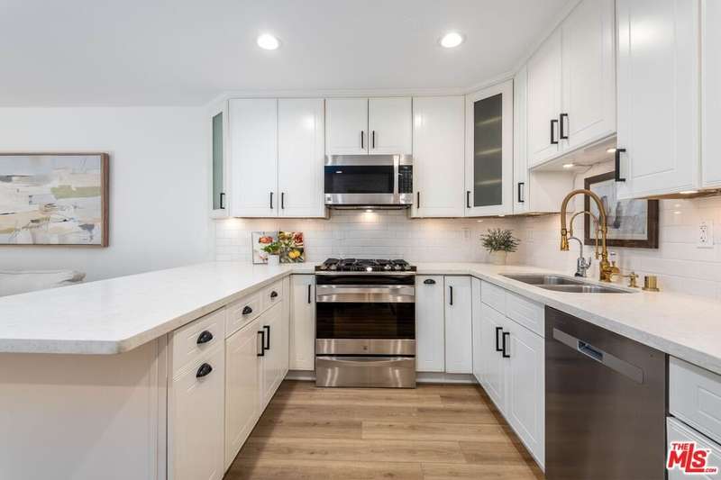 Enjoy refined living in this extensively remodeled contemporary unit featuring an open-concept floorplan and clean aesthetic throughout. Upon entry, take in the sleek and welcoming living space with new luxury vinyl plank flooring throughout, recessed lighting, and well-appointed kitchen with quartz countertops, subway tile backsplash, water filtration system, and stainless steel appliances including a gas range. The kitchen opens to spacious living room with sliders to a generous-size outdoor balcony that is ideal for entertaining. Down the hallway enter into a private and peaceful primary suite with abundant closets and storage, tiled shower with frameless glass doors, and stylish vanity area with decorative herringbone backsplash and en-trend finishes. Additional highlights include double-pane windows and gated parking with extra storage. Quaint 26-unit building with open breezeways and outdoor pool. Tree-lined street with park and abundant shopping and dining destinations nearby.
