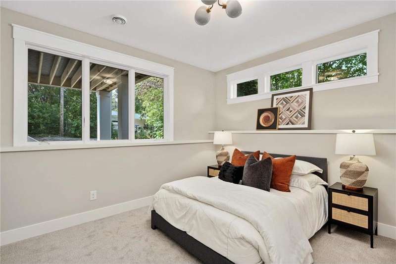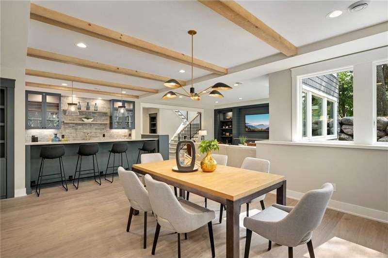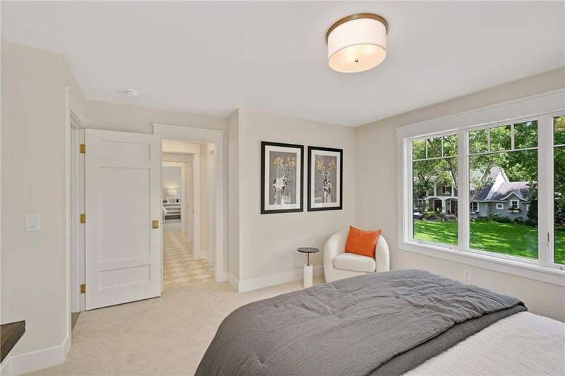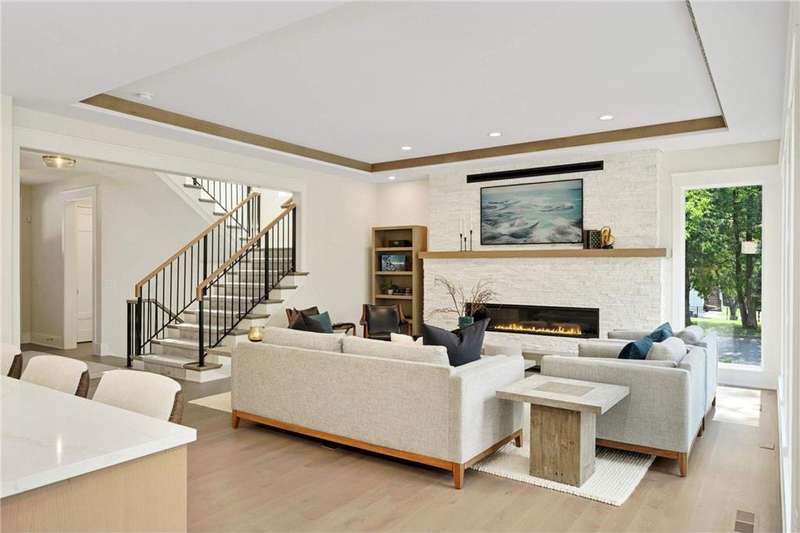 This exceptional home spans over 6,165 square feet and boasts high-end finishes and amenities throughout. It features four bedrooms upstairs, including a luxurious owner’s suite with a spectacular bath highlighted by a walk-in shower. The great room is adorned with walls of windows, offering abundant natural light, and is complemented by a center island kitchen complete with a walk-through pantry. A standout feature of the house is the three-season porch, featuring a fireplace, shiplap walls, retractable windows, and a rustic barn wood ceiling with beams, providing a cozy yet elegant retreat. The lower level is fully finished and includes a walk-behind bar and Wooddale’s signature hidden doors, adding functionality and style to the space. Additional highlights include a three-car garage with epoxy flooring, a welcoming front porch, and a spacious back deck overlooking a backyard that's ideal for outdoor activities. This home represents the latest model by Wooddale Builders and is situated in the heart of Edina, offering both luxury and comfort in a highly desirable neighborhood.