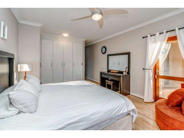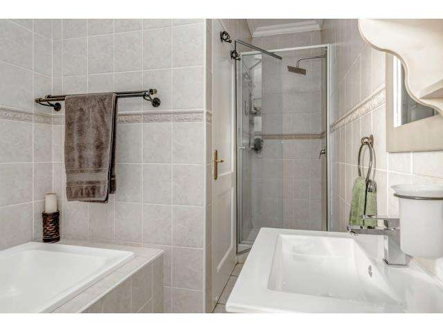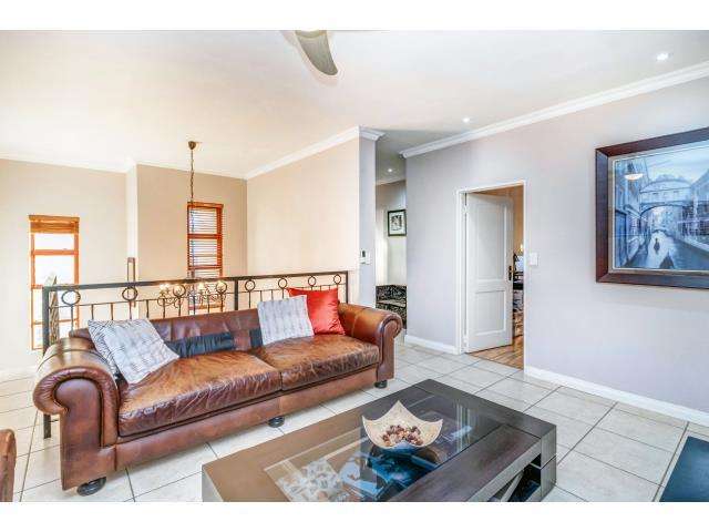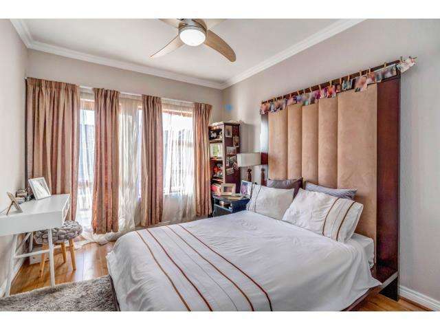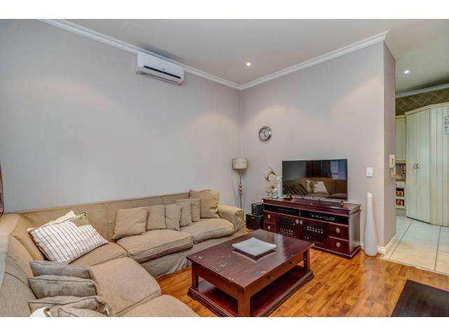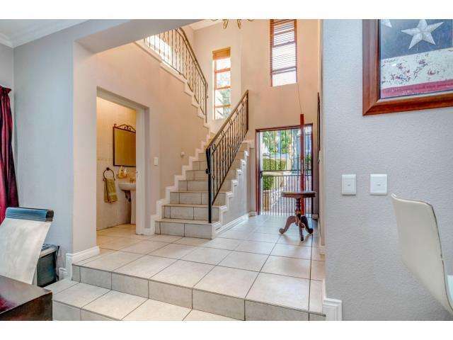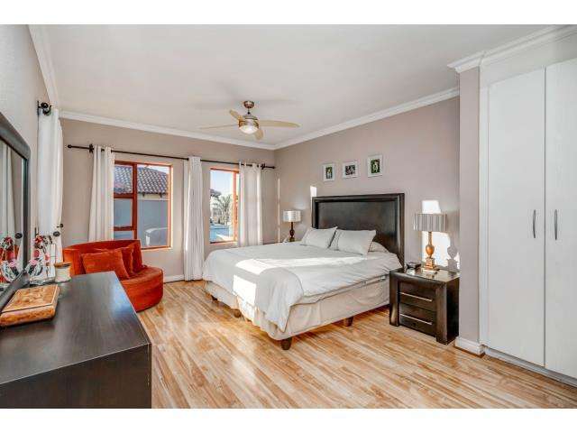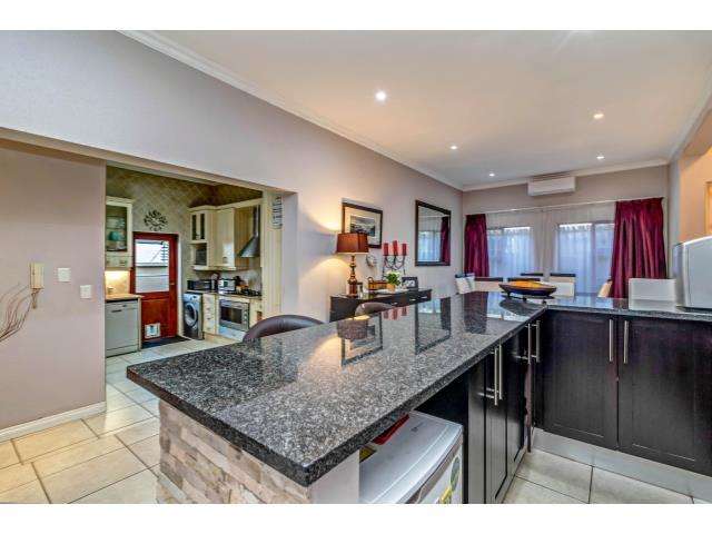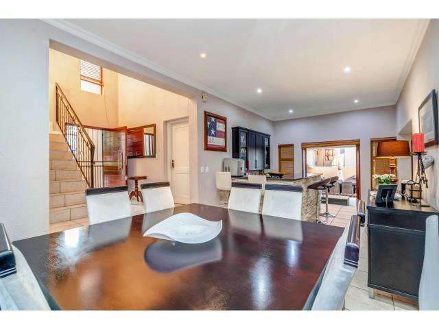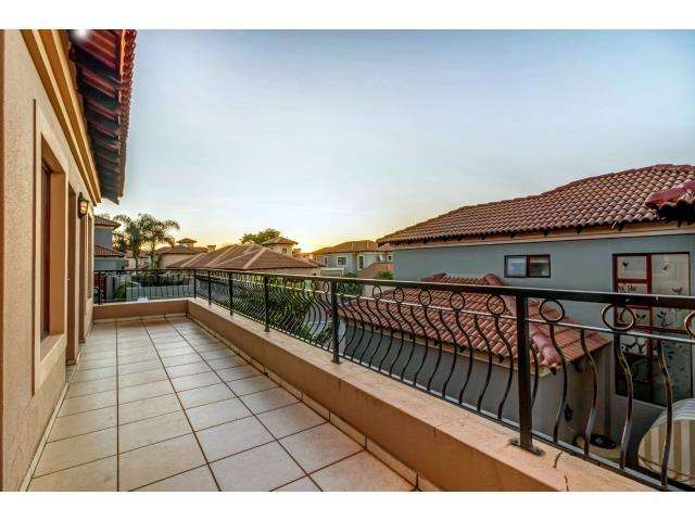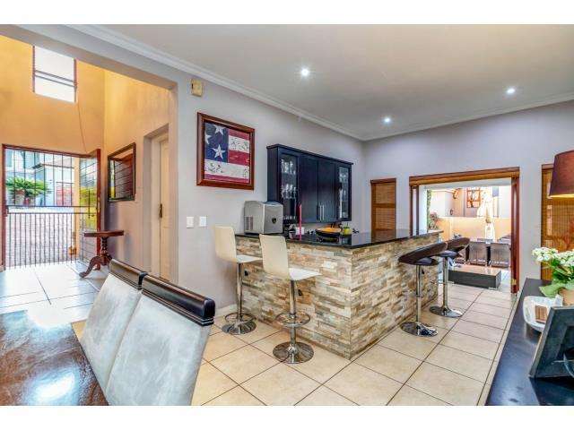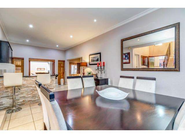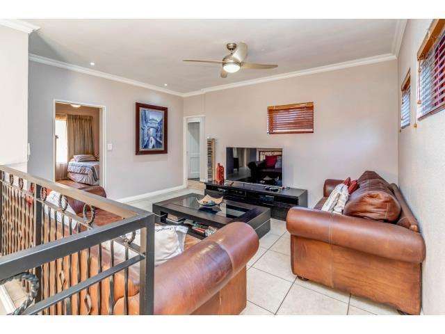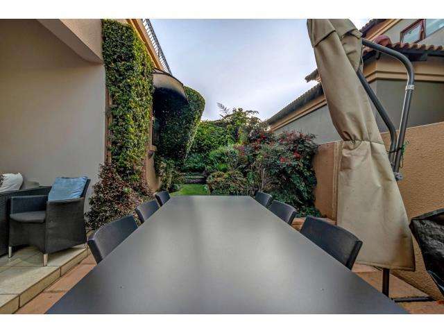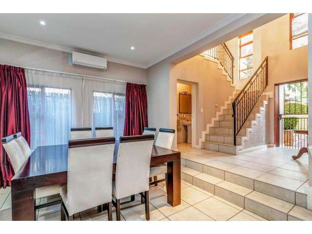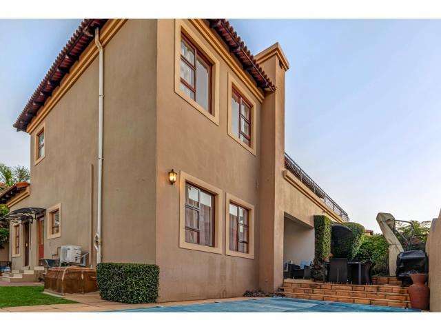 This gem is a sophisticated double storey cluster home that will meet all your requirements. The property is situated in a highly sought after up market complex in Bromhof. Property comprises of grand entrance hall leading to air conditioned tiled reception lounge. Efficient well designed country style kitchen with granite tops , gas stove , extractor hood and space for appliances as well as plenty cupboard space. Spacious tiled dining area that can seat a large 8 seater dining table , built in bar. Patio doors leading to under cover patio overlooking quaint compact garden and splash pool. Air conditioned T.V lounge with wooden flooring , guest bathroom. The grand stair case leads upstairs to the 2nd lounge or can be used as a home office area There are 4 great sized bedrooms with built in cupboards including the sun filled spacious main bedroom with en-suite bathroom also with patio doors leading to balcony. Modern family bathroom All bedrooms have built in cupboards, for parking there is triple automated garages with space for extra cars to park in the drive way. The property also benefits from staff accommodation and the complex has 24 hour guards and the levies are affordable. For power solutions the property benefits from : 2 x 5,5 kw converters 2 x 5kw batteries 10 panels Solar geyser plus 4 panels 2200lt water tanks