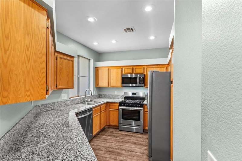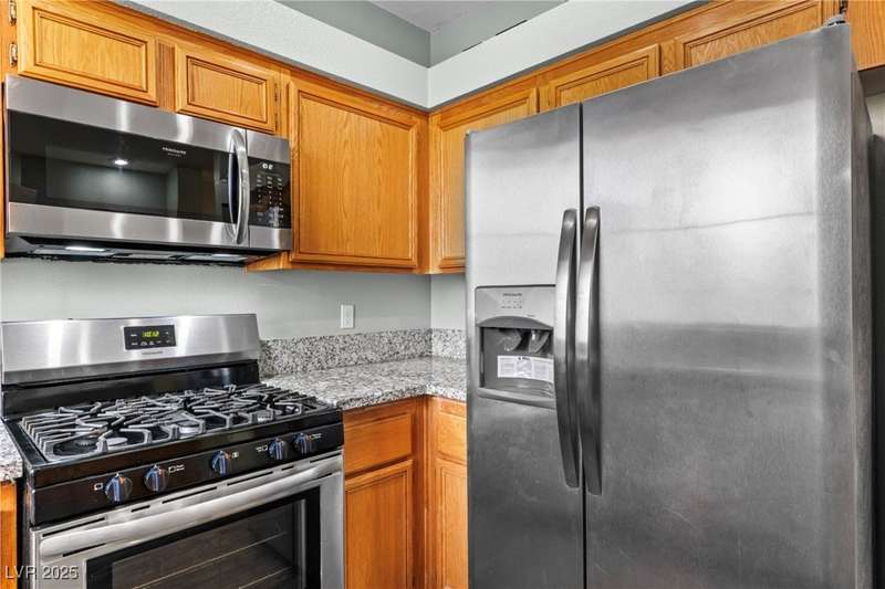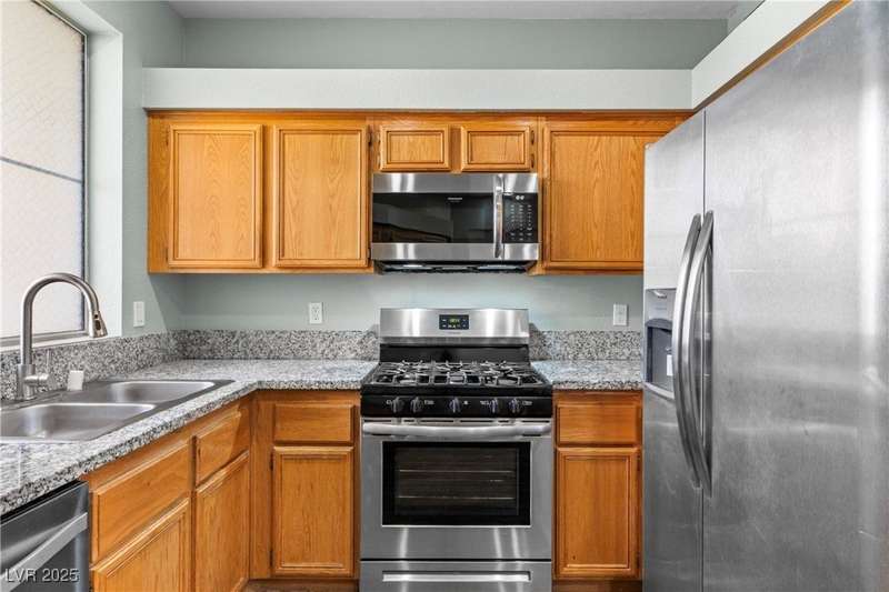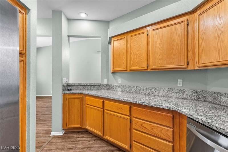 Move-in ready updated 2-bed, 2-bath upstairs condo with a detached 1-car garage! Stainless steel appliances, new garbage disposal, new shower heads, granite kitchen counters, and updated vinyl flooring throughout! Open layout, pantry storage, vaulted ceilings in the living room, and a spacious private balcony perfect for relaxing or entertaining. The community offers resort-style amenities, including a sparkling pool, fitness center, clubhouse, and covered parking. Ideally located just minutes from the Las Vegas Strip, 15 & 215 freeway, Downtown Summerlin, Red Rock Resort & Casino, Allegiant Stadium, and T-Mobile Arena. Whether you’re seeking a full-time home or a Las Vegas getaway, this condo offers the perfect blend of style, comfort, and access to the best of shopping, dining, and entertainment!