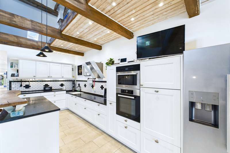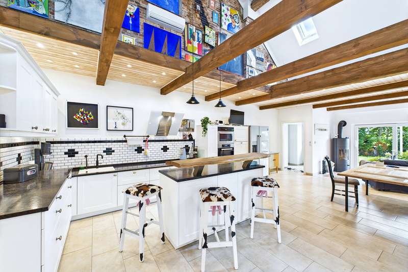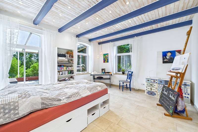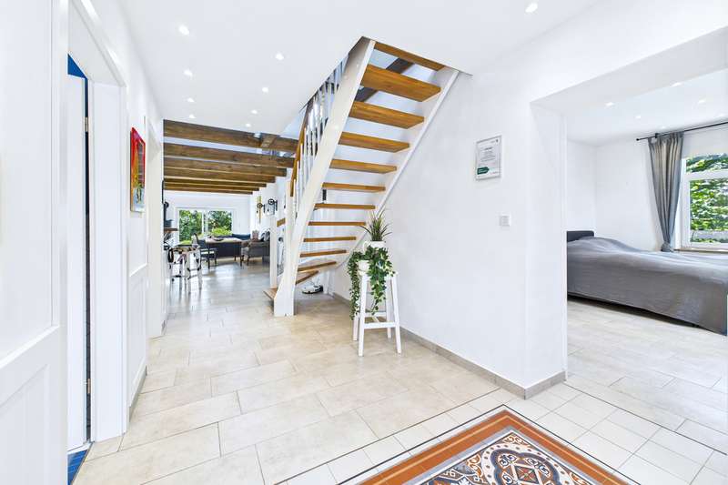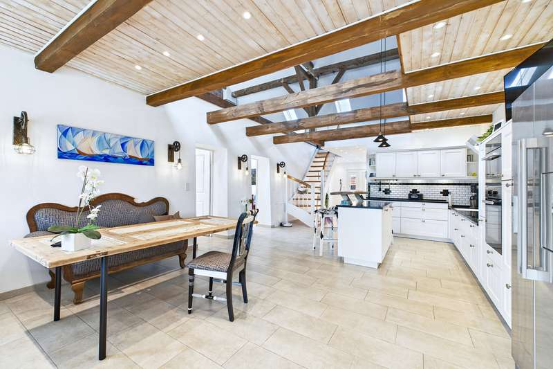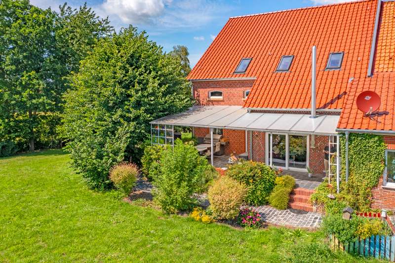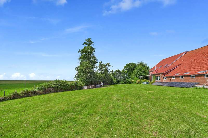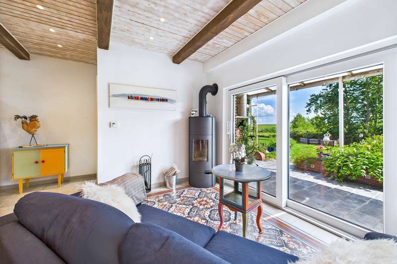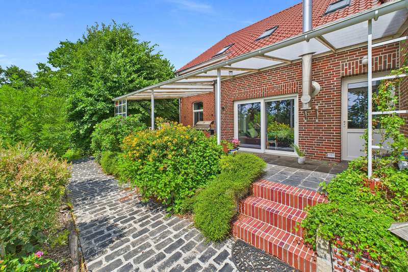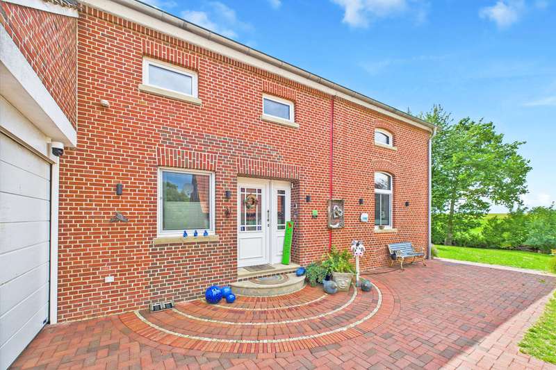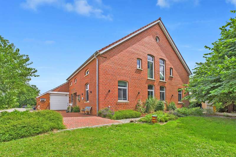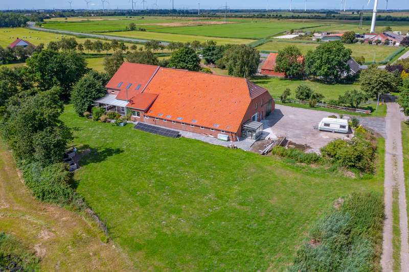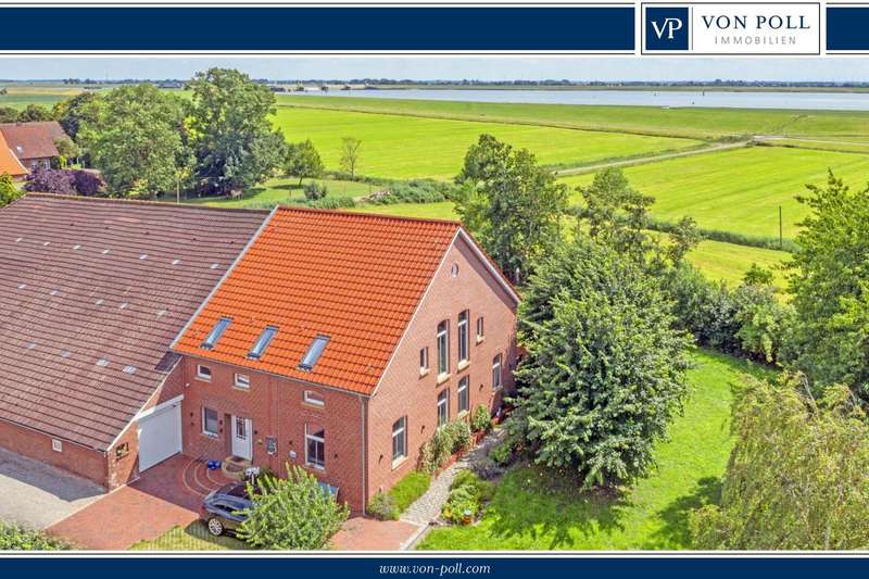 In an idyllic location, nestled in the vastness of East Frisia and directly on the Ems estuary, a dream home opens up behind historic walls that masterfully combines tradition and progress. The lavishly renovated Gulfhof stands for an extraordinary lifestyle - with a history dating back to the 15th century and furnishings that meet the highest standards. Set on a spacious plot of around 3,920 m², the property is quiet yet well connected. The combination of a listed appearance and modern building technology is reflected in the approx. 233 m² of living space and 671 m² of usable space in the adjoining barn. Whether workshop, studio or storage space - a wide range of possible uses are conceivable here. The house, originally built in 1929, was completely renovated in 2021. The result is a harmonious interplay of historical character and modern living comfort. At the heart of the technical concept is an innovative smart home system (KNX) that allows lighting, heating and kitchen appliances to be controlled worldwide via smartphone or tablet. It is complemented by a central air conditioning system and an environmentally friendly heat pump with geothermal energy, which ensures a pleasant indoor climate all year round. A water-burning stove provides additional warmth and atmosphere - and also feeds the underfloor heating on the first floor, which can also cool in summer. Light-flooded rooms and high-quality materials create a modern ambience in an authentic setting. Three flexibly usable rooms, a spacious living and cooking area with an open luxury kitchen, a guest WC, a shower room and a utility room offer well thought-out functionality. The open gallery can easily be converted into additional living space if required. Outside, the covered south-west-facing terrace - covered with natural slate - invites you to enjoy a spacious garden that offers a variety of leisure activities. The "Green House Number" award stands for the sustainable overall concept of this property - a seal of quality that is rarely awarded in the region. In some federal states, such as Lower Saxony or Saxony, it is awarded to owners who have built or modernized in a particularly energy-efficient manner. Anyone looking for a retreat with substance and soul will find the ideal combination of rural idyll, energy-efficient technology and design sophistication here. A place that not only offers space - but creates a home.