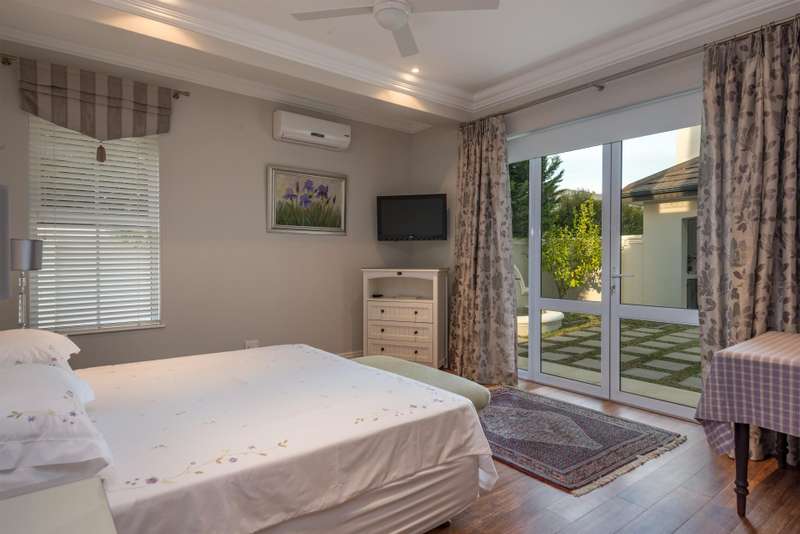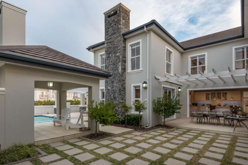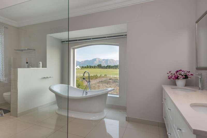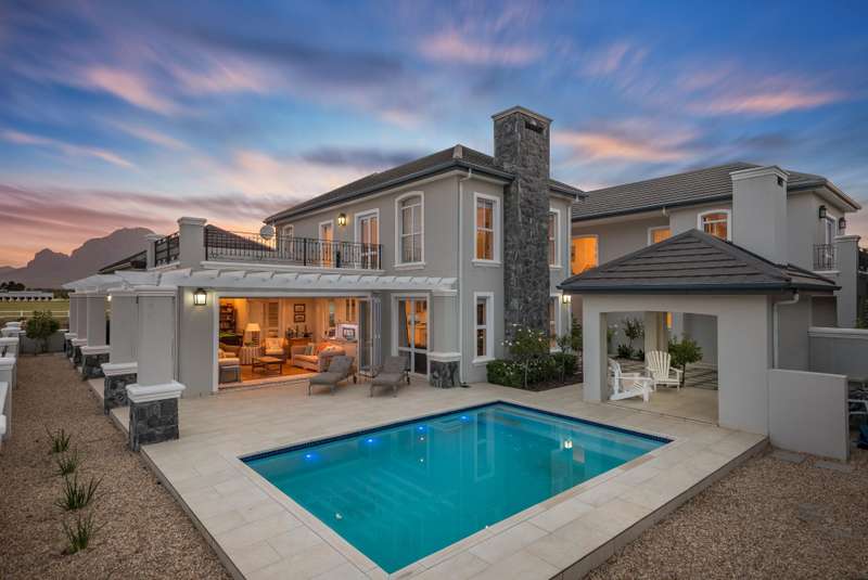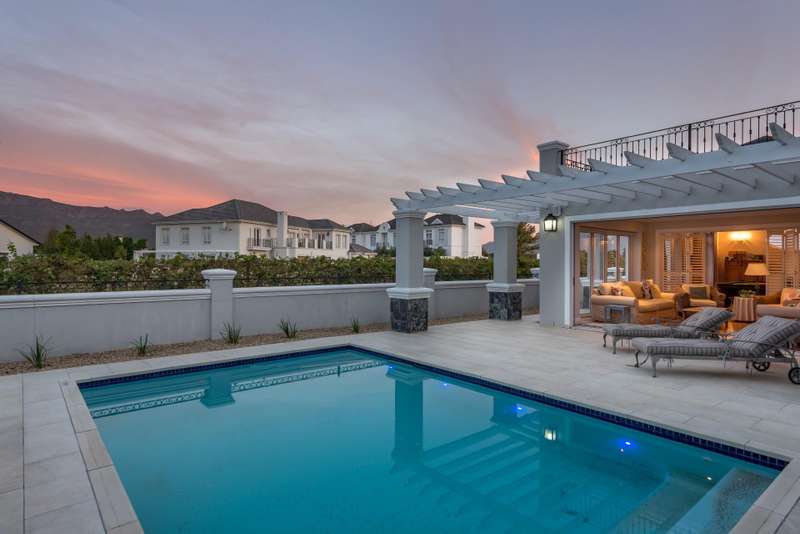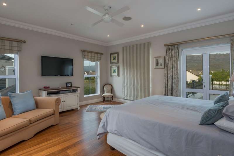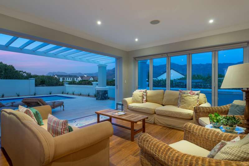 This spectacular 4-bedroom home has the bonus of 4 garages and allows its owners to experience all the best aspects of life in ?Ç£The Valley?Ç¥. A private home perfect for entertaining with multiple living areas to choose from, each room offering stunning mountain and green belt views. The house overlooks Val de Vie?ÇÖs impressive polo field making for lots of excitement on Sunday mornings during the polo matches. Much thought went into the design of this home, evidenced by features such as the quaint braai gazebo, Italian style courtyard garden with fountain, and strategically placed windows maximizing views whilst retaining privacy. This grand home has classical finishes with wooden floors and beautiful cabinetry throughout. The kitchen is spacious and modern and boasts a laundry and a scullery separately. The impressive staircase leads you to an upstairs landing with beautiful windows to optimise the light flow and views. The main bedroom uniquely offers two full en-suite bathrooms ?Çô one of which allows you to take a bath whilst overlooking the polo fields. A further 2 bedrooms are upstairs with the fourth being situated downstairs.