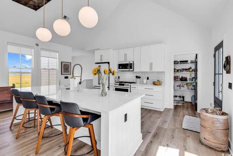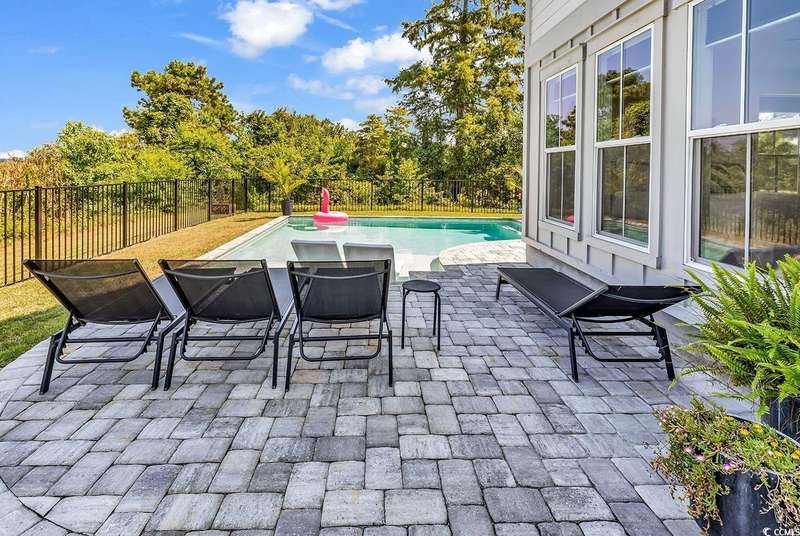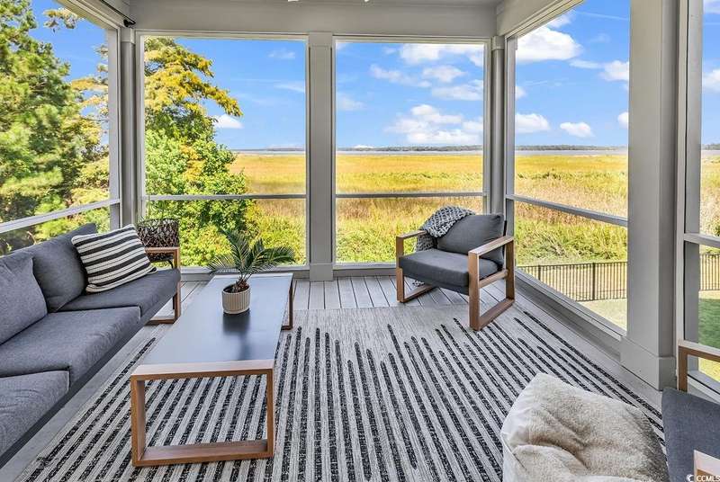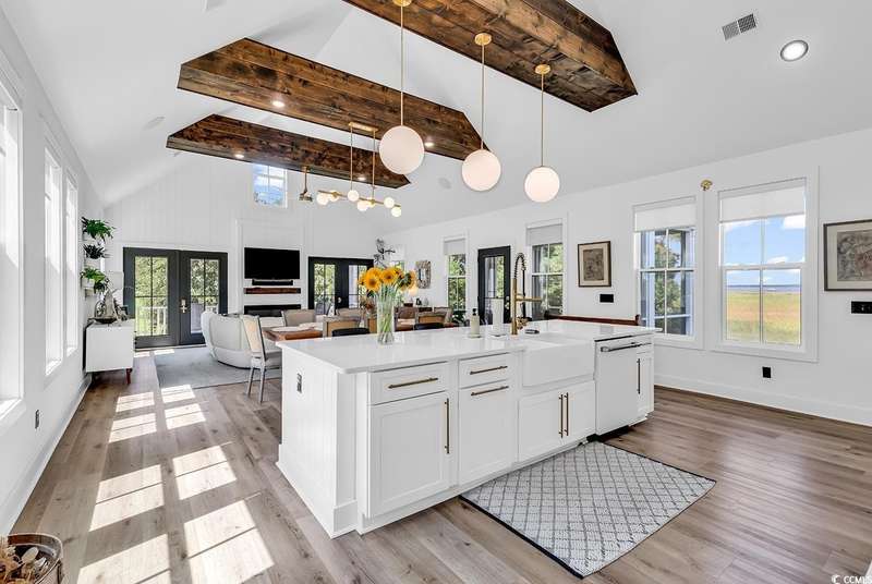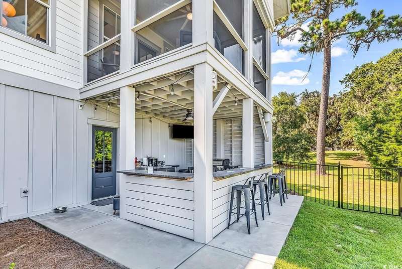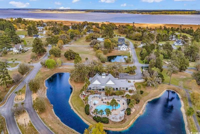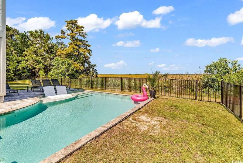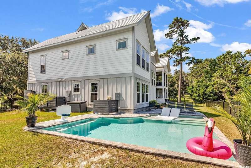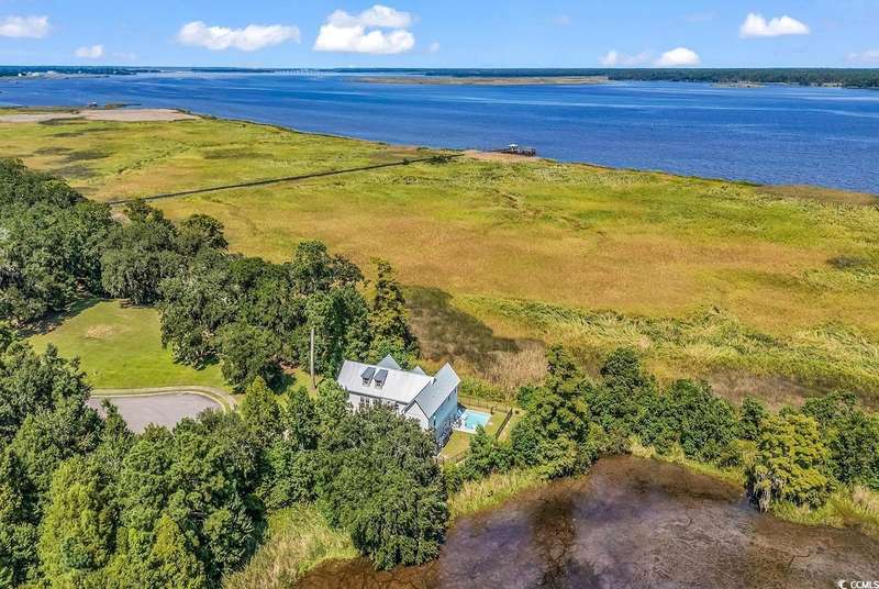 Panoramic Water Views from this home on Winyah Bay! This home constructed in 2023 is at the end of a cul-de-sac and is surrounded by Winyah Bay on one side and a serene pond on the other. Enter the open living room with vaulted ceilings and exposed beams to give it beautiful charm. The gourmet kitchen is a chef's dream with GE Cafe Appliances, walk-in pantry and beautiful tile backsplash. The primary bedroom has vaulted ceilings, shiplap wall and a massive 14x14 closet with island for storage. The primary bath has a beautiful tub and separate shower, two sinks and beautifully appointed. There also is a sitting area, laundry room and powder room on the main floor. The downstairs has two spacious bedrooms with walk-in closets and private bedrooms. Enjoy a morning coffee on your screened porch while watching the sun rise over the beautiful bay. There is another room that can be used as a bedroom or office and a separate sitting area/den. Outdoors will be your private oasis with an outdoor cooking/grilling area and pool with tanning ledge to watch the boats pass by! The outdoor area is surrounded with a wrought iron fence. Large garage with floor coating. South Island Plantation is a gated community on Winyah Bay the southern end of Georgetown. It is less than 60 miles to historic Charleston, SC and 40 miles to Myrtle Beach. Just a few miles to Georgetown's Front Street with boutique shopping and dining. This community has a beautiful clubhouse with a fitness center, an outdoor pool, community dock on Winyah Bay and many outdoor walking and biking trails!
