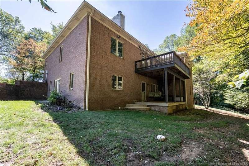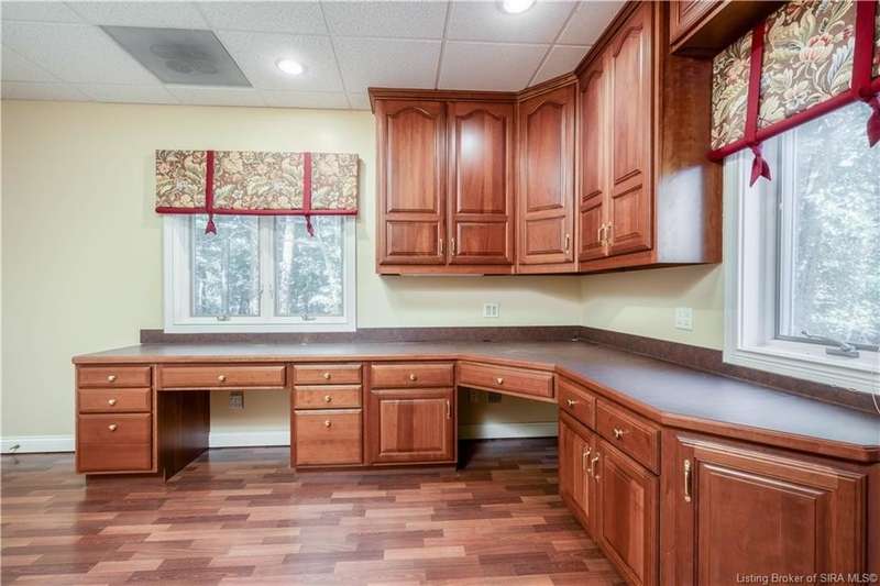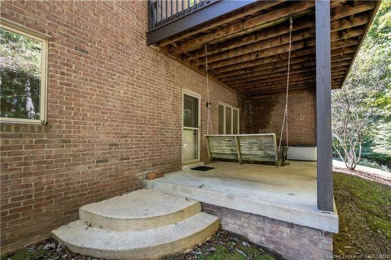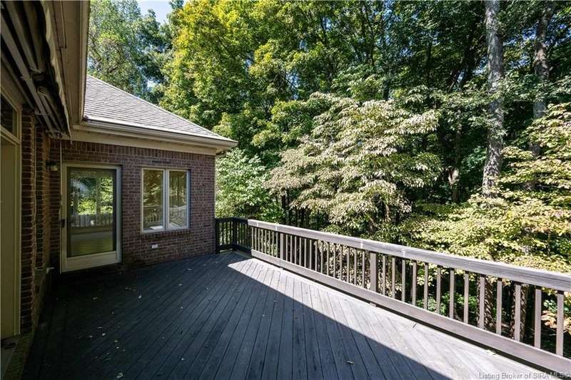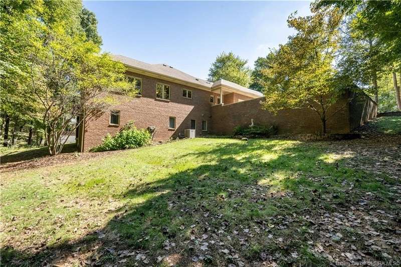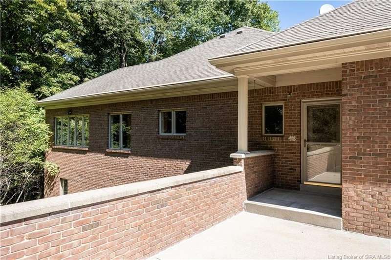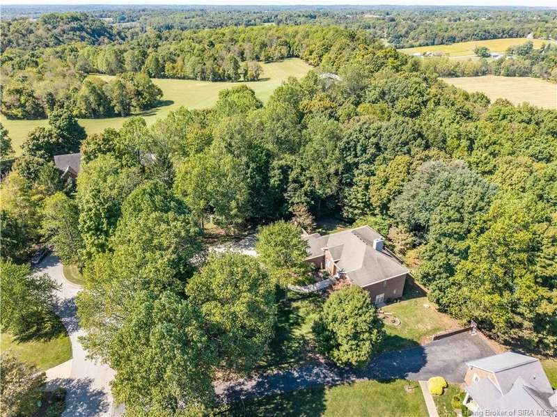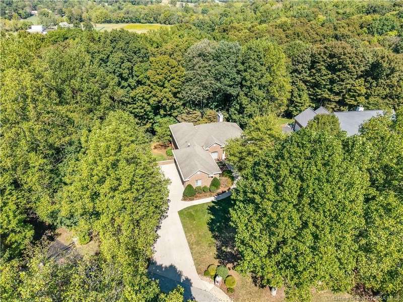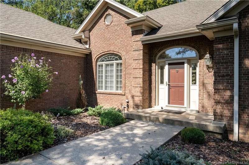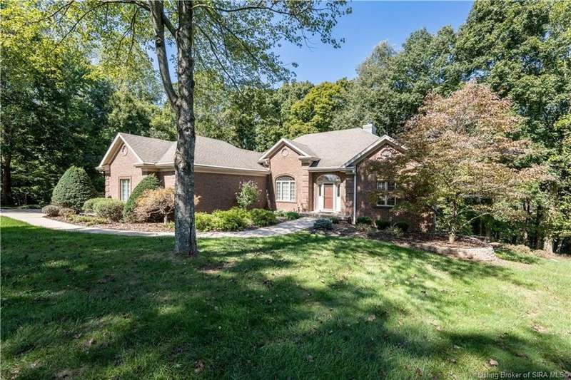 CUSTOM BUILT home sitting on a secluded 3.9 acre lot in the desirable BENT CREEK SUBDIVISION in Floyds Knobs! Tucked back at the end of Bent Creek on a cul-de-sac lot, this 4 bedroom 3 bath ranch offers a full, rear walkout lower level with a second kitchen and laundry hookups, which could make an additional living quarters or great space for guests. Custom features in this one owner home built by Gary Longest, include crown molding throughout the first floor, 3/4" hardwood flooring, 2x6 walls, SUNROOM off the 20'x16' kitchen featuring a large island with prep sink, granite countertops, and dining area, great room highlighted by built-ins, gas fireplace and surround sound speakers with French doors leading to the private deck, central vac, security system, and safe room under the front porch. Spacious primary bedroom suite offers an air jetted tub, separate shower, double vanity, and 2 walk-in closets! The walkout lower level has it all- 3 bedrooms, full bath, dedicated office with a built-in desk/cabinets, 9' ceilings, fully equipped kitchen, woodburning brick fireplace, and a finished workshop that could also be used for additional storage space. The 26' wide garage gives you a little extra room, and there is a nice area off the garage and exterior entrance with a laundry room, ½ bath, pantry, and coat closet. This is a great opportunity to own a quality-built home sitting on a 4 acre lot in Floyd Central School District and only minutes to Floyds Knobs Elementary!