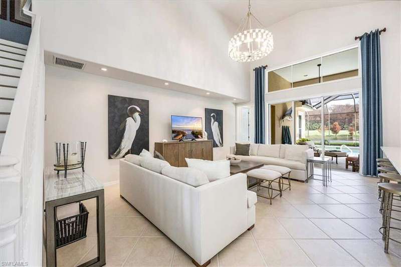 FULL GOLF MEMBERSHIP TRANSFERABLE FOR RENTAL! Location, location, location with just a short walk to the newly renovated Twin Eagles Clubhouse and Golf Course. This beautiful home was renovated in 2024 with Amish Custom Cabinetry, Cambria Quartz Countertops, new appliances, entertainment bar with beverage refrigerator and ice machine. Located in the desirable Bramble Pointe of Twin Eagles and situated overlooking The Eagle First Hole, with serene views of the lake and golf course. Upon entering this 3 bedroom plus den pool home you will find an open floor plan, detailed millwork, crown molding, plantation shutters and decorative touches throughout. The first-floor primary suite is complete with a California Closet System, a spacious bedroom and separate tub and shower. Upstairs you will find the oversized loft area, 2 guest bedrooms and a full bathroom. The outside lanai space is great for entertaining and the views from the pool are spectacular. There are motorized storm shutters for the front entry way and the back Lanai. Twin Eagles is a private 36 hole golf community with 2 Championship Golf Courses- The Talon Course designed by the Nicklaus Group andThe Eagle Course designed by Steve Smyers. Amenities also include bocce courts, Himalayan putting green, Fitness Center, Tennis, resort style pool and tiki bar.