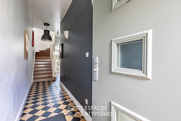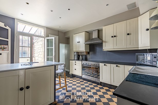 All with beautiful volumes and pleasant exteriors (terrace and garden) and two independent accesses. Well maintained and comfortable, the original materials have been preserved (cement tiles, stained glass windows, fireplace, beams) while benefiting from a modern renovation. The main house is composed as follows: on the ground floor, the entrance opens onto a large living room with an open fitted and equipped kitchen with access to the terrace and garden and a shower room.