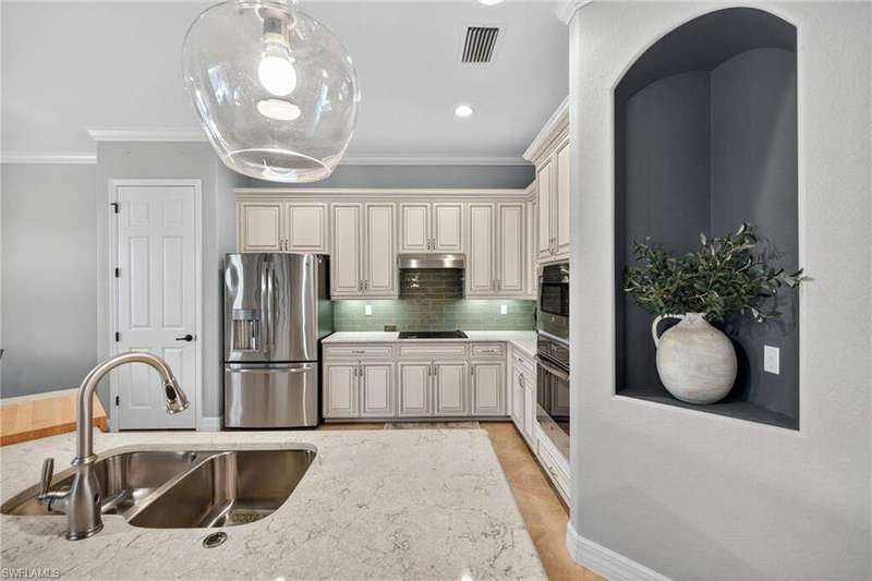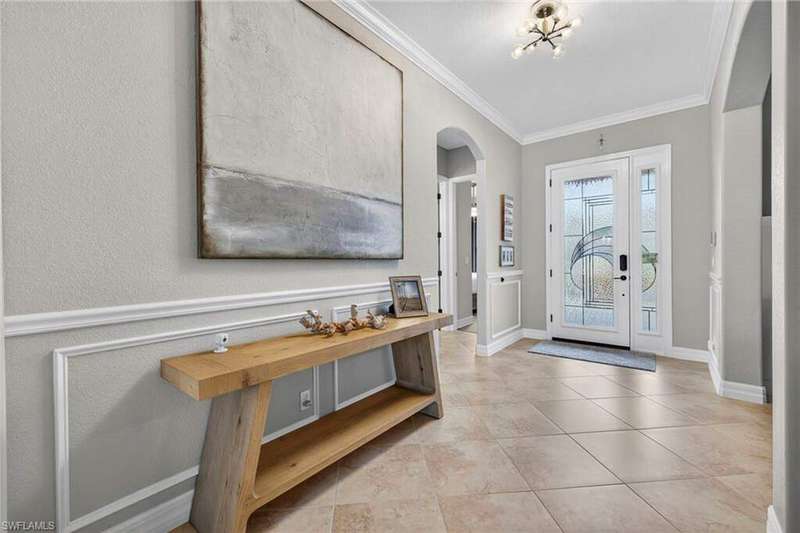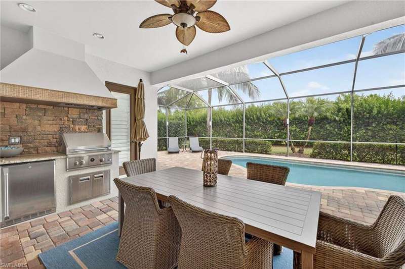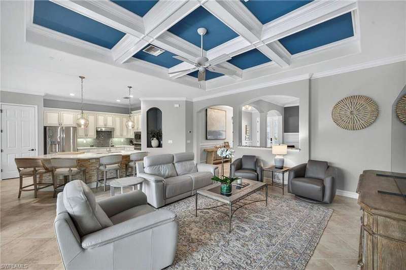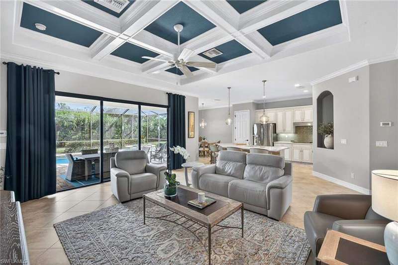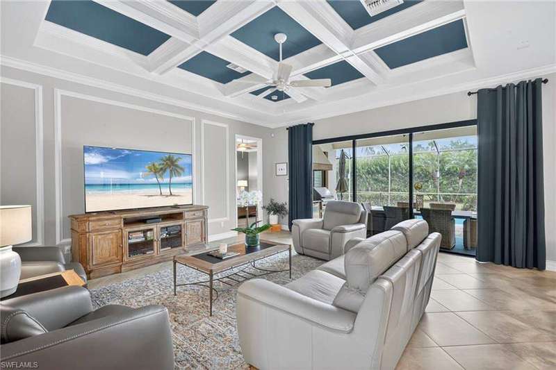From the moment you arrive, the home's inviting curb appeal and impact-resistant glass entry door set the tone for what lies beyond - a bright, open interior brimming with natural light and refined architectural touches. The entryway opens to soaring coffered ceilings, crisp wainscoting, and a welcoming layout that blends timeless design with modern sensibility. The kitchen, a true focal point of the home, features sleek white cabinetry, gleaming quartz countertops, and upgraded appliances - perfect for both everyday living and entertaining guests. The seamless transition from the indoor living area to the outdoor oasis through wide glass sliders creates the ideal Florida flow. Outside, a private retreat awaits. The screened lanai is complete with a built-in outdoor kitchen, a sparkling pool, and a rejuvenating spa - all framed by lush tropical landscaping for privacy and tranquility. Whether hosting friends for cocktails or enjoying a quiet evening under the stars, this is the ultimate Naples lifestyle setting. As part of Treviso Bay's coveted social membership, residents enjoy access to the exclusive Villa Rilassare club, offering a resort-style lagoon pool, lap pool, poolside restaurant and bar, luxurious spa, fitness center, and courts for tennis, pickleball, and bocce. The TPC golf clubhouse provides additional dining, events, and community gatherings that make Treviso Bay one of Naples' most sought-after communities. Located just five miles from Naples' renowned white-sand beaches and the upscale shopping and dining of Fifth Avenue South, this exceptional property combines comfort, elegance, and an unbeatable location. It's more than a home - it's your private piece of paradise.