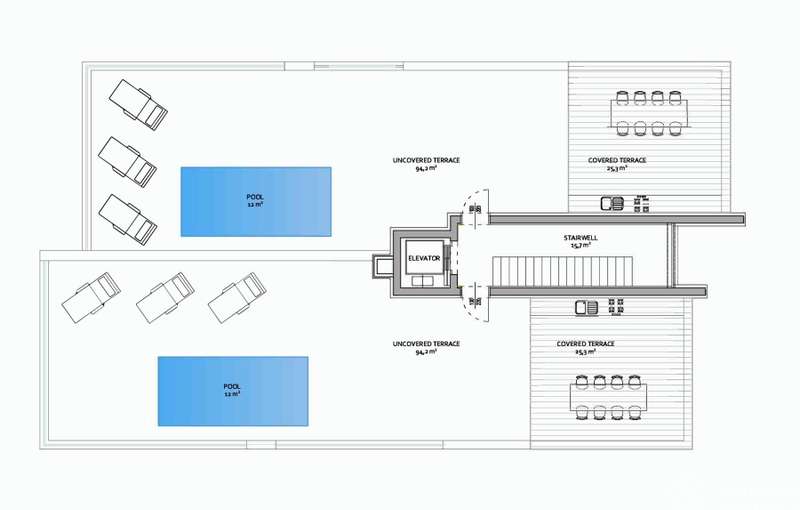 Each rooftop offers 120 m2 of pure luxury with jacuzzi, summer kitchen, outdoor bathroom, and lounge and dining areas under a bioclimatic pergola. It is the perfect setting for magical sunsets over the Adriatic.