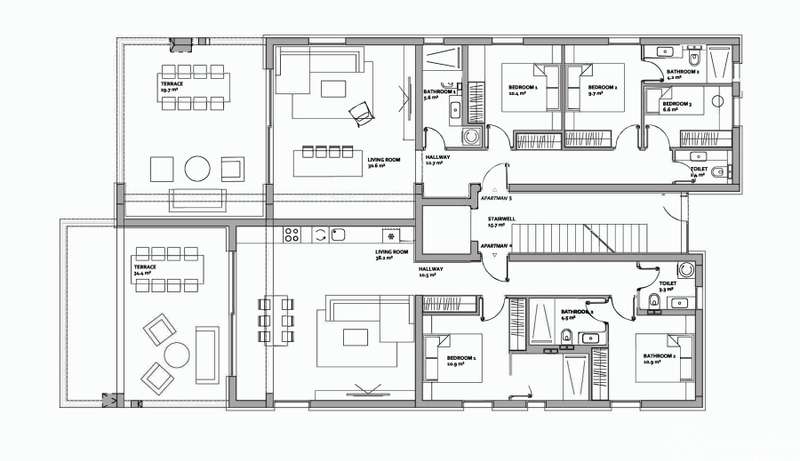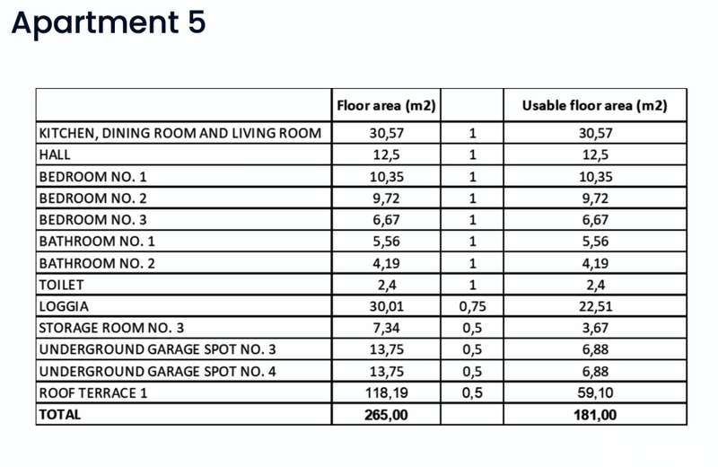 Apartment S-5 - 2nd floor - living area 81.96 m2 (3 bedrooms + 2 bathrooms + WC) + loggia (30 m2) + rooftop terrace (118 m2) + storage (7.34 m2) + two garage parking spaces no. 3 and 4; net calculated area 181.00 m2 = 1,556,449.50 EUR