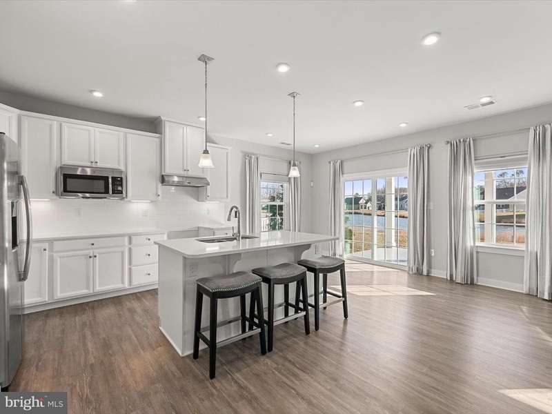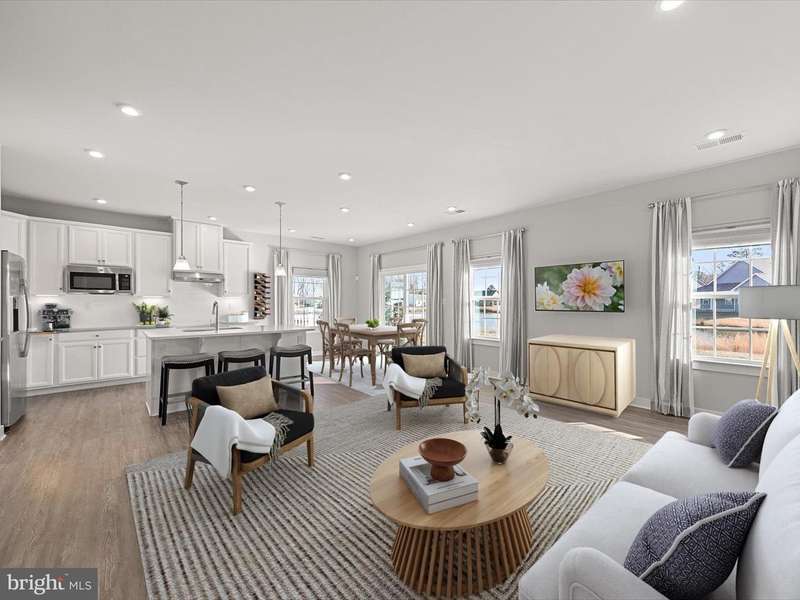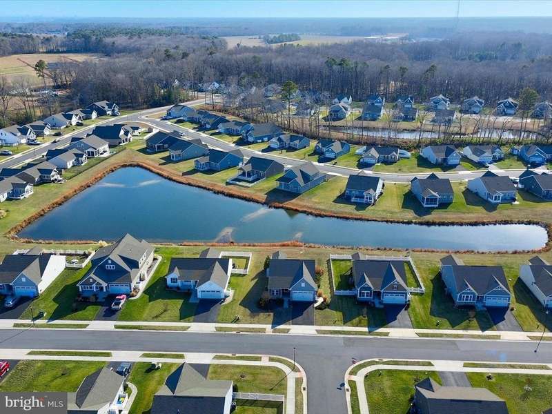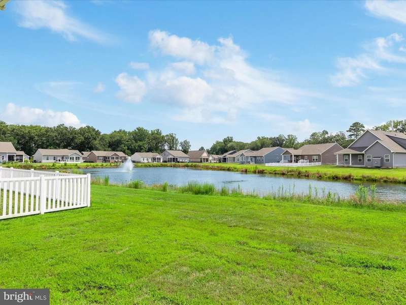 This stunning former model home, built in 2020, is perfectly positioned on a tranquil pond in the sought-after Fox Haven community. Offering low HOA fees and the convenience of on-site RV and boat storage for a minimal fee, this community provides an exceptional coastal lifestyle. Located in Frankford, it is just minutes from Route 54, Harris Teeter in Bayside, the Freeman Arts Pavilion, Fenwick Island's pristine beaches, Ocean City, and an array of superb dining options. Designed for both entertaining and everyday comfort, this one-level home boasts an inviting open-concept layout. At the heart of the home is a gourmet kitchen, featuring sleek quartz countertops, an expansive island with pendant lighting, a classic subway tile backsplash, and a pantry for ample storage. The adjacent dining area enhances the home's charm, making it perfect for gatherings and special occasions. A wall of glass sliding doors leads to a covered patio with a stylish epoxy finish, stepping down to a beautifully designed paver patio-ideal for relaxing and enjoying the peaceful pond views. Throughout the main living area, stylish designer window treatments complement durable LVP flooring, while recessed lighting and a neutral color palette add warmth and sophistication. The private primary suite offers a spacious walk-in closet, a dual-sink vanity, and a stall shower. Two additional bedrooms at the front of the home provide generous space for family or guests. Additional highlights include a Nest thermostat, a two-car garage with an epoxy-coated floor, a dedicated storage area, and a convenient side entry door. Fox Haven's resort-style amenities, including a community pool, clubhouse, and fitness room, further enhance its appeal. With plenty of storage and a perfect blend of style and convenience, this exceptional home offers modern coastal living at its best, just a short drive to Fenwick Island, Ocean City, the Freeman Arts Pavilion, and local shopping and dining.