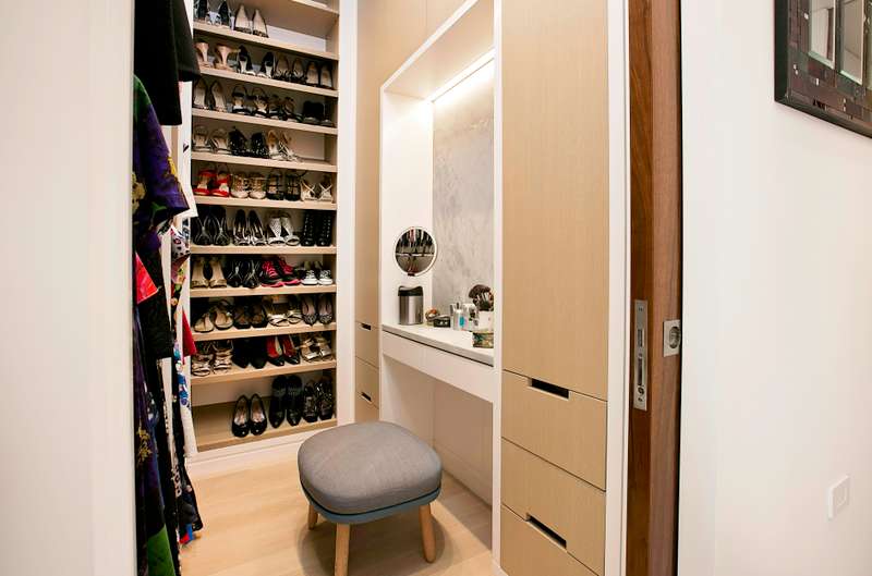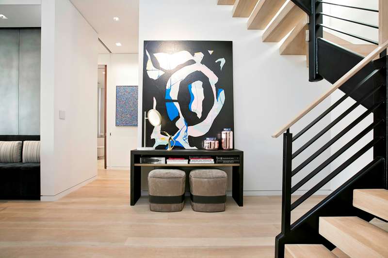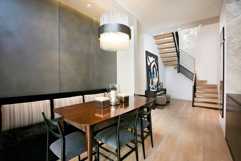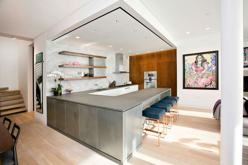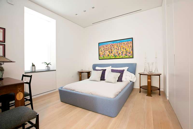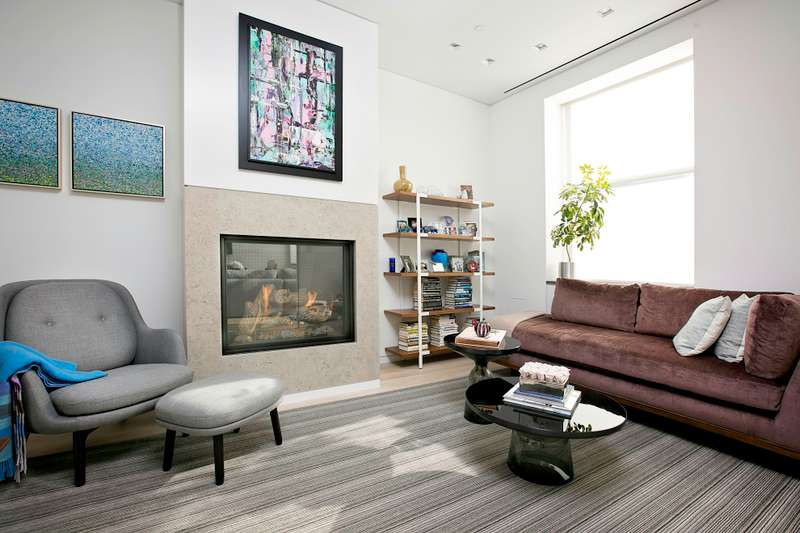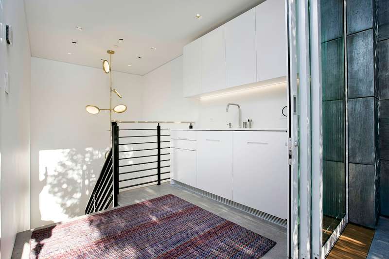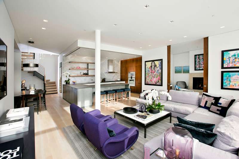 The public areas have an open-plan living room and kitchen as well as a cleverly designed dining area with easy access to the oversized open kitchen. The kitchen itself is publication-worthy, with exposed shelving on a light stone wall and a top-of-the-line appliance package from Gaggenau. Past the living room is the entrance to the library, which has a fireplace and a full en-suite bath, making it an excellent guest room.