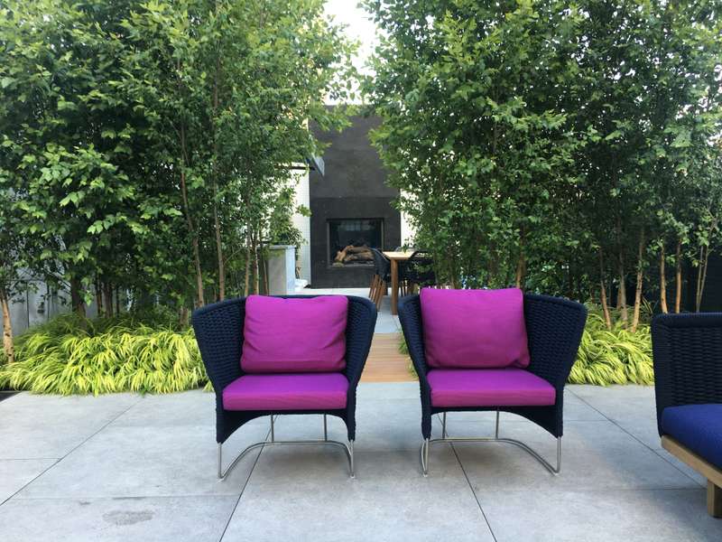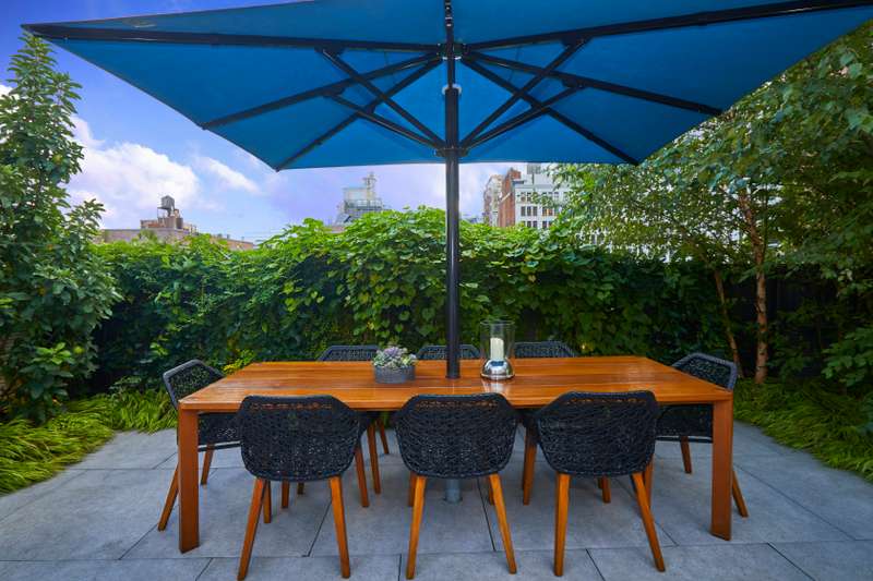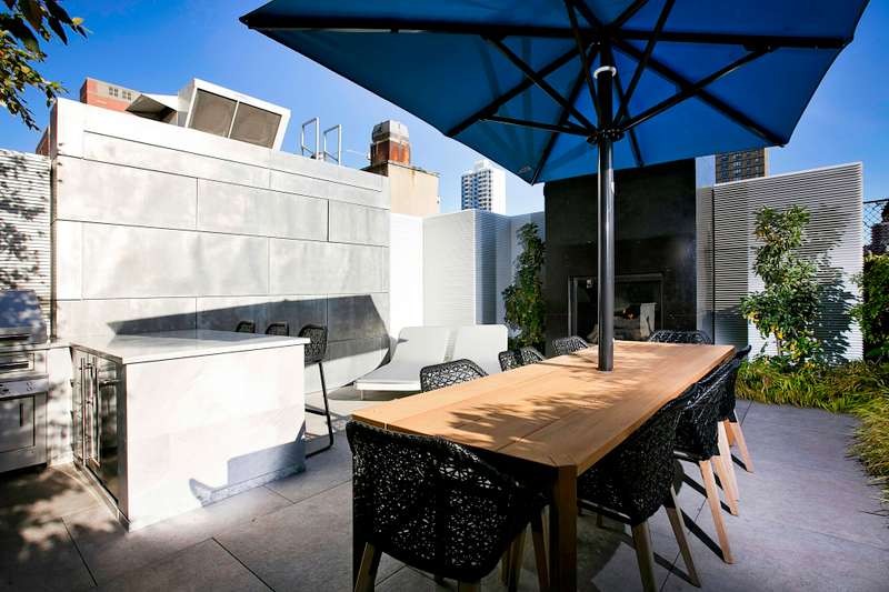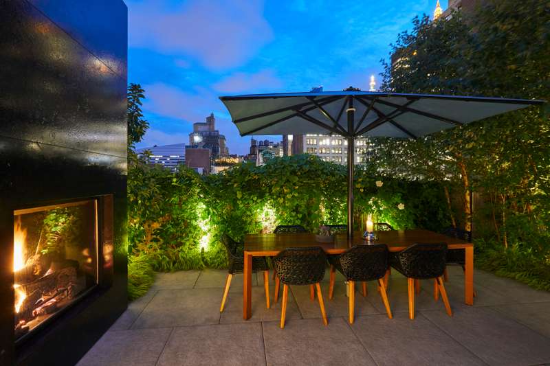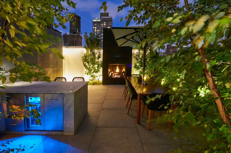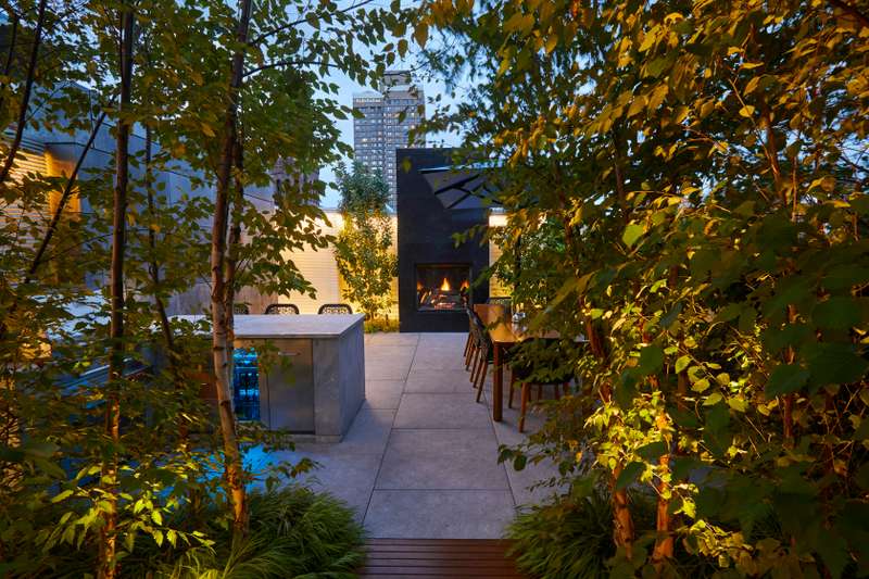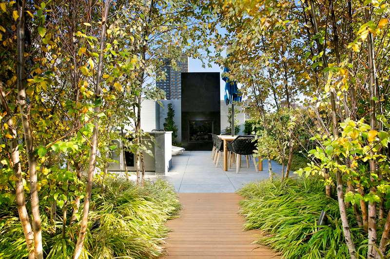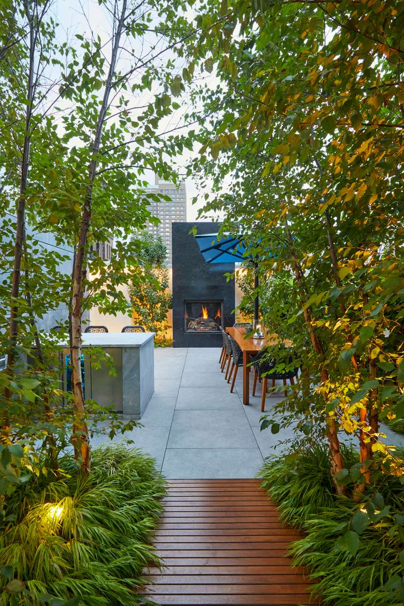 At 1288sf, it is not the largest, but it does top the list in versatility, thanks to its many amenities. There are two distinct areas for dining and relaxing, separated by a pathway right through a "forest" of 16 birches. This pathway through the birches exemplifies the detail that has gone into every aspect of this rooftop oasis: It hides some of the 30 speakers throughout, and the entire terrace was raised so these trees are planted level with the pathway.