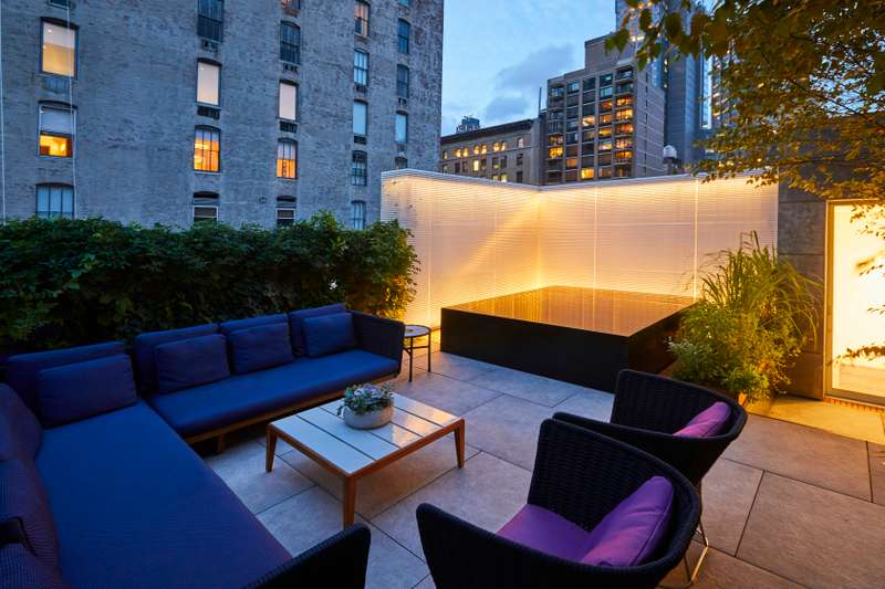 - Plenty of privacy: This oasis is surrounded by a 4' high green "hedge," which provides perfect privacy without diminishing the open feel. Edmund Hollander designed the entire plant palette mainly using native species that can withstand the changing New York seasons; Japanese White Pine, together with bayberry, holly, hydrangea, and clematis, as well as lavender and rosemary, make for a hardy planting with varied texture and color.