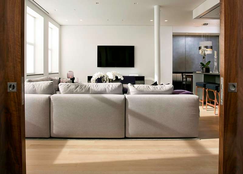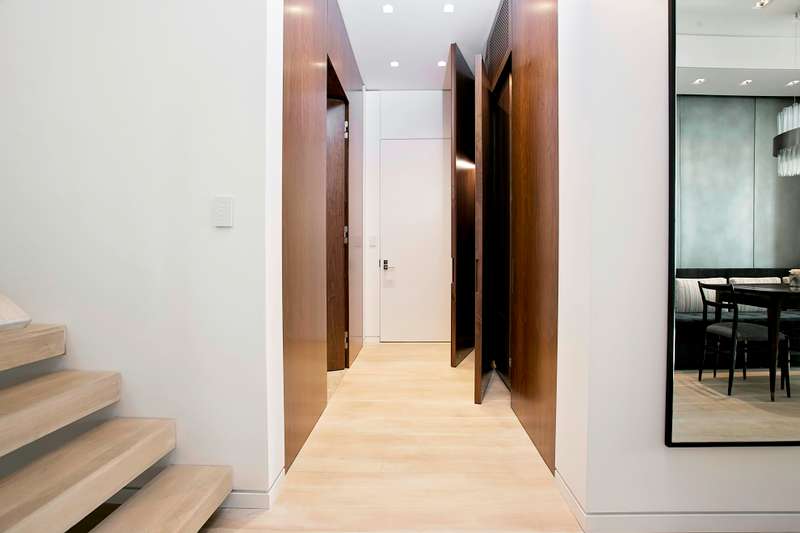 This apartment's interior is as stunning as the terrace, and the attention to detail remains unsurpassed. At just shy of 2100sf with 10" ft ceilings throughout, the apartment is a comfortably sized three-bedroom, three-bath home. You enter the home through a generous hallway leading to a double-high foyer. The walnut-lined walls of the hallway cleverly hide large closets, laundry, and a full bath. The foyer gives access to the "stairway to Heaven" and the private and public areas of this penthouse.