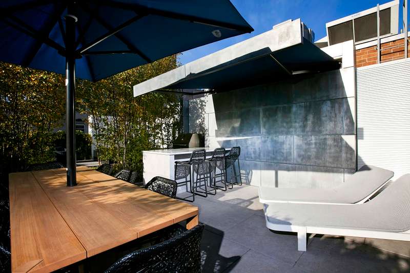 - Plenty of shade: The dining and relaxing areas are both covered by custom-made German umbrellas anchored to the sub-framing and specifically engineered to handle high wind velocities, While the summer kitchen can be covered by a remote-controlled retractable awning that completely disappears in the zinc-clad wall when not in use.