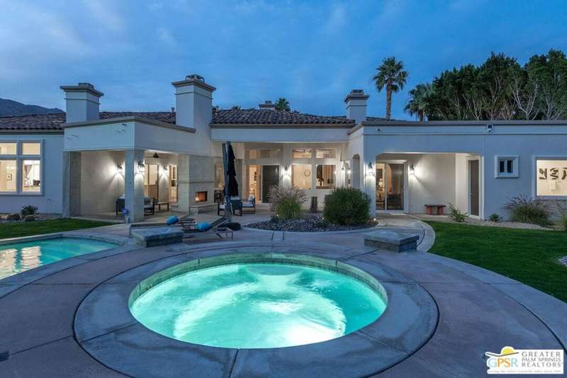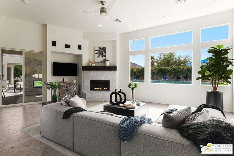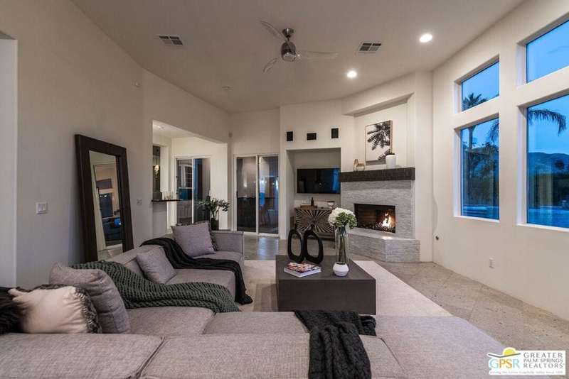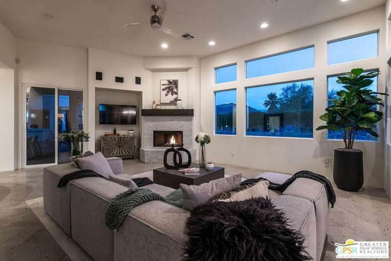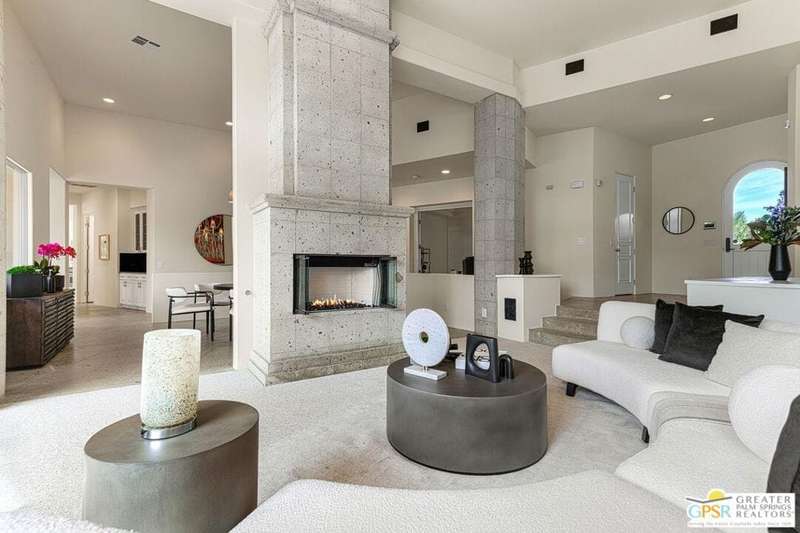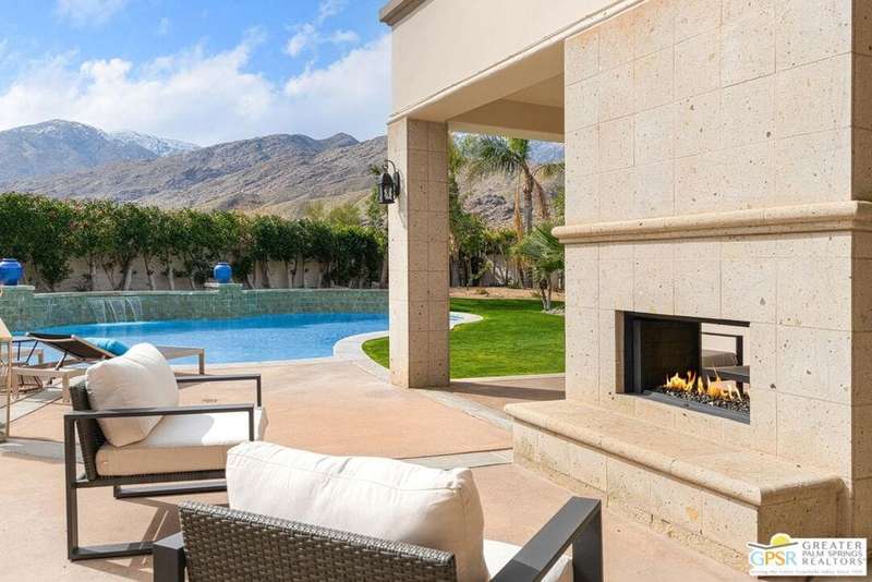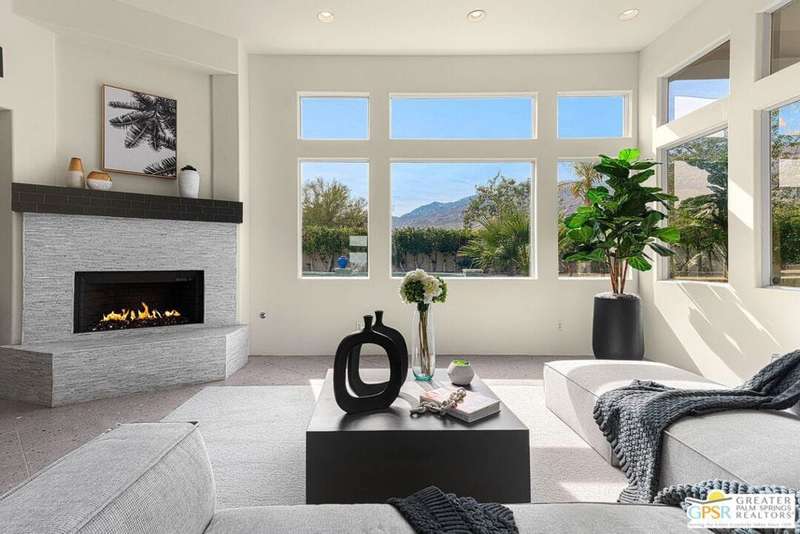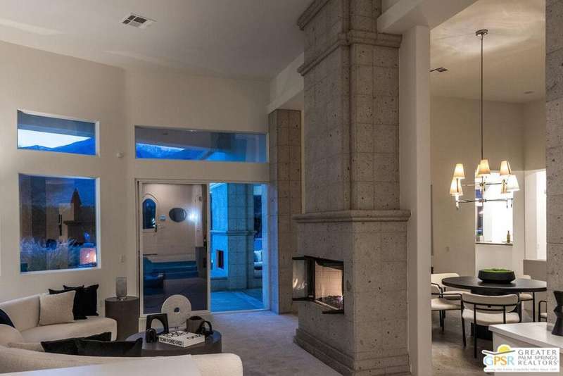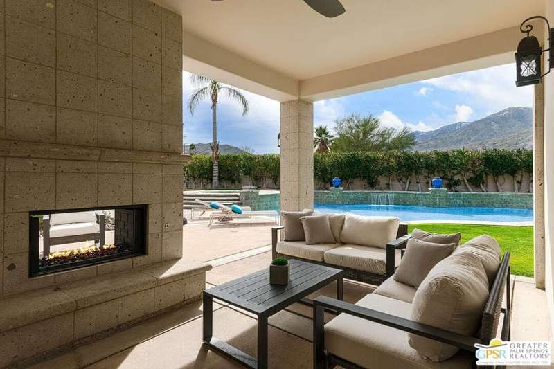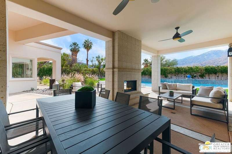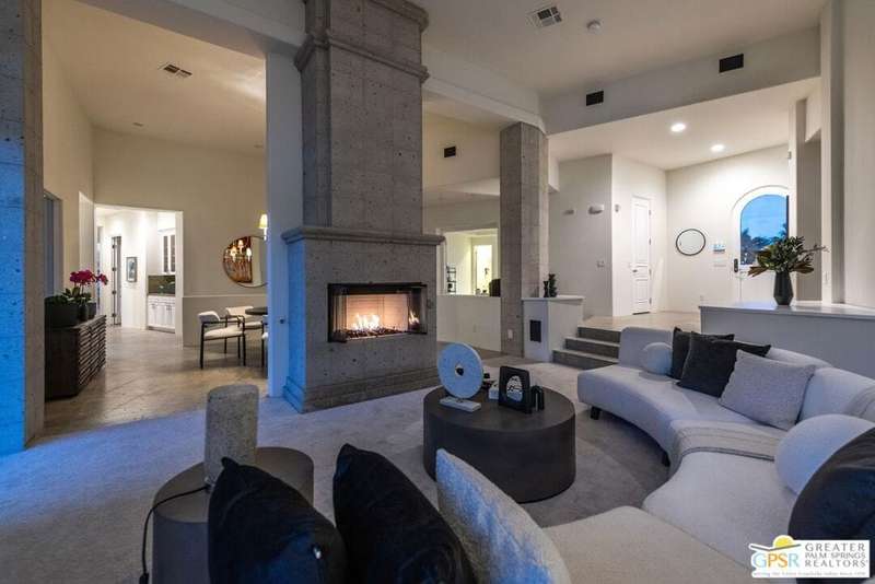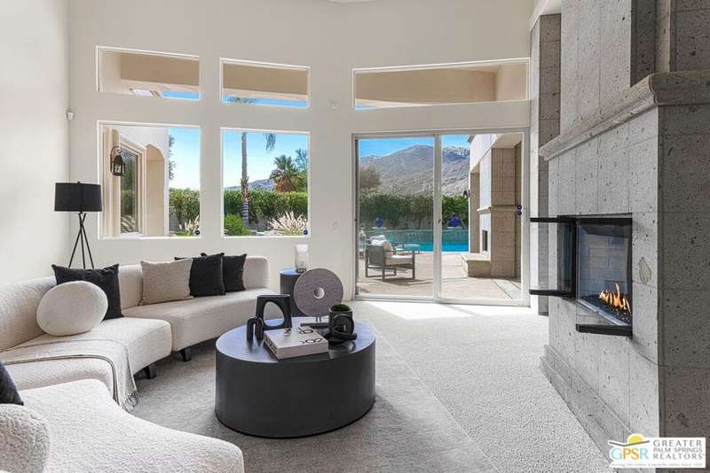 Imagine stepping inside the villa at 64395 Via Risso at Bella Monte in South Palm Springs where sophisticated luxury meets warm and inviting spaces. The interior boasts three elegant fireplaces that serve as the heart of the home with four bedroom suites and six baths. Whether you're gathered in the grand living room, the cozy family room, or the intimate formal dining area, the flicker of the fireplace adds a touch of magic to every moment .The architectural symmetry extends beyond the interior, with a stunning double-sided exterior fireplace that anchors an outdoor living area designed for the ultimate in entertainment and relaxation. Here, the seamless transition from inside to outside living is exemplified by the expansive pool and spa, perfect for soaking up the sun or enjoying the starry Palm Springs nights. The poolside vignettes invite you to lounge, dine al fresco, or simply revel in the panoramic mountain views that encompass the property. Each space within this villa has been thoughtfully crafted to maximize the enjoyment of the surrounding beauty. Property has 45-owned solar panels. Large windows and sliding glass doors ensure that every room is a vantage point for the breathtaking vistas. With multiple vignettes inside, residents and guests can find their own perfect spot to relax, engage in conversation, or indulge in quiet reflection, all while enveloped by the villa's serene atmosphere and the picturesque landscape that defines South Palm Springs living.