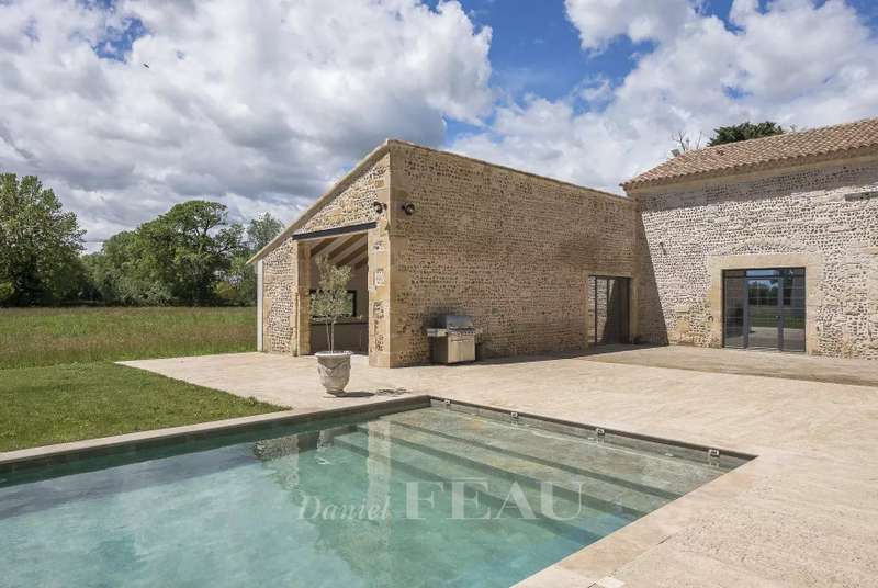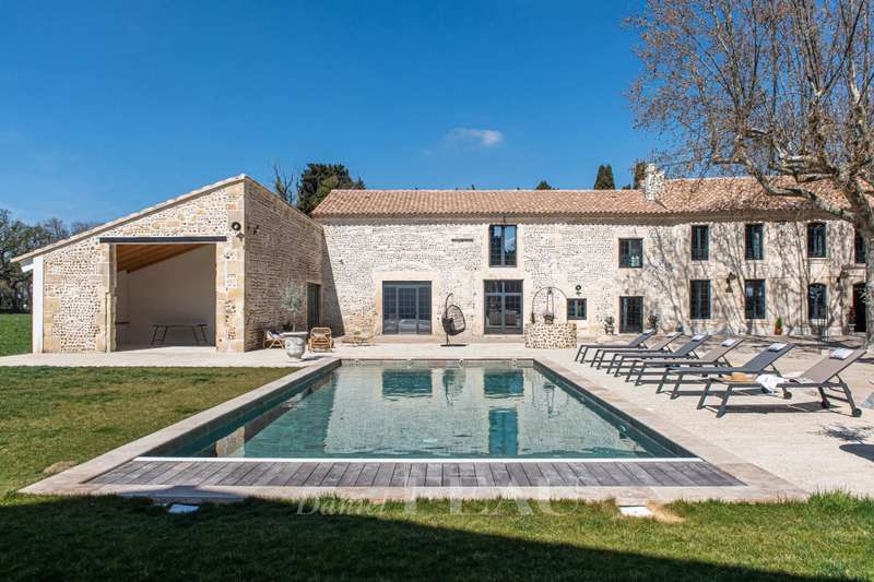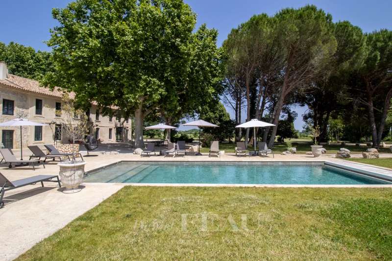 This superb property nestled in the heart of the Alpilles is set in 8,5 peaceful hectares. Commanding an open view over the surrounding natural environment, it offers a total of 1100 sqm of floor space including a magnificent 450 sqm “mas provençal”. Oozing with period charm and authenticity, this includes a living/reception room, a second over 50 sqm living room/TV lounge, a spacious fully equipped kitchen, a bright dining room featuring a Louis XIV style stone fireplace, and five bedrooms including 4 suites with bathrooms and separate wc. 200 sqm of further living space remains to be fitted as desired. The property also includes a heated 10 x 5 metre heated swimming pool with a motorised shutter, a 160 sqm pool house, and a 320 sqm convertible barn. Ideal for a seasonal rental and/or function activity.