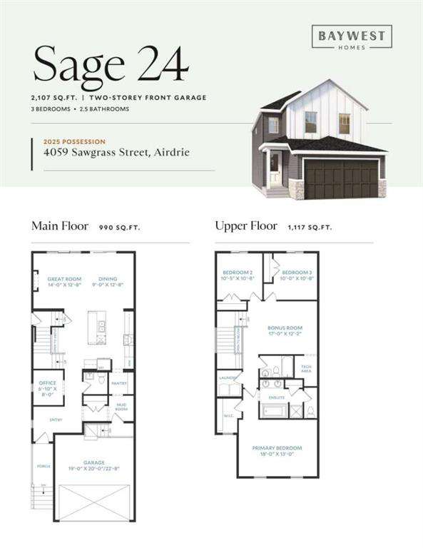 MASSIVE PRICE IMPROVEMENT!! Introducing THE SAGE—offering 3 BEDROOMS, 2.5 BATHROOMS, and a main-floor office, ideal for working from home or creating a quiet study space. Set on a generous 3,670 SQ.FT. lot with a west-facing backyard, this home provides the perfect blend of functionality, style, and comfort. The estimated move-in is before the end of 2025, so you can move in before the holidays. Built by BAYWEST HOMES, renowned for quality and craftsmanship since 1985, The Sage is engineered for durability with innovative design and comes with a 10-YEAR ALBERTA NEW HOME WARRANTY plus a one-year builder warranty for your peace of mind. Step inside to a welcoming foyer leading into a main-floor office space, perfect for a private study or home office. The heart of the home features a show-stopping kitchen complete with 42-inch cabinets with crown molding and under cabinet lighting, upgraded appliances, a built-in microwave, gas range, and a chimney-style range hood with elegant tile that extends to the ceiling. The Quartz countertops and Silgranite under-mount sink are as functional as they are beautiful. You’ll also enjoy the walk-through pantry—a convenient space connecting the kitchen to the mudroom, where coats and shoes can be tucked away out of sight. The open-concept great room and dining area are designed for entertaining, with oversized windows and a sliding glass door that opens up to your West Facing backyard. The living room features a cozy fireplace and beautiful vinyl plank floors. Other upgrades you will find in this great home include 9-foot basement ceilings, a side entrance, upgraded modern railings, and triple-pane energy-efficient windows, ensuring comfort in every season. Upstairs, you’ll find a spacious bonus room—a versatile space that could be the perfect family retreat, movie room, or play area. Adjacent to this is a tech space, offering a quiet, dedicated area for study, work, or creative projects. The primary bedroom provides a relaxing haven with a large walk-in closet and an ensuite bathroom featuring a spacious shower and separate soaker tub. Two additional generously-sized bedrooms, a dedicated laundry room and a well-appointed main bathroom complete the upper floor. Ready to make your move? The Sage is waiting to become your dream home—a place where style, comfort, and functionality come together to support your lifestyle. A bit about the community - Sawgrass Park in NW Airdrie a dynamic community filled with lush green spaces, serene wetlands, and upcoming plans for a new school and recreational hubs. Developed by Hopewell, this community is designed for both relaxation and excitement, offering the perfect backdrop to build lasting memories. You will be one of the first to call this exciting new community your home! This home is currently under construction. Please contact the listing agent to arrange a showing. PLEASE NOTE THE PHOTOS ARE NOT OF THIS EXACT HOME. PHOTOS SHOW A HOME THAT IS THE SAME MODEL BUT IN ANOTHER COMMUNITY.