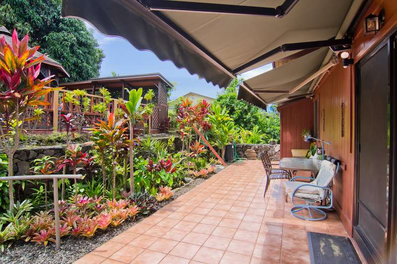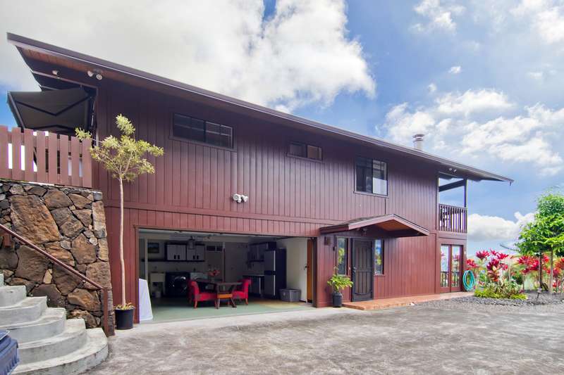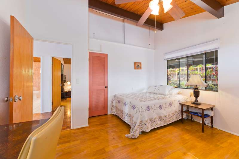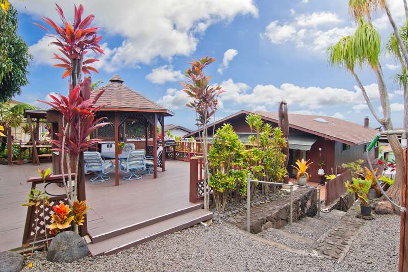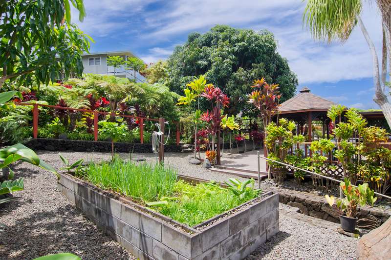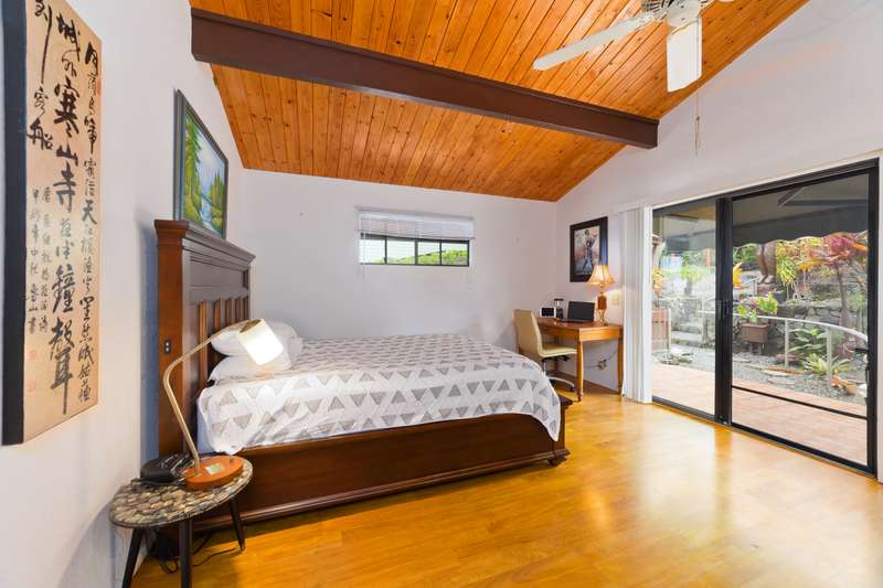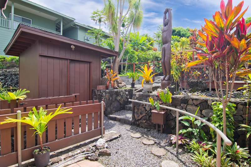 Outdoors, the beautifully landscaped grounds include terraced gardens, wide level walkways, and an abundance of tropical flora. Garden enthusiasts will appreciate the raised veggie bed and variety of edibles—papaya, mango, cacao, coffee, pineapple, and herbs—alongside ornamental and exotic flowers that will inspire the creative florist. A covered gazebo, outdoor kitchen, large tool shed, and separate entrance to the primary bedroom complete the backyard sanctuary.