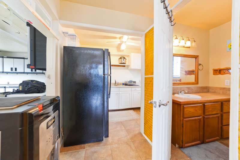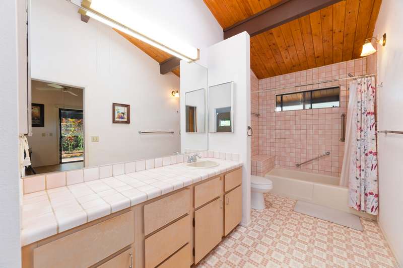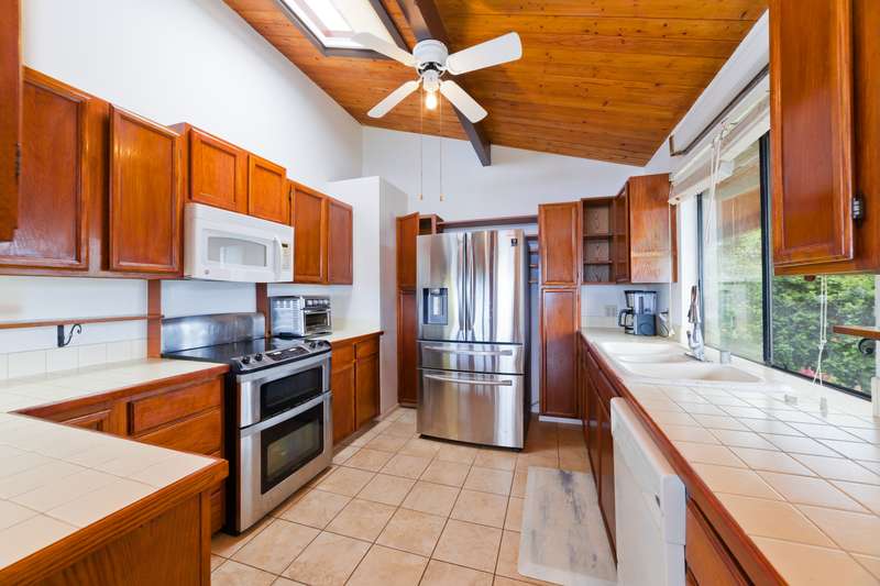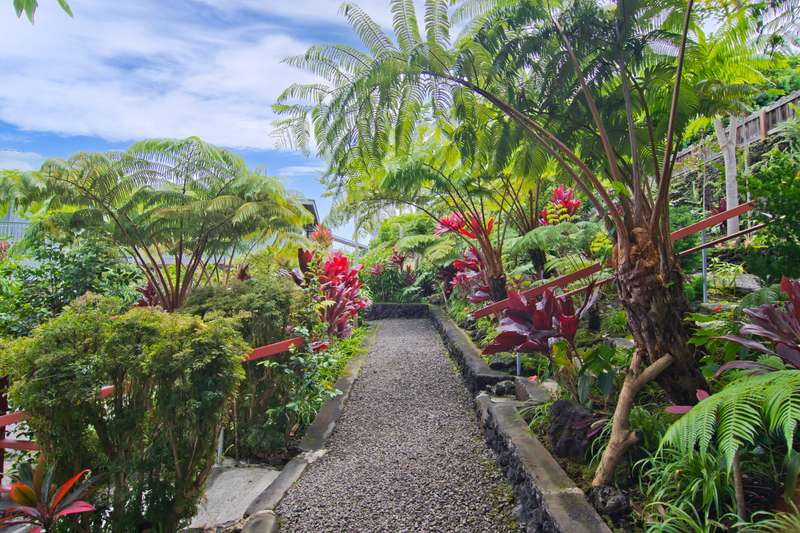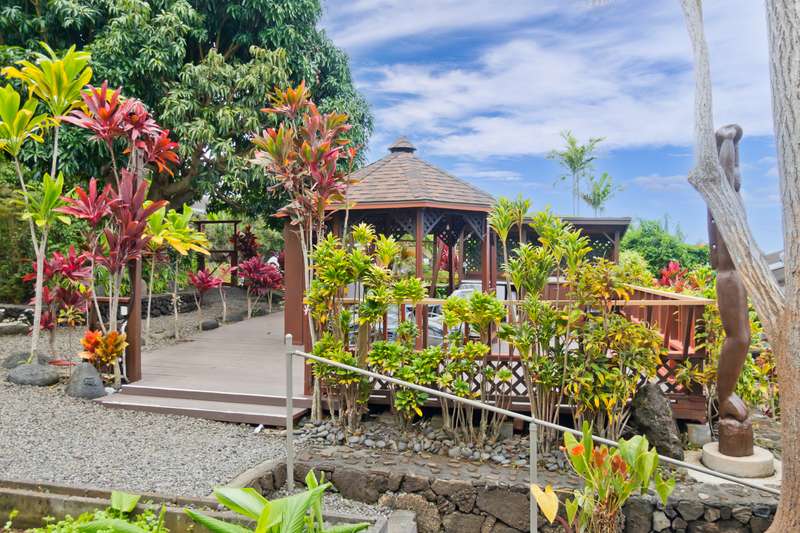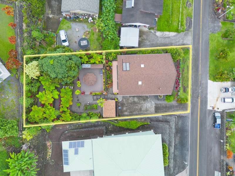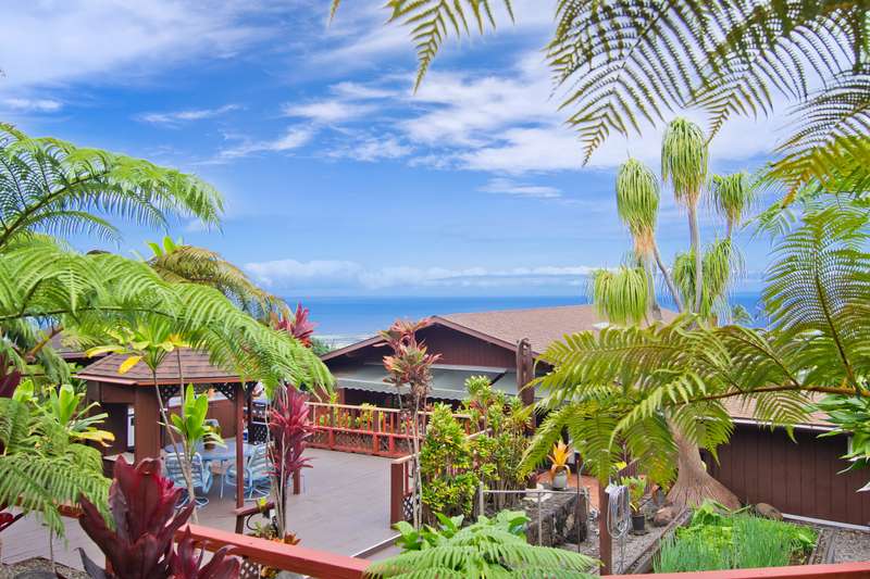 Outdoors, the beautifully landscaped grounds include terraced gardens, wide level walkways, and an abundance of tropical flora. Garden enthusiasts will appreciate the raised veggie bed and variety of edibles—papaya, mango, cacao, coffee, pineapple, and herbs—alongside ornamental and exotic flowers that will inspire the creative florist. A covered gazebo, outdoor kitchen, large tool shed, and separate entrance to the primary bedroom complete the backyard sanctuary.