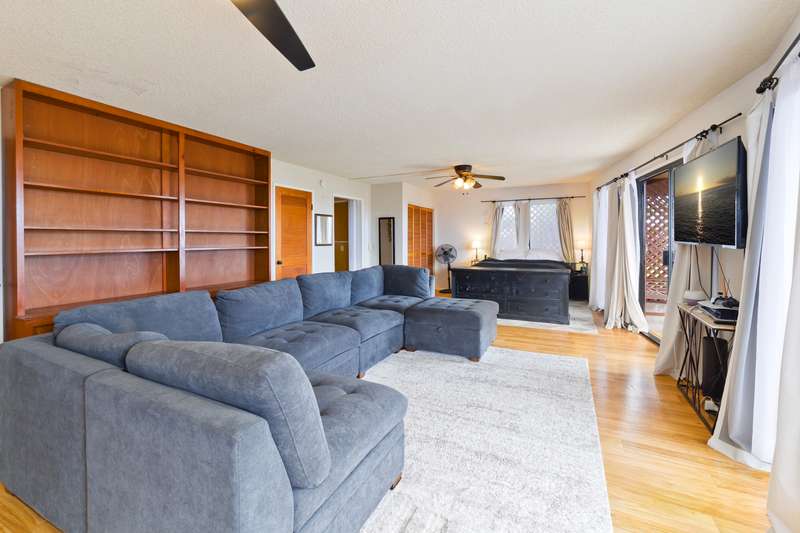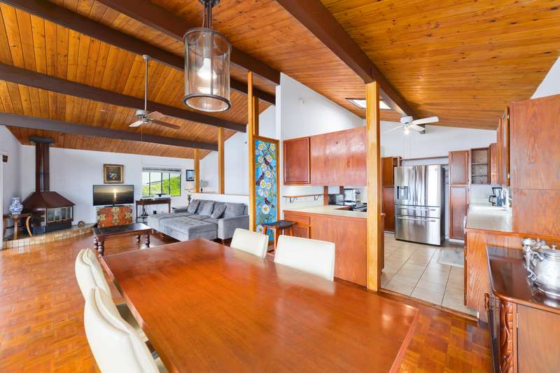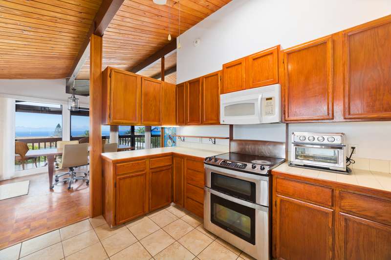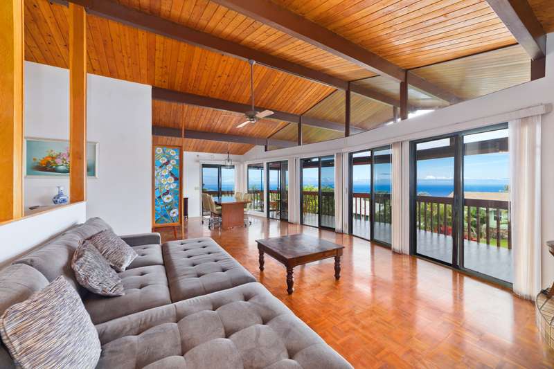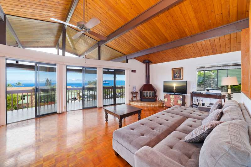 The main level features 2 bedrooms and 1 bath, with vaulted tongue-and-groove ceilings, rich parquet flooring, and a cozy fireplace for those cool winter evenings. Step out onto the expansive lanai to enjoy ocean views & breezes and year-round sunsets.